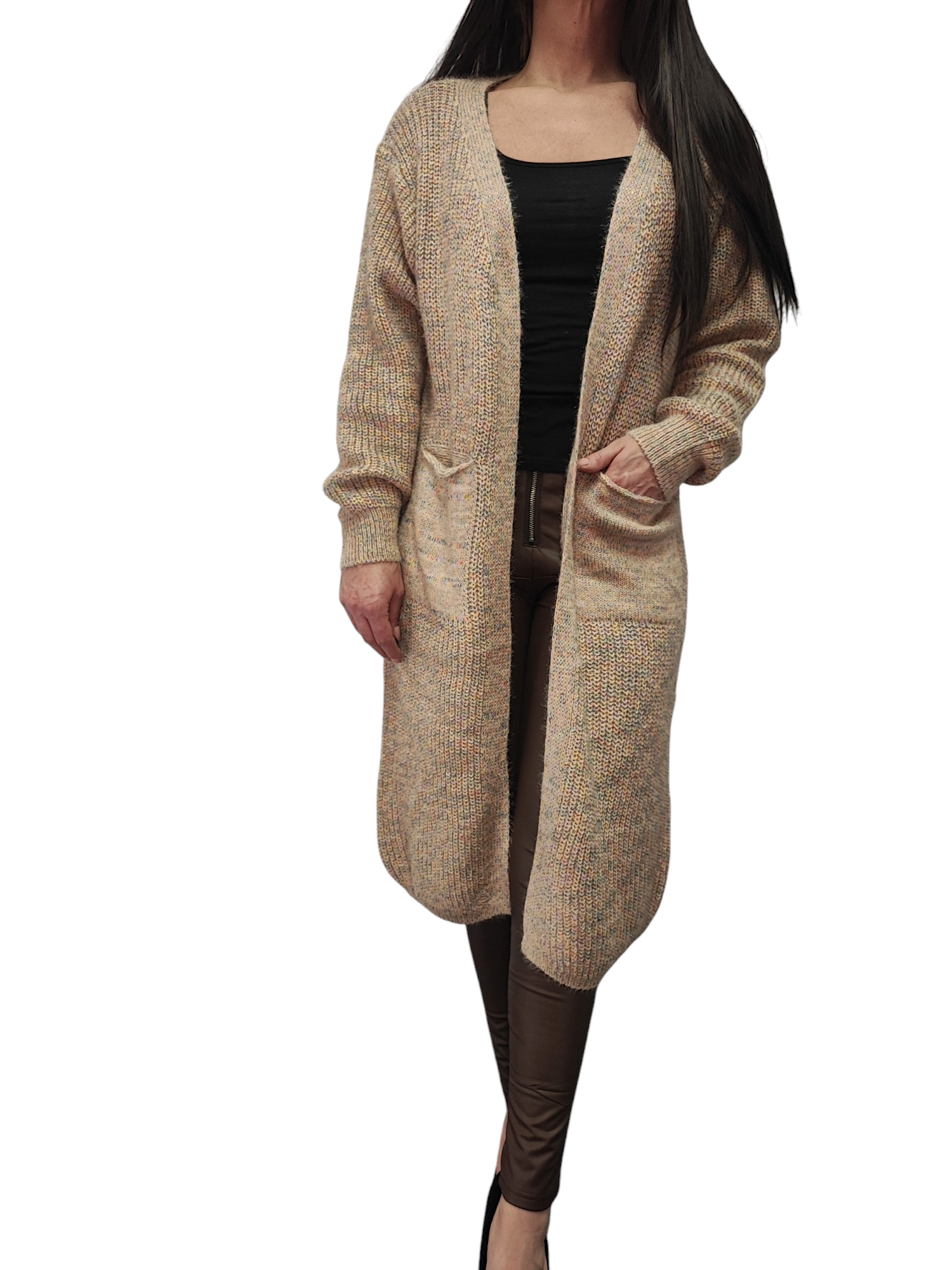 Długi sweter Kardigan Włochaty w przepięknym beżowym kolorze przeplatany kolorowymi nićmi.