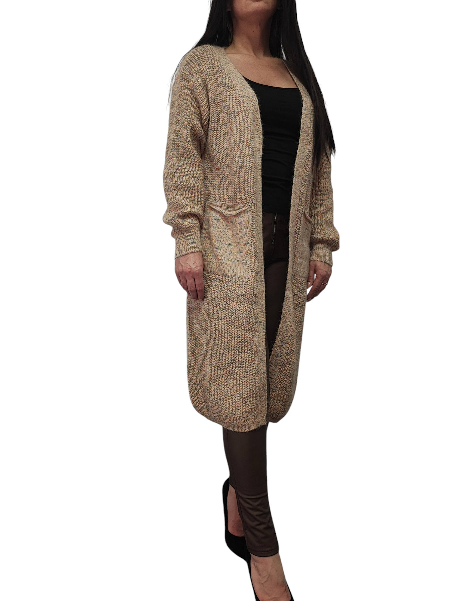 Kardigan Damski Sweter Długi Narzutka Ciepły Na Prezent Beżowy Melanż