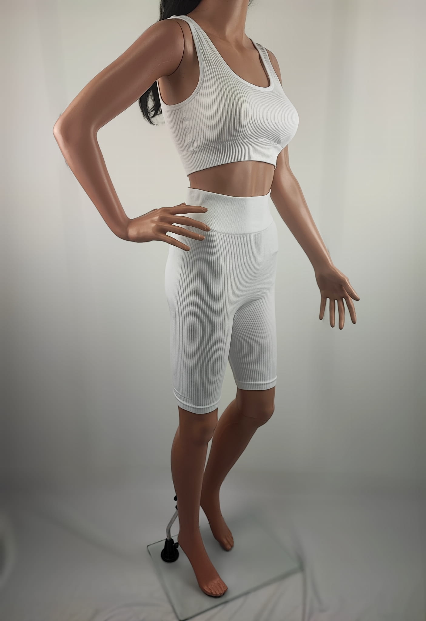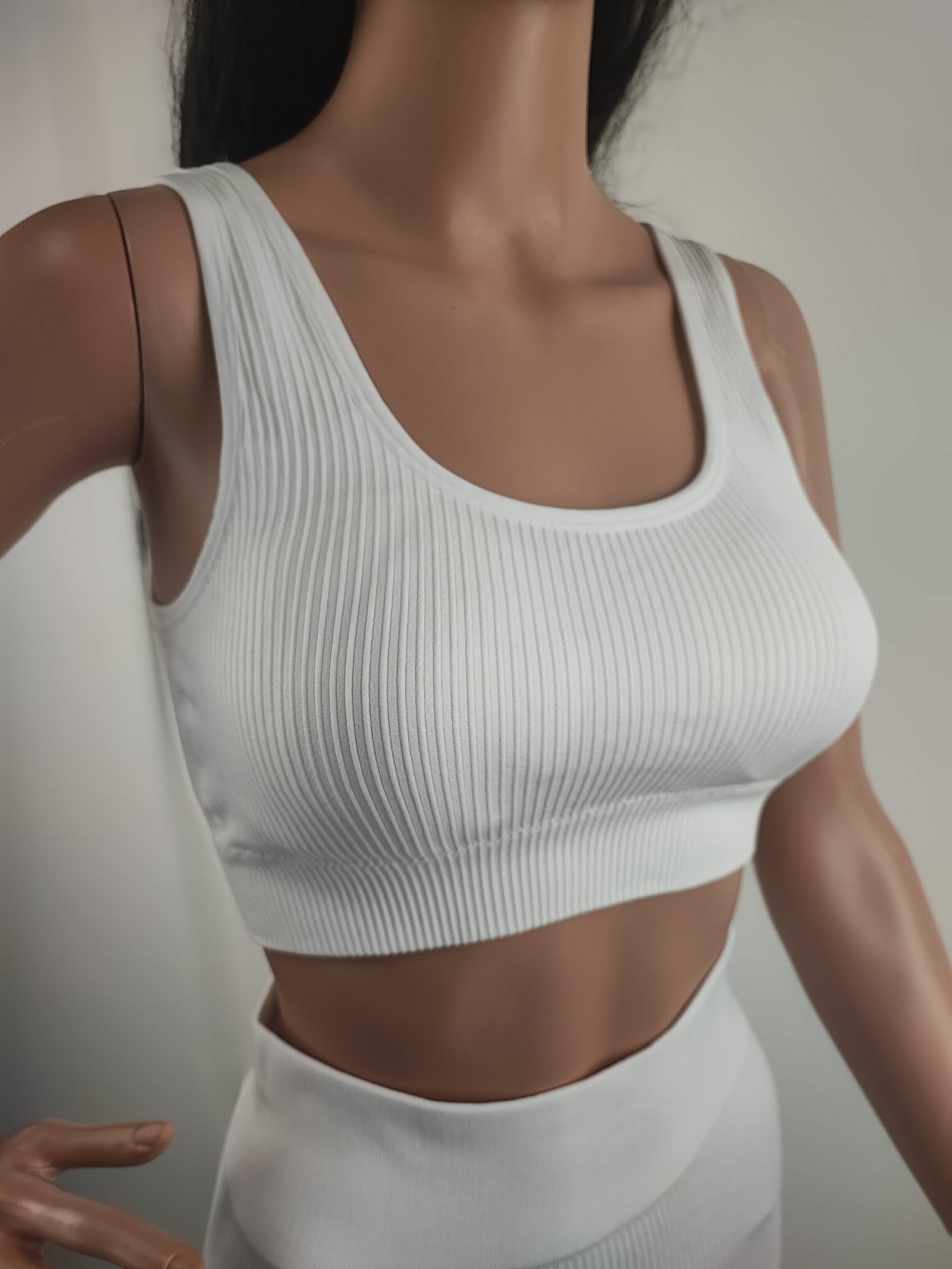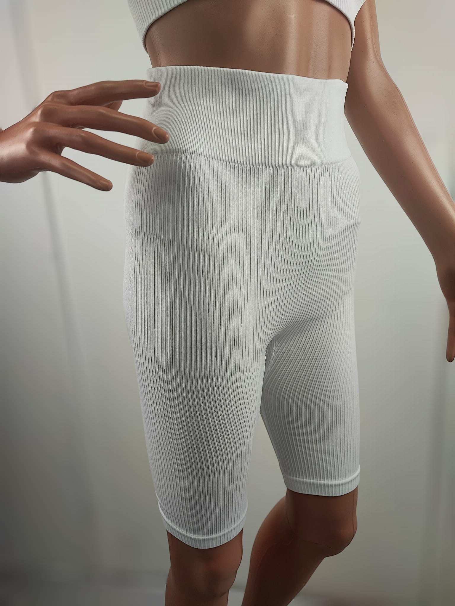 Biały prążkowany komplet: top + legginsy typu kolarki