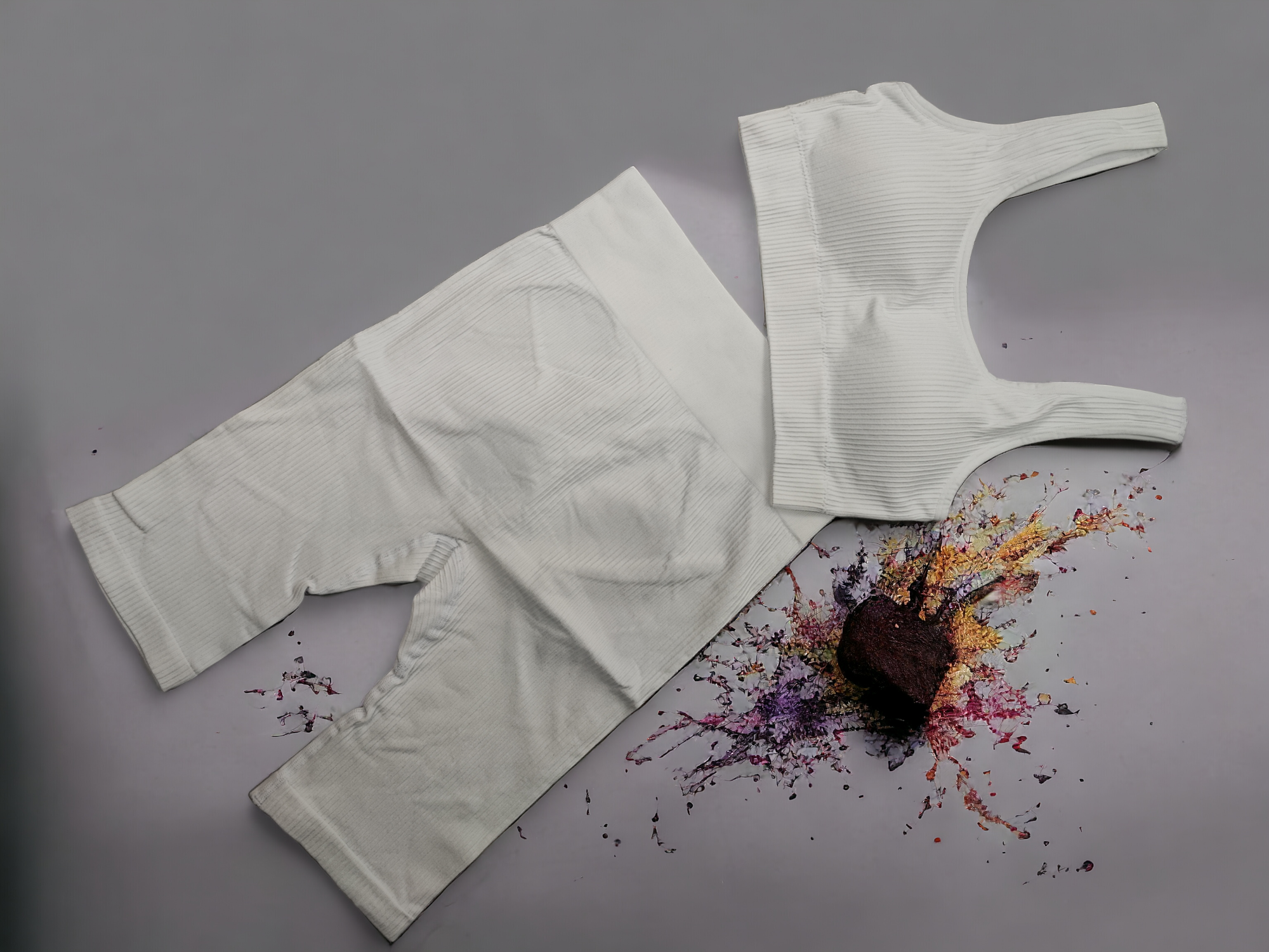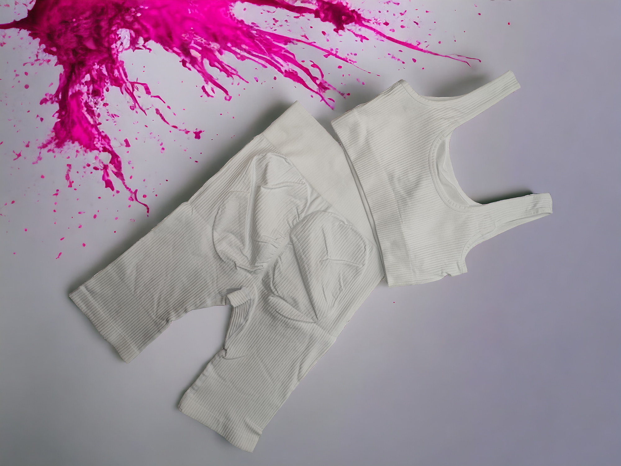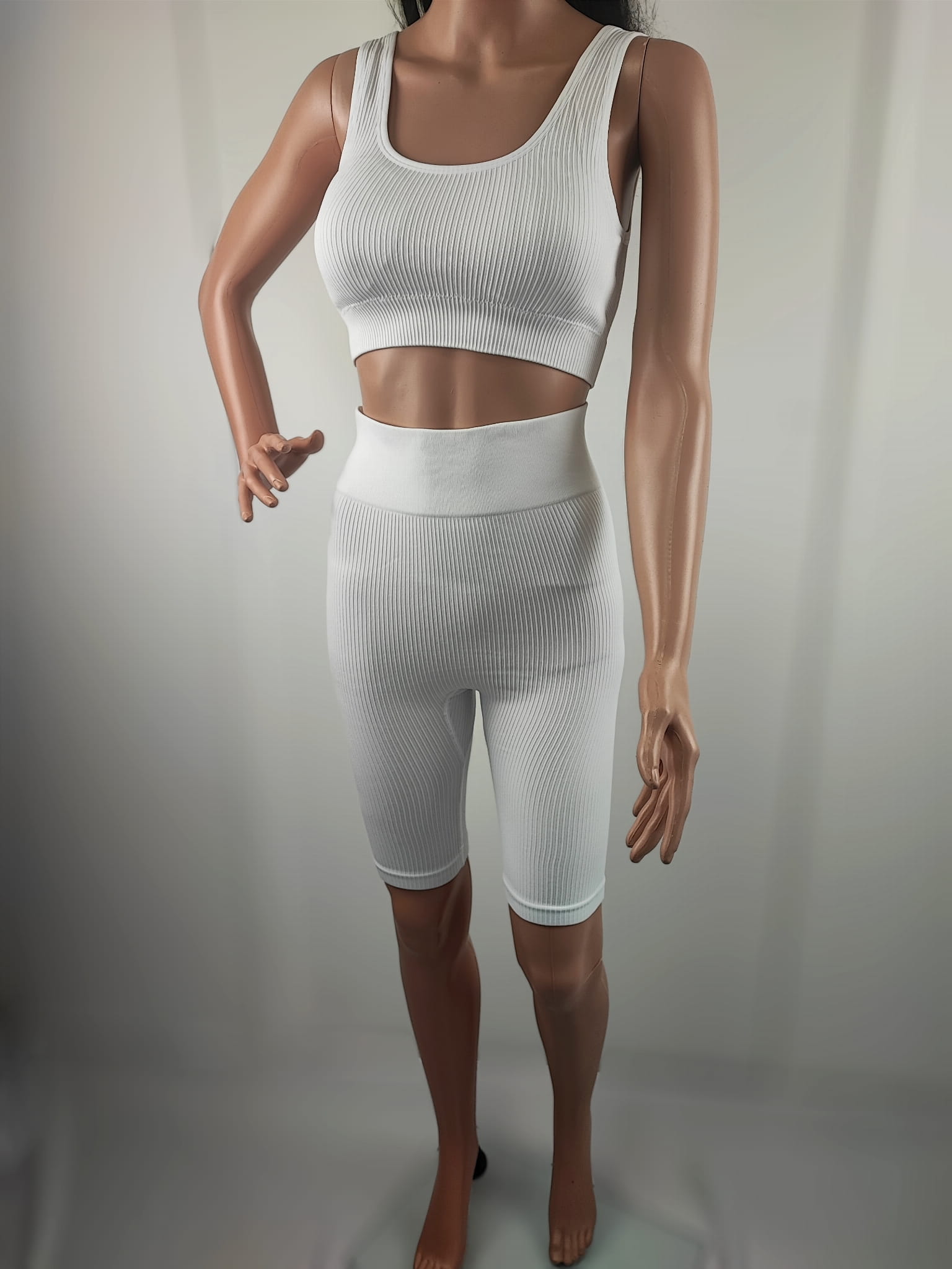 Biały prążkowany komplet: top + legginsy typu kolarki