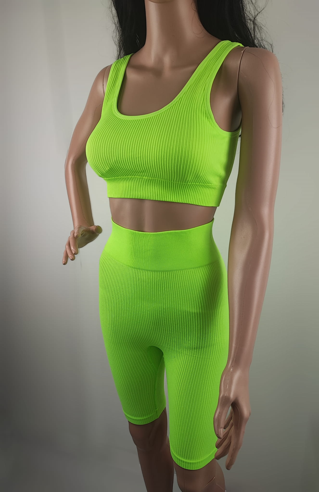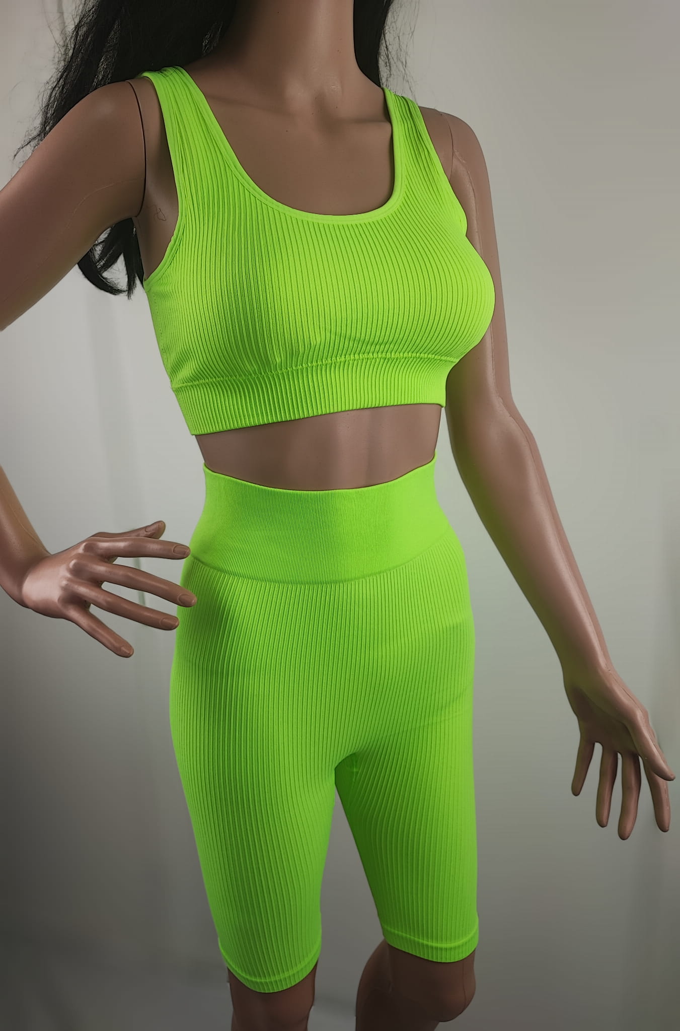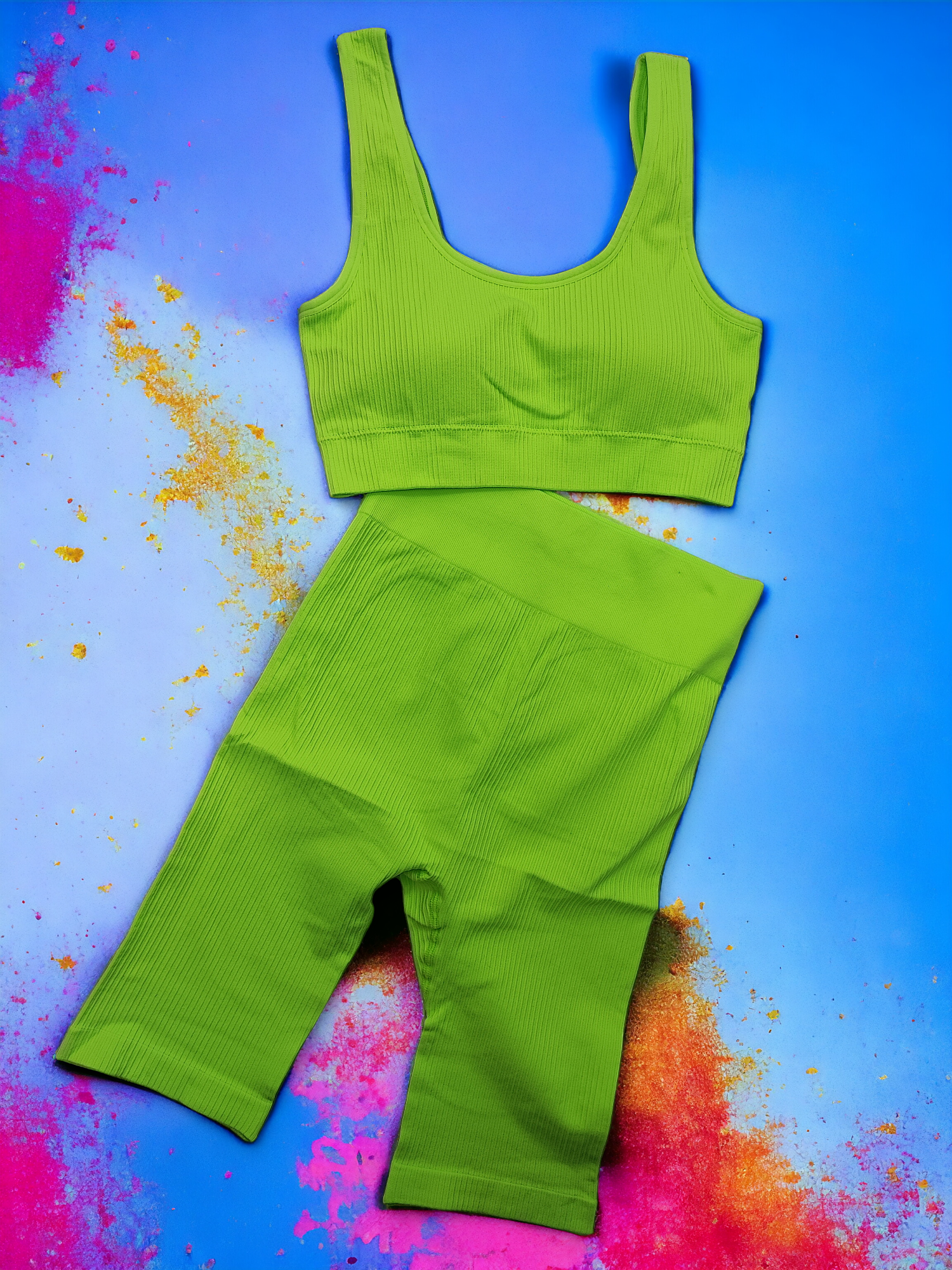 Seledynowy prążkowany komplet: top + legginsy typu kolarki