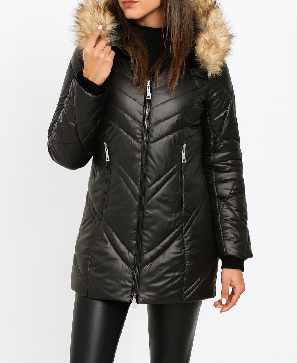 Kurtka Damska Pikowana Jesień-Zima Kaptur Odpinane Futro Czarna
