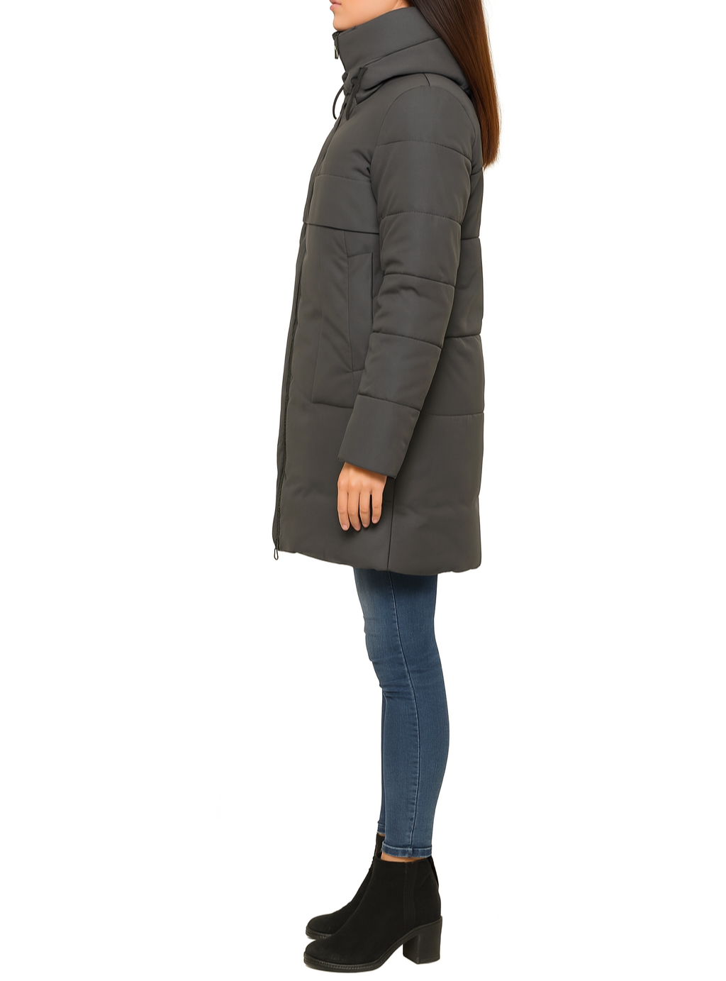 Kurtka Damska Zimowa z Kapturem Zima Ocieplana Dłuższa Duże Rozmiary Ciemno Szary Grafitowa