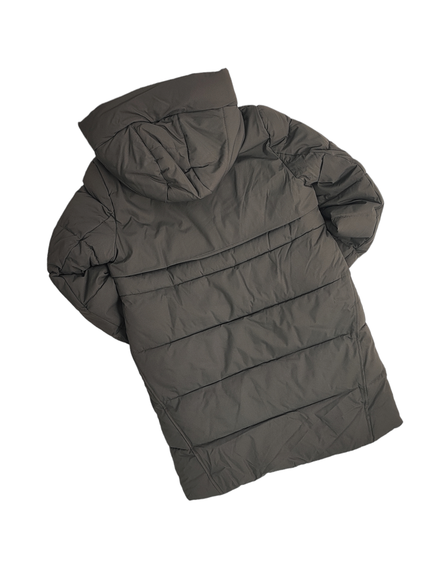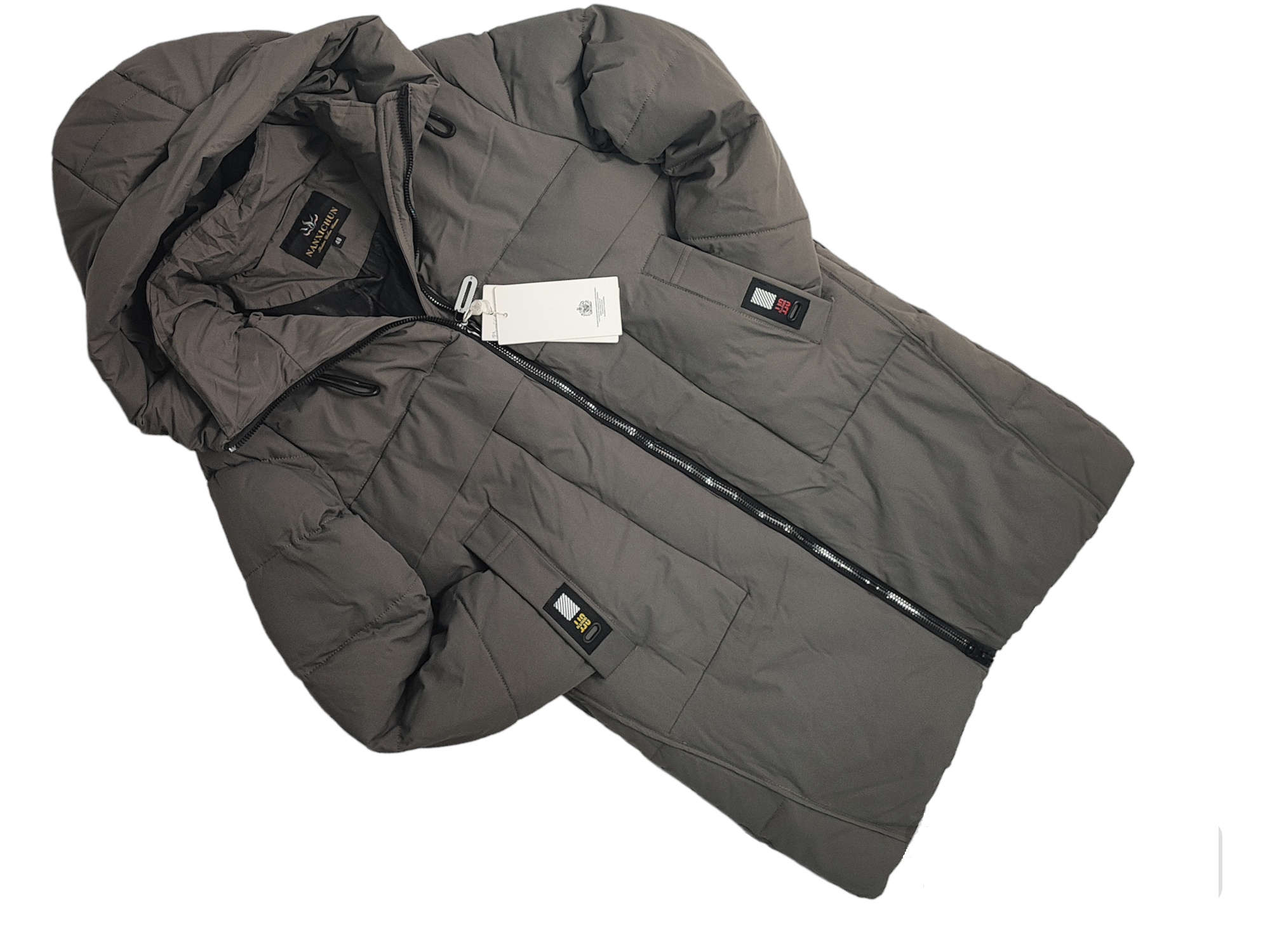 Kurtka na zimę, bardzo ciepła z kapturem, pikowany materiał, dłuższy krój. Kaptur ściągany ozdobnymi trokami . Dwie kieszenie zapinane na zatrzaski (boczne), oraz jedna od środka. Rękaw od środka wykończony czarnym ściągaczem. Kurtka zasuwana na suwak dwustronny. Kaptur nie odpinany .