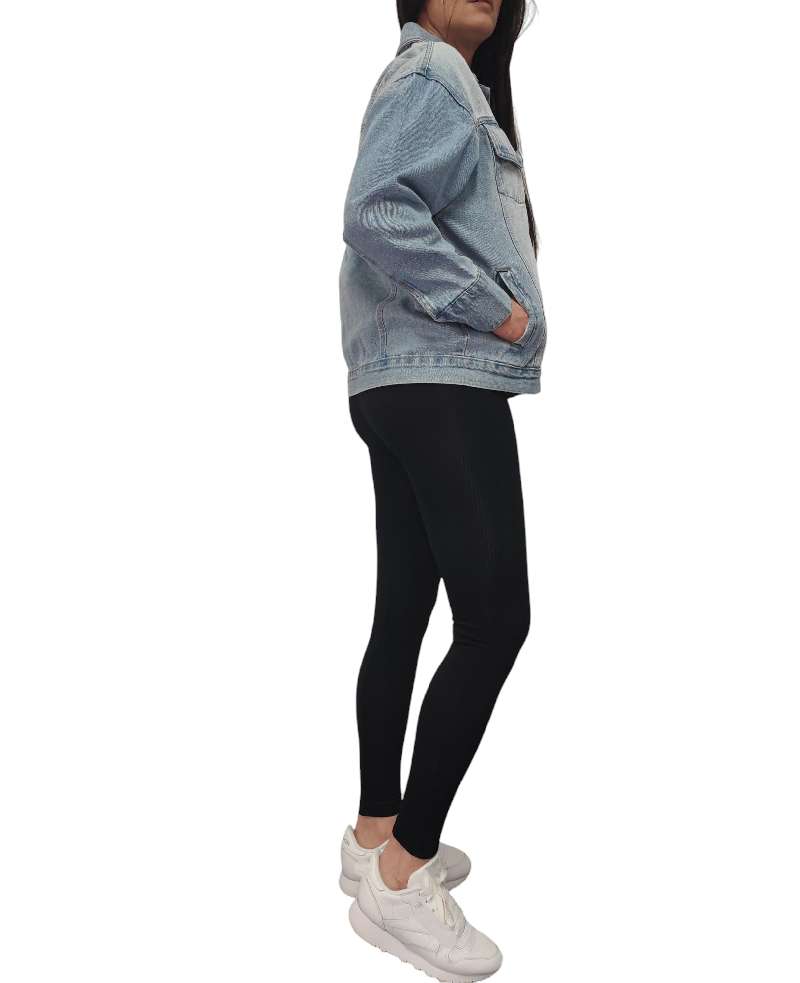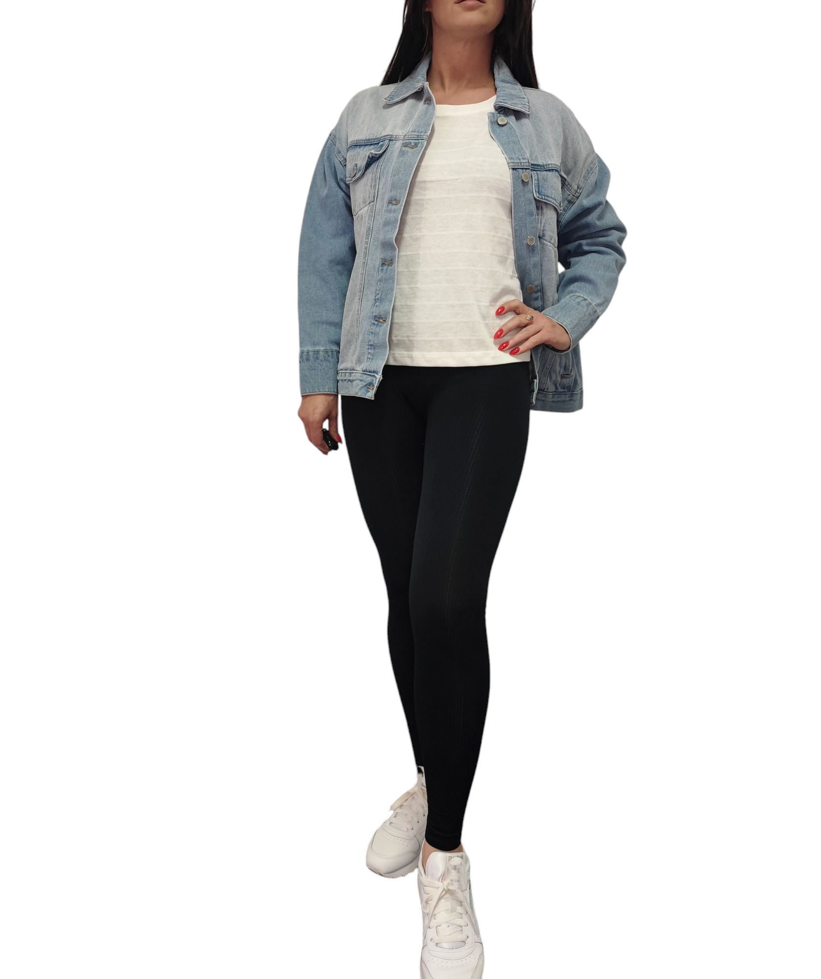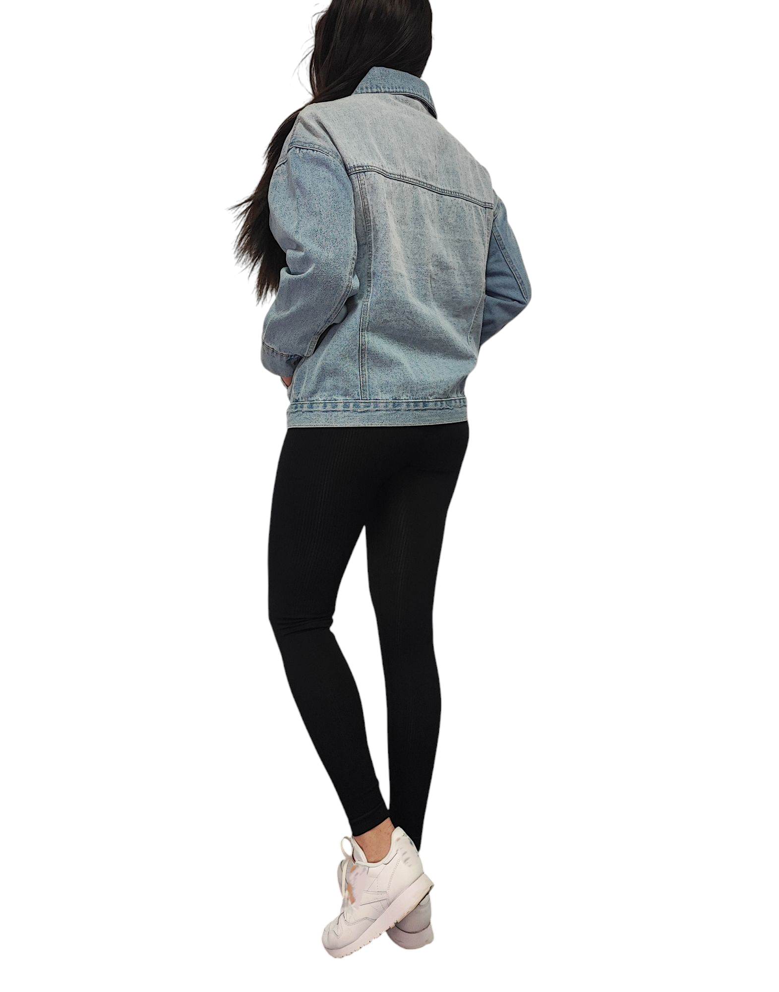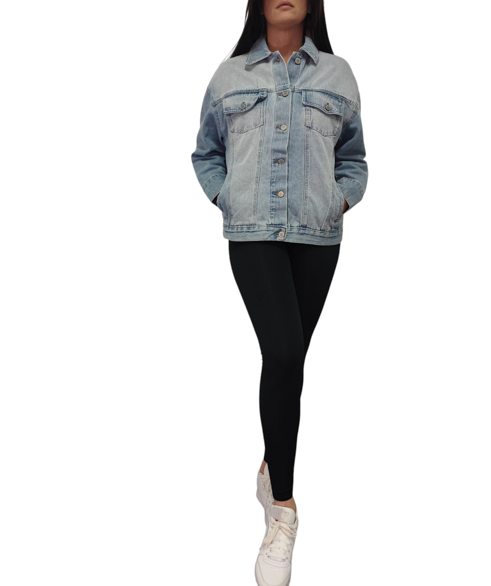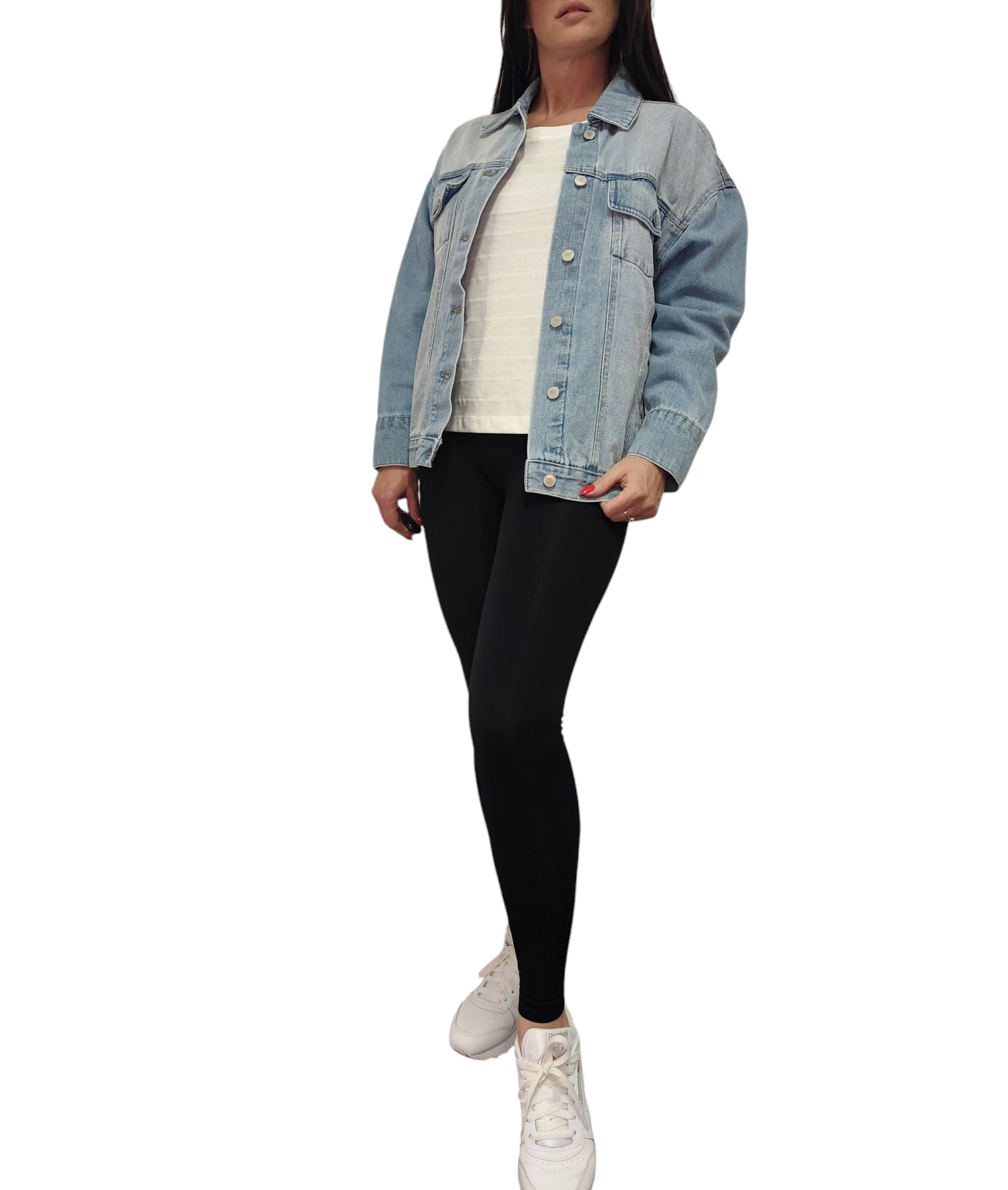 Klasyczna jasnoniebieska kurteczka jeans zapinana na srebrne guziki.