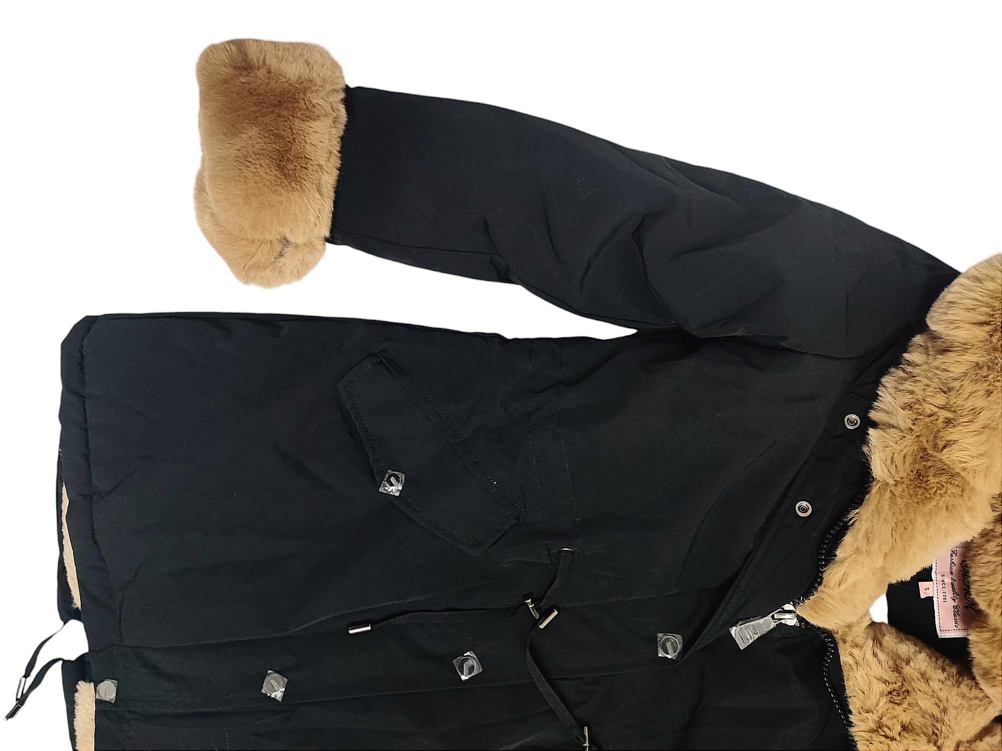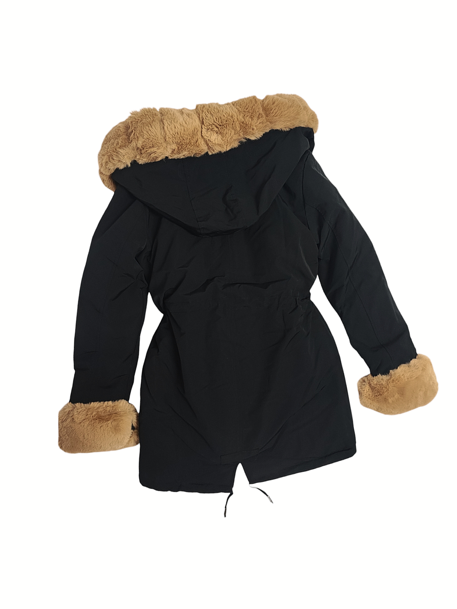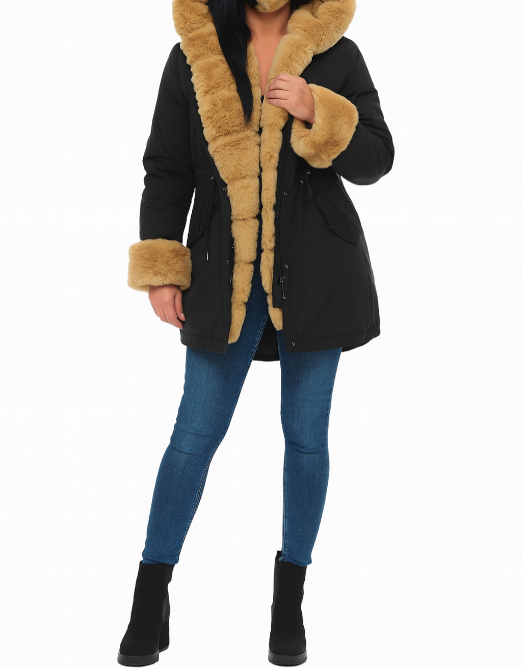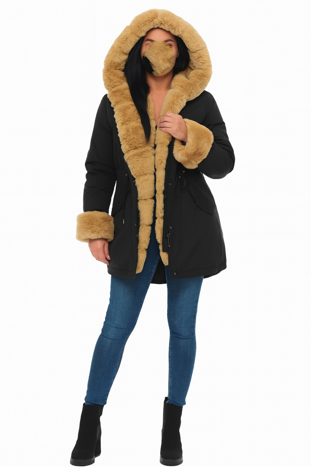 Ozdobne futerko znajdujące się przy kołnierzu, kapturze, zamku i mankietach rękawów, jest odpinane. Rękawy od środka wykończone ściągaczem.