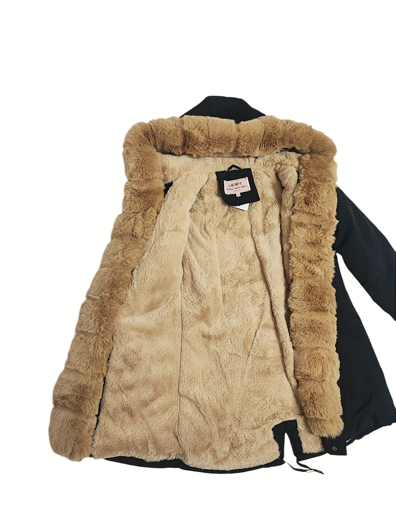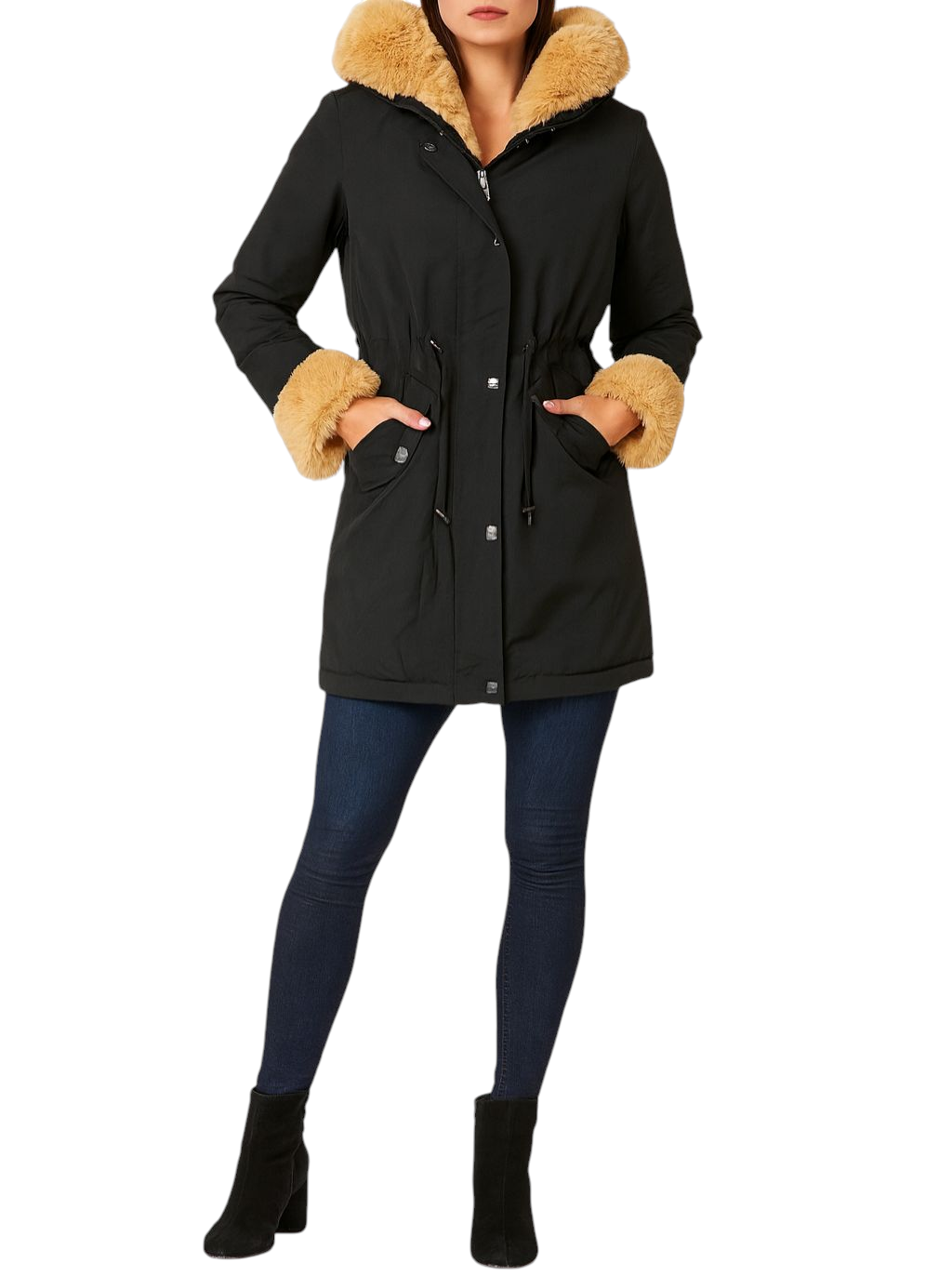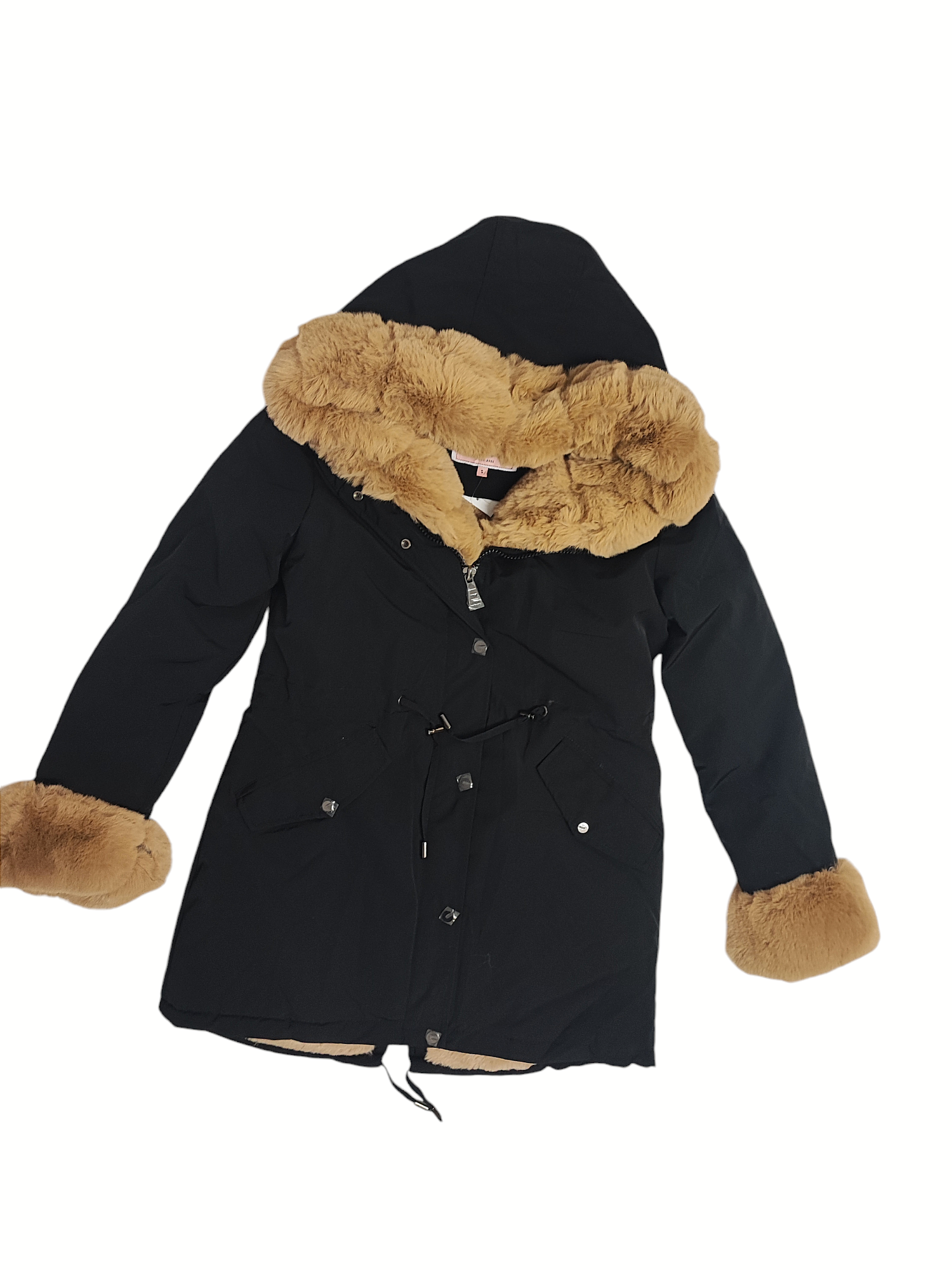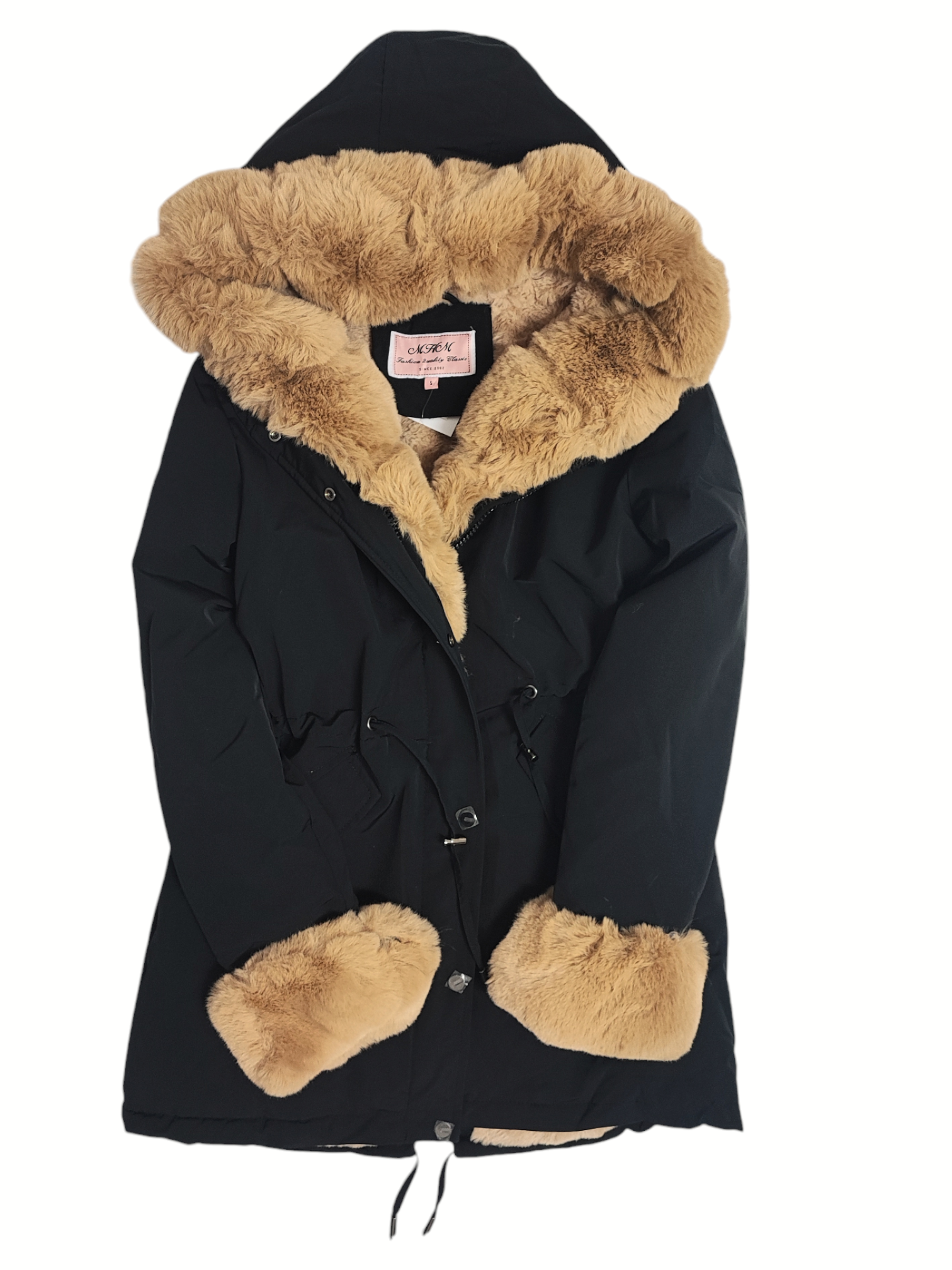 Ozdobne futerko znajdujące się przy kołnierzu, kapturze, zamku i mankietach rękawów, jest odpinane. Rękawy od środka wykończone ściągaczem.