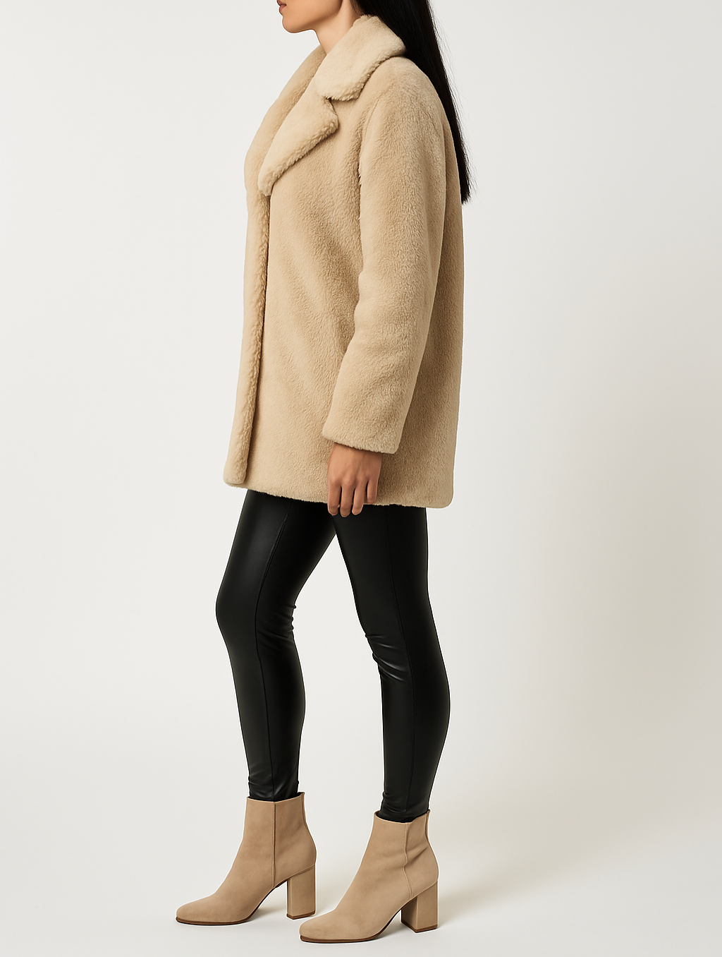 Płaszcz Damski Długi Futro Sztuczne z Kołnierzem Jesień Zima Jasny Beżowy L