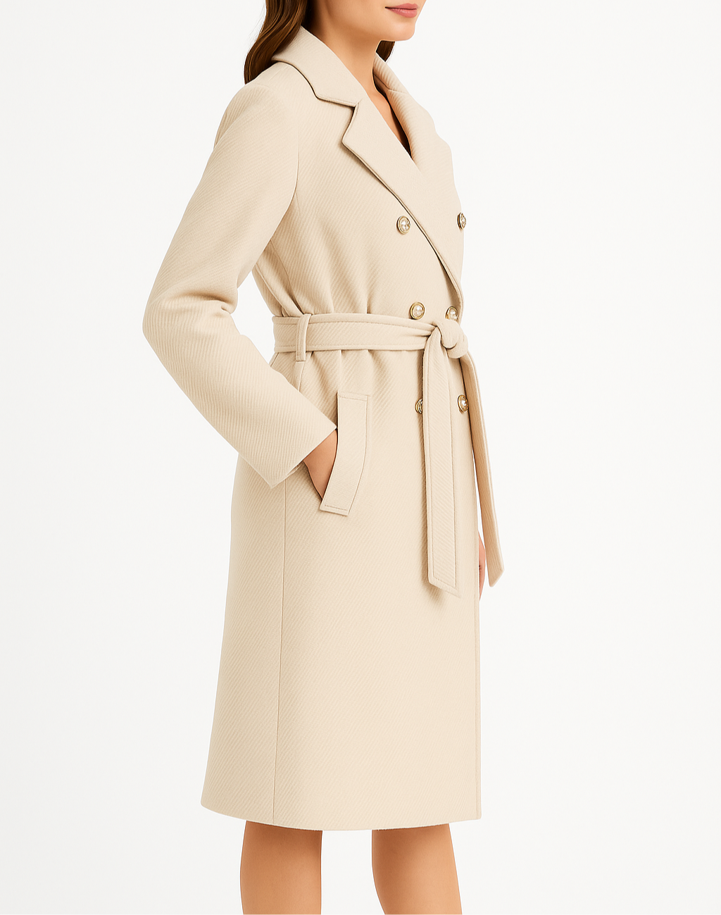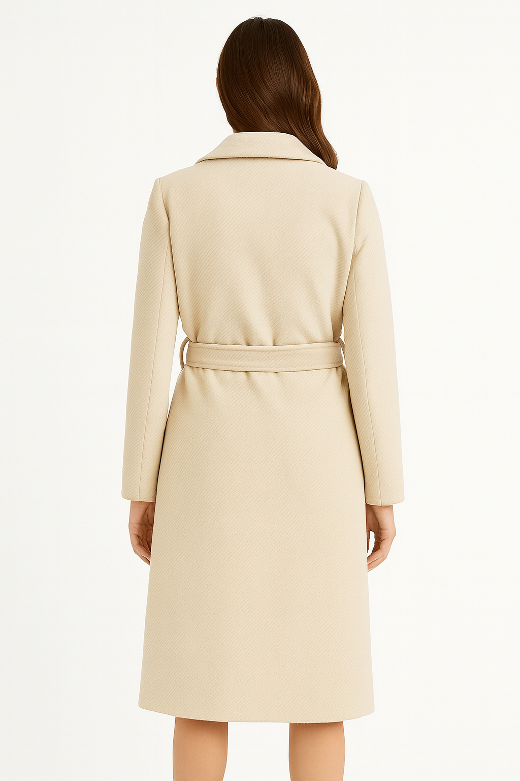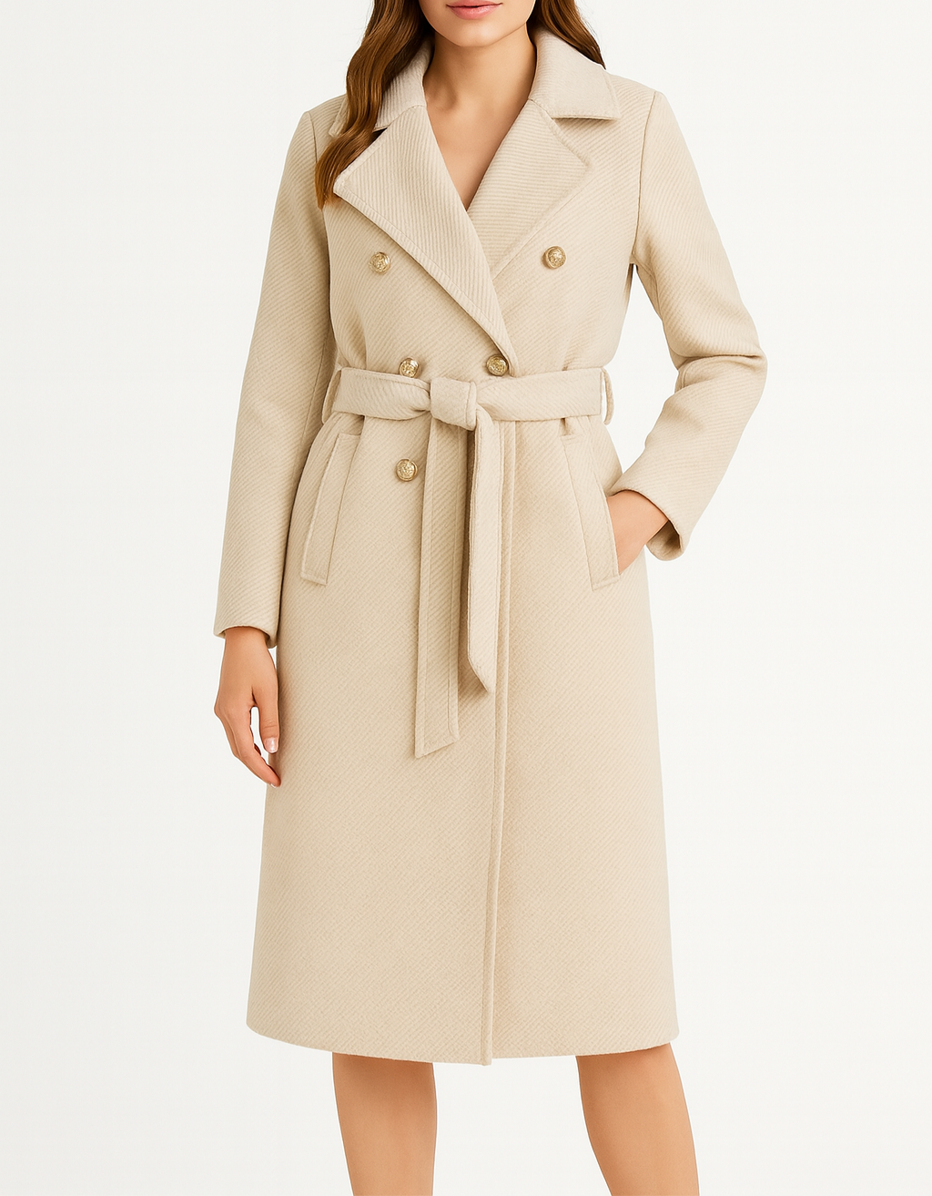 Płaszcz Damski Długi Jesionka Jesienny Prążkowany Dwurzędowy Jasno Beżowy