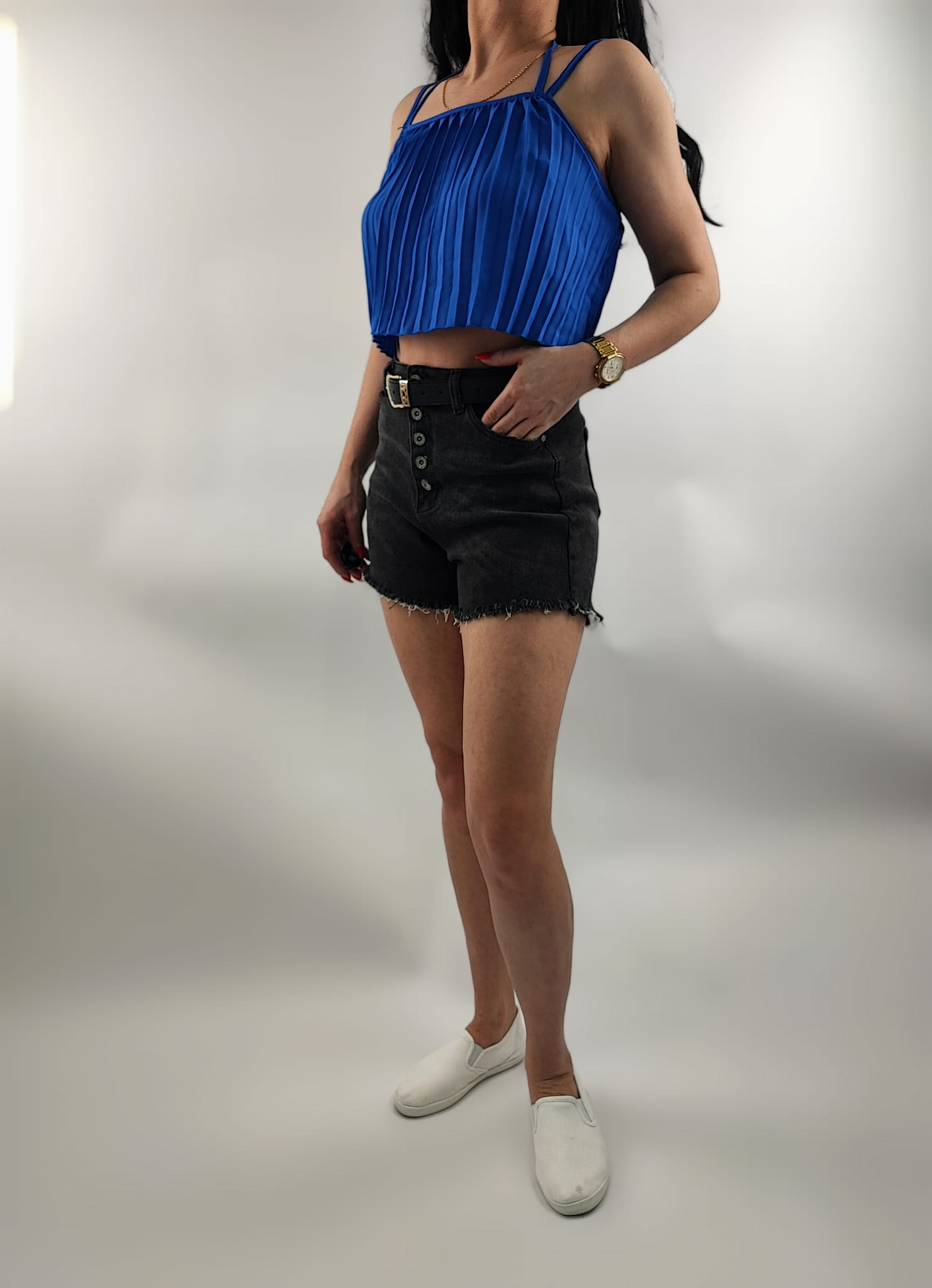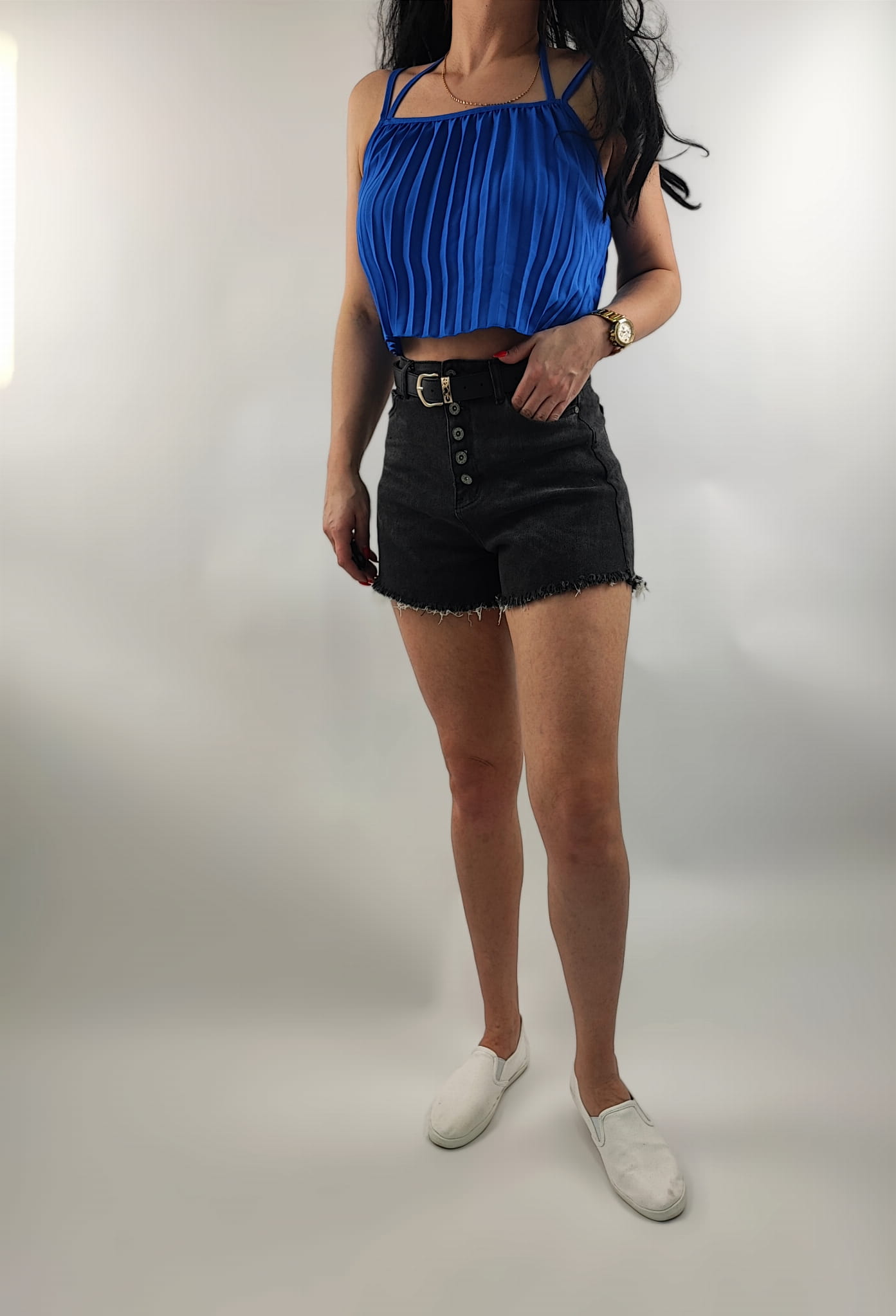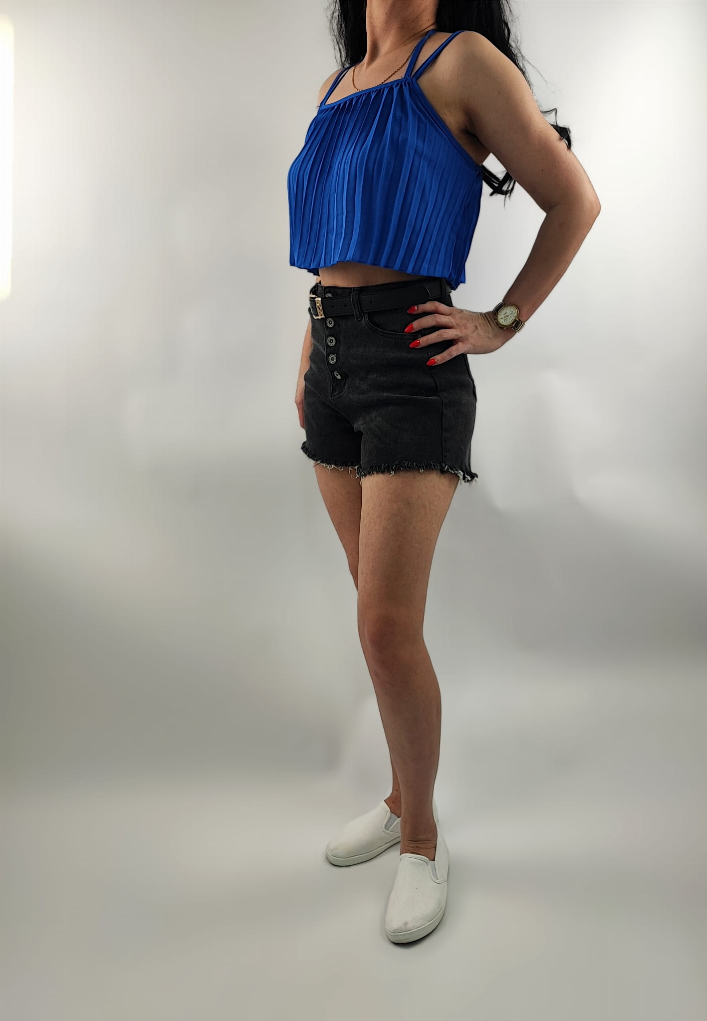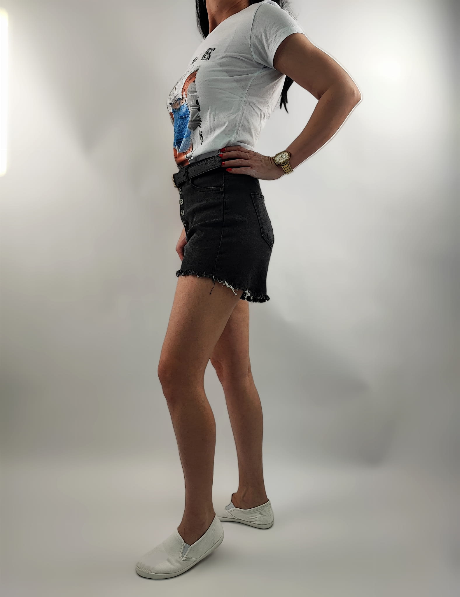 Spodenki są z wysokim stanem, zapinane na guziki, pięknie podkreślają talie, wyszczuplają, wydłużają i wysmuklają optycznie nogi.
