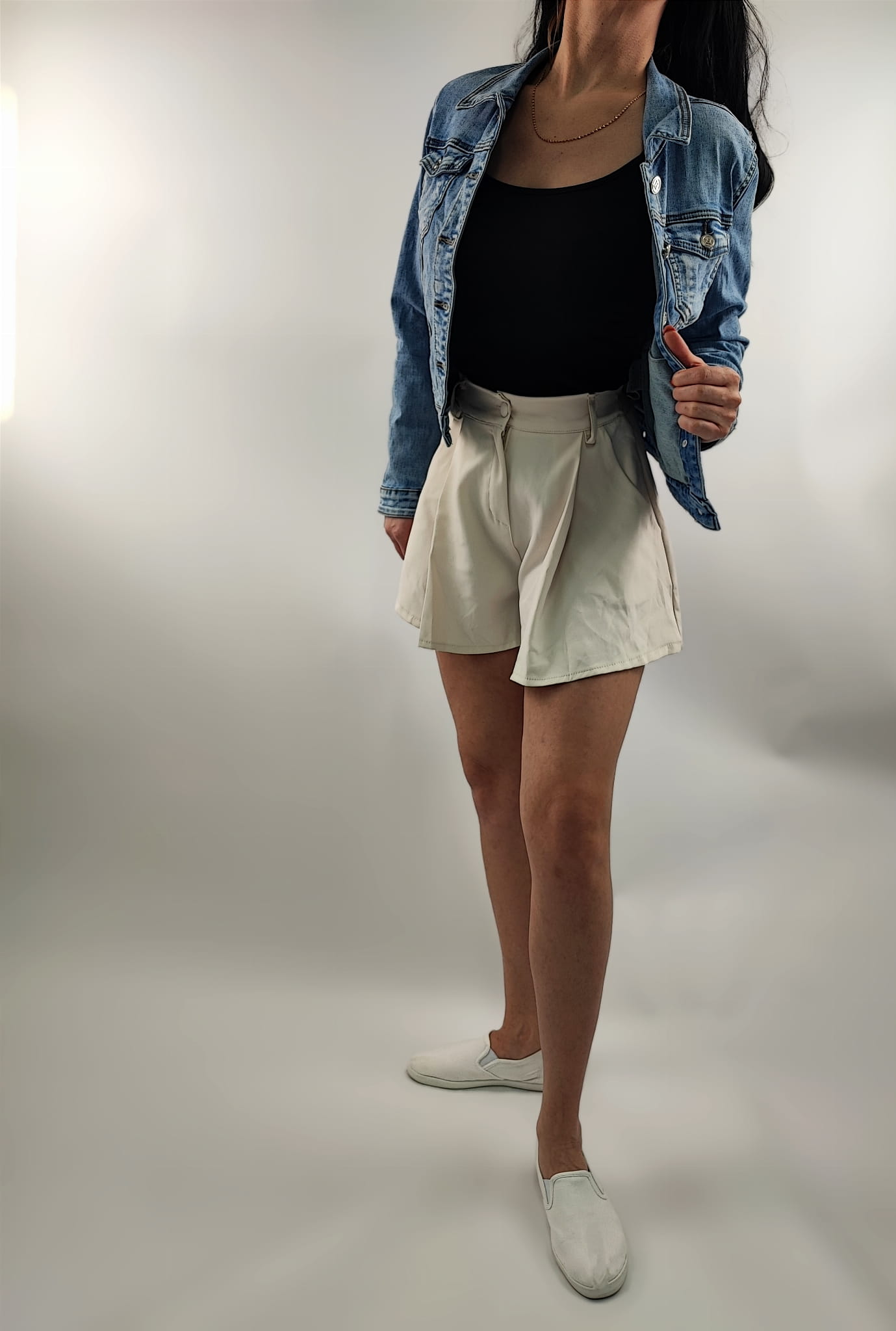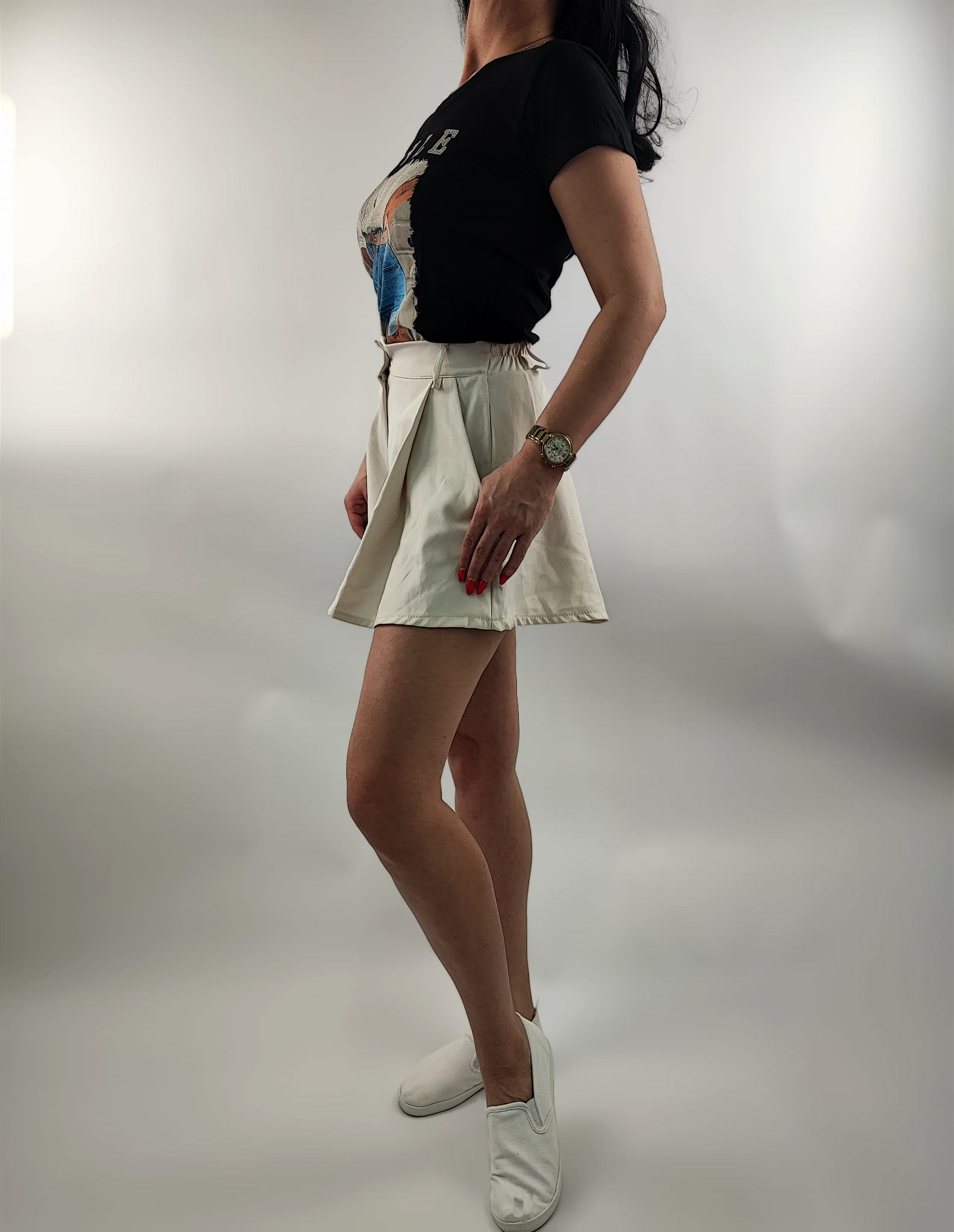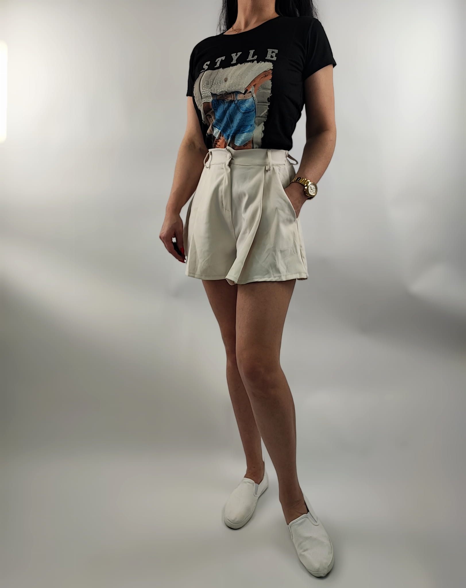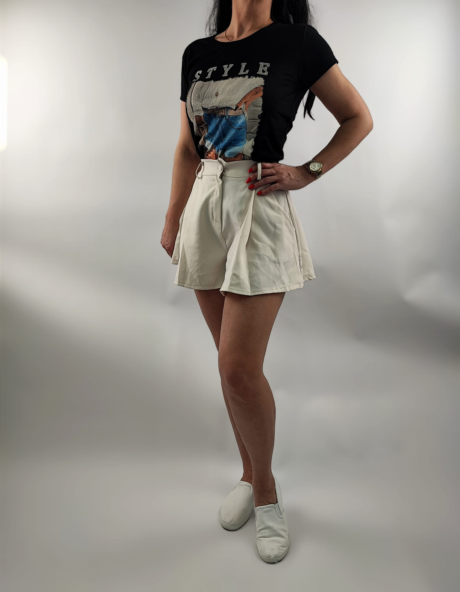 Spodenki są z wysokim stanem, zapinane na guzik i suwak.Pięknie podkreślają talie, wyszczuplają, wydłużają i wysmuklają optycznie nogi. Posiadają szlufki na pasek , kieszonki po bokach, oraz wszyta gumkę z tyłu spodenek.