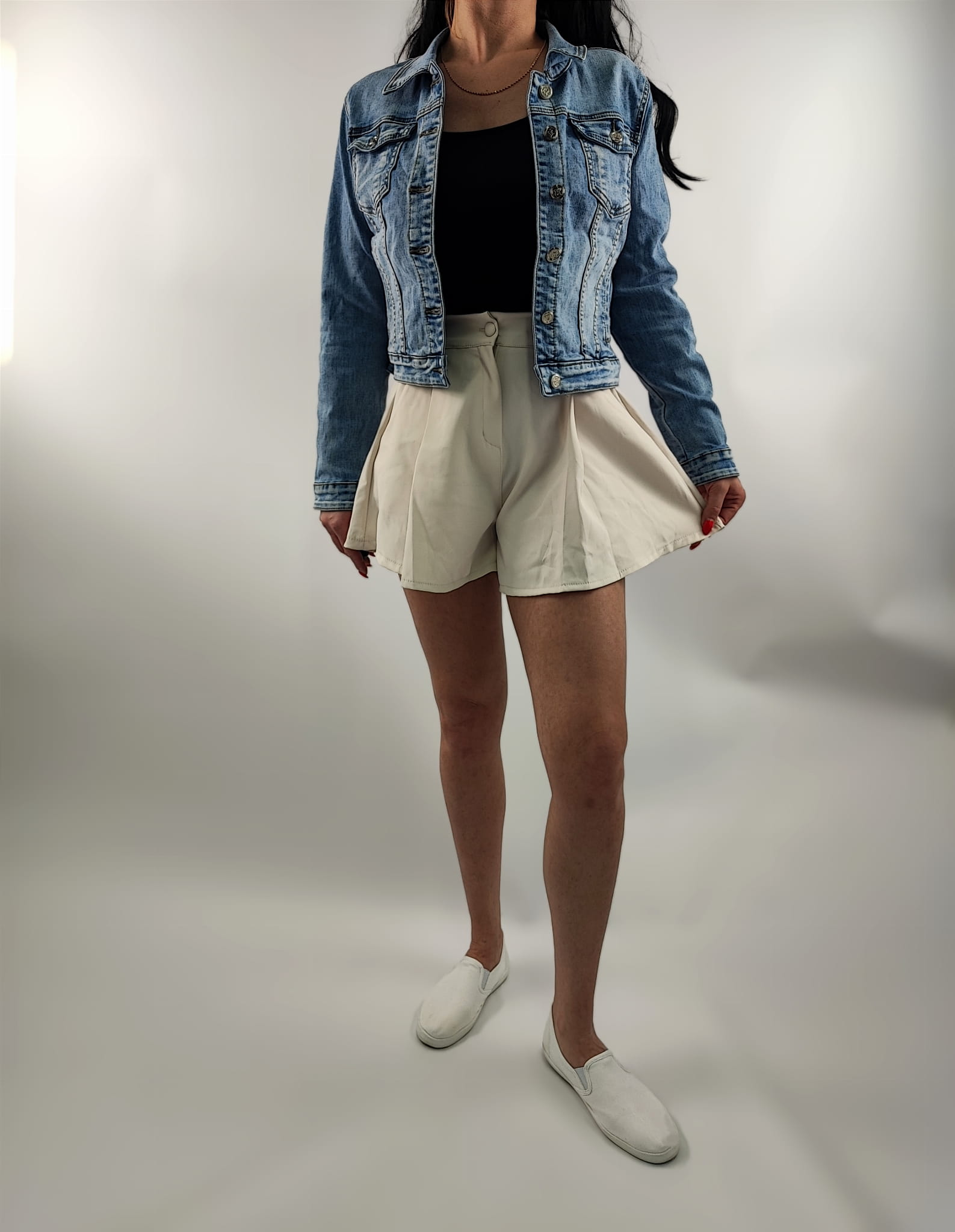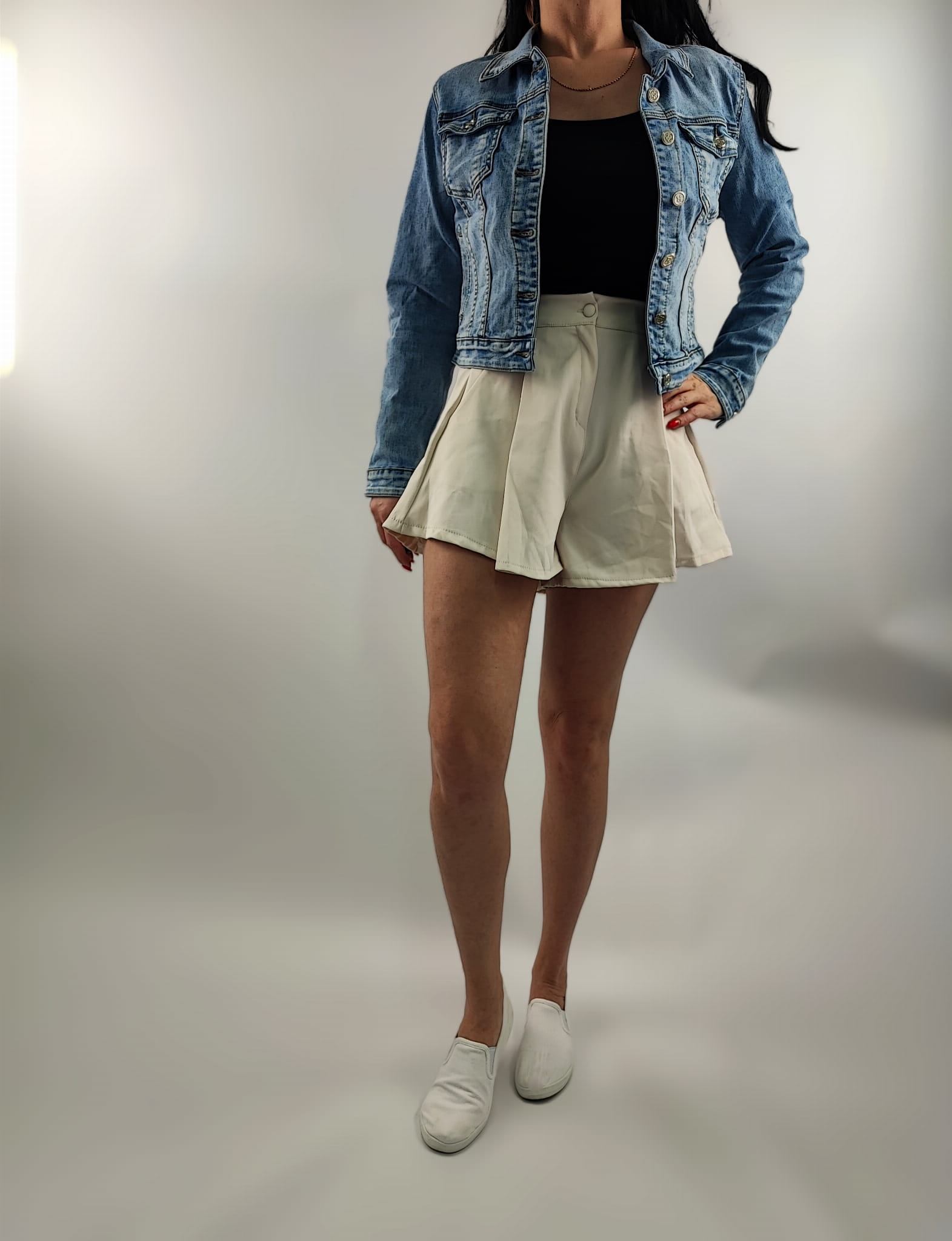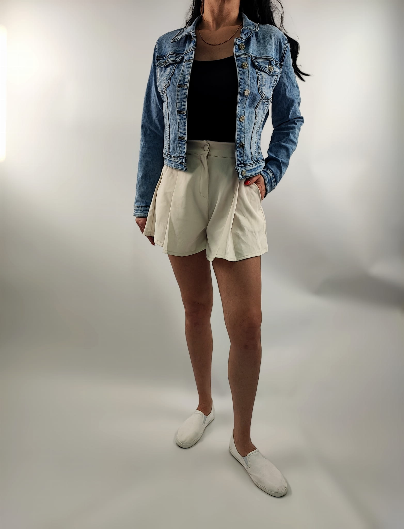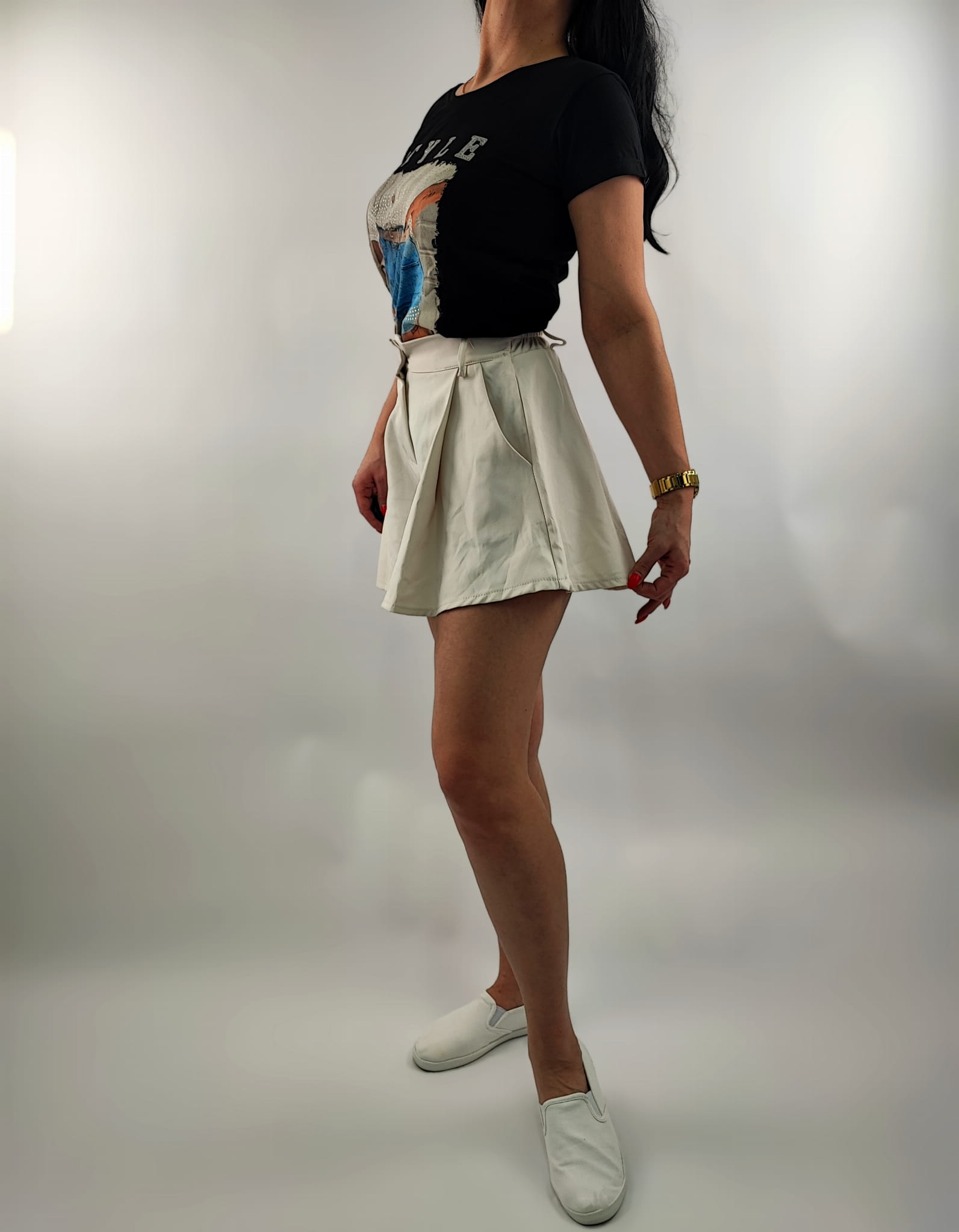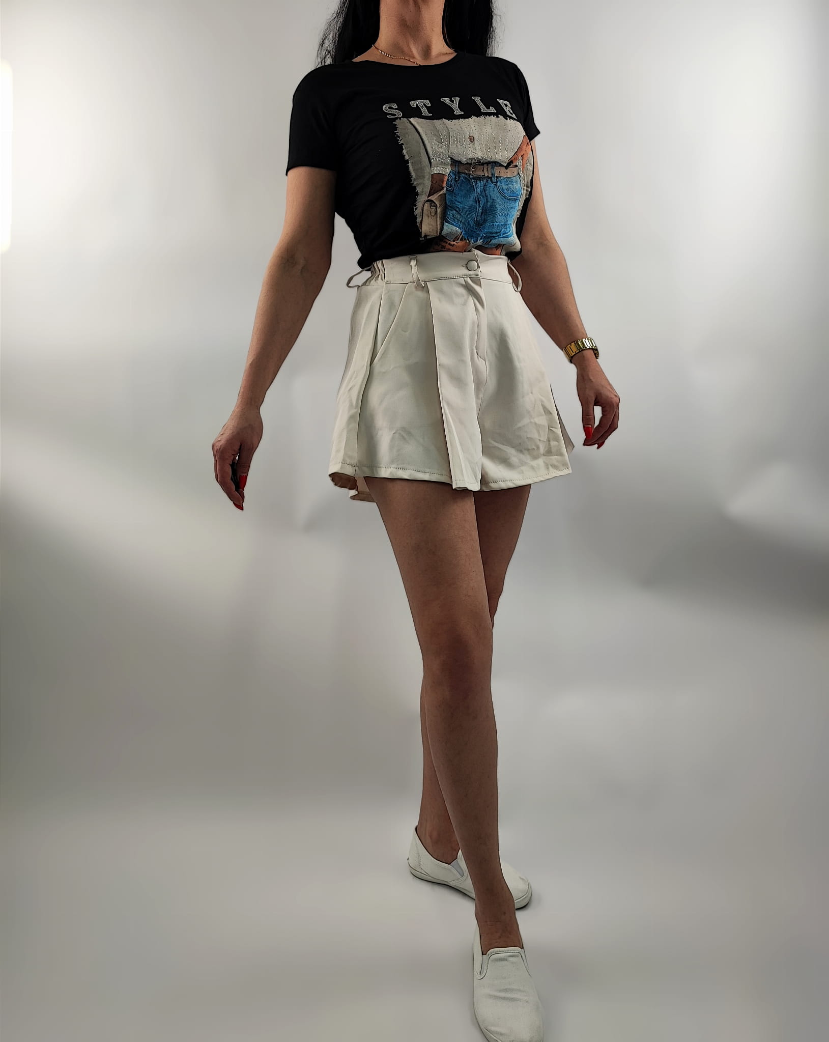 Spodenki są z wysokim stanem, zapinane na guzik i suwak.Pięknie podkreślają talie, wyszczuplają, wydłużają i wysmuklają optycznie nogi. Posiadają szlufki na pasek , kieszonki po bokach, oraz wszyta gumkę z tyłu spodenek.