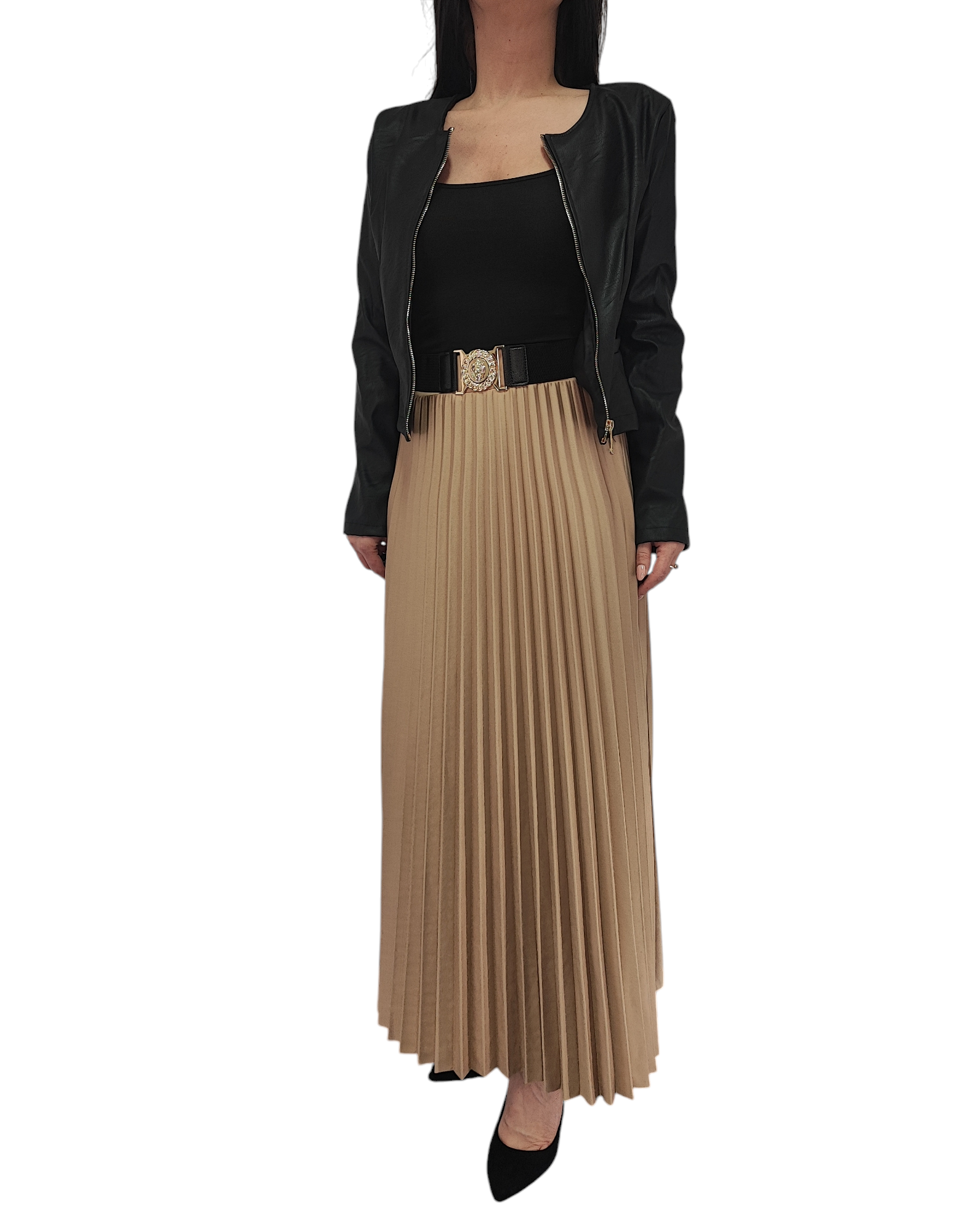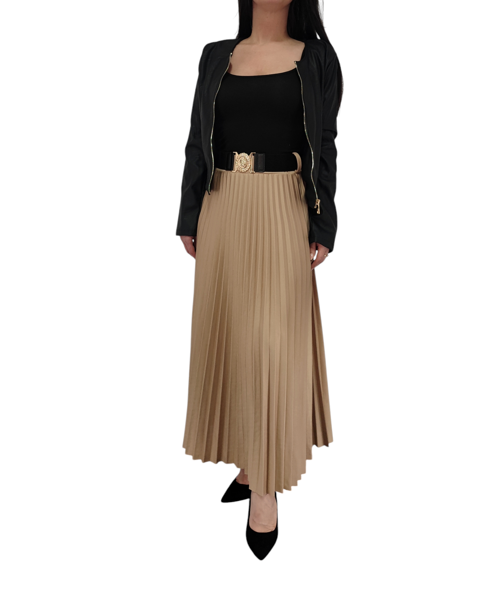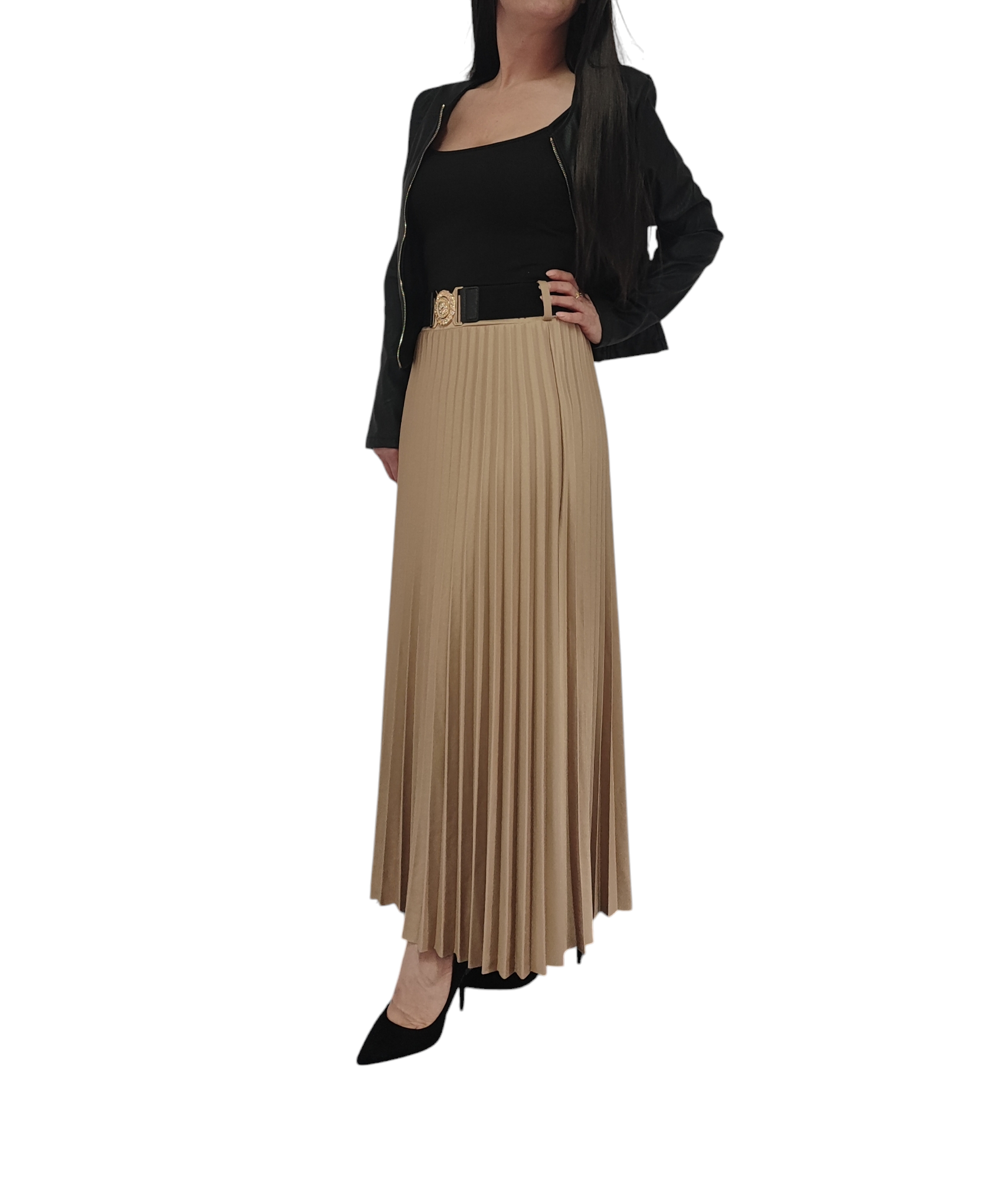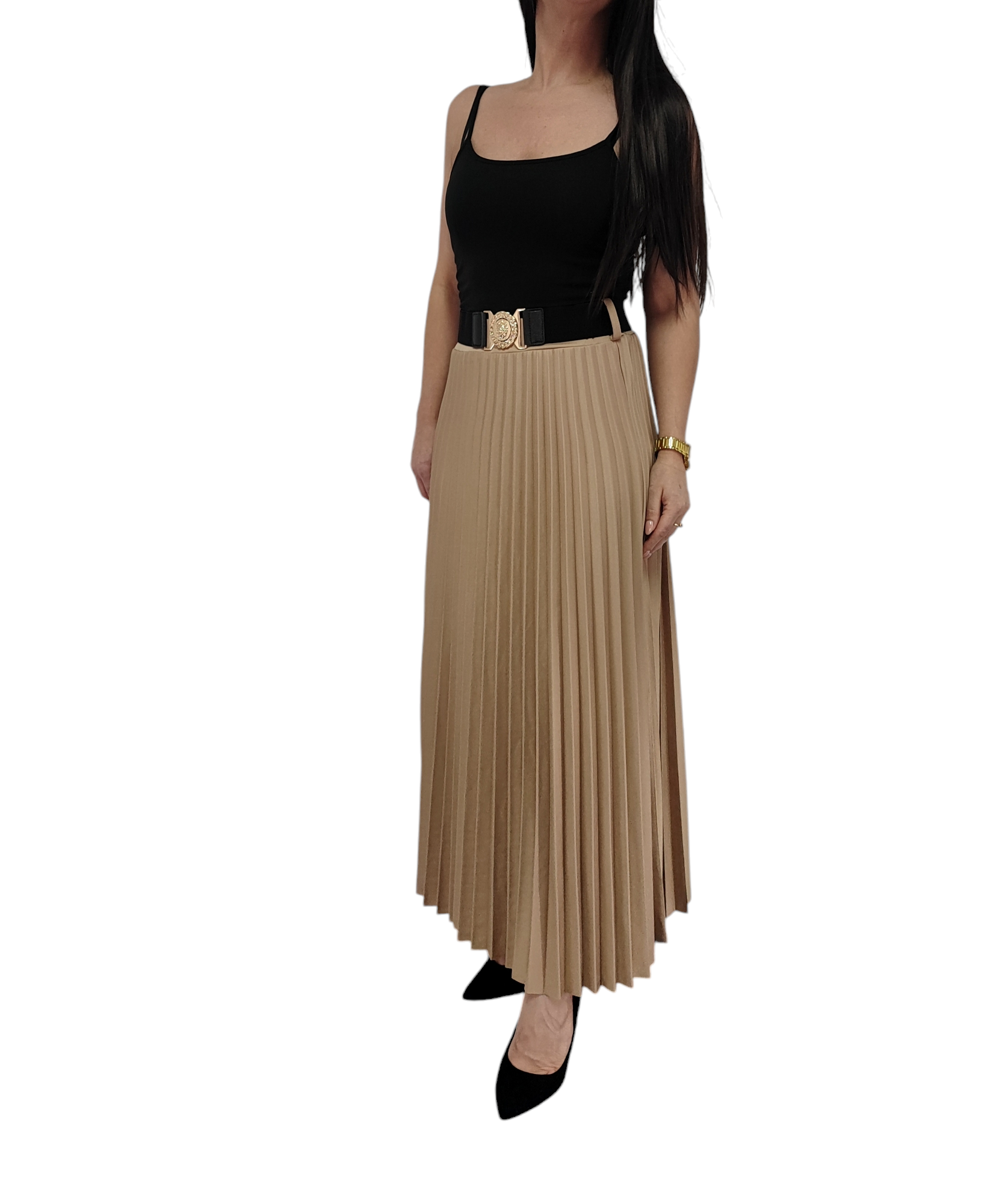 Spódnica Damska Plisowana Rozkloszowana z Paskiem Maxi Beżowa