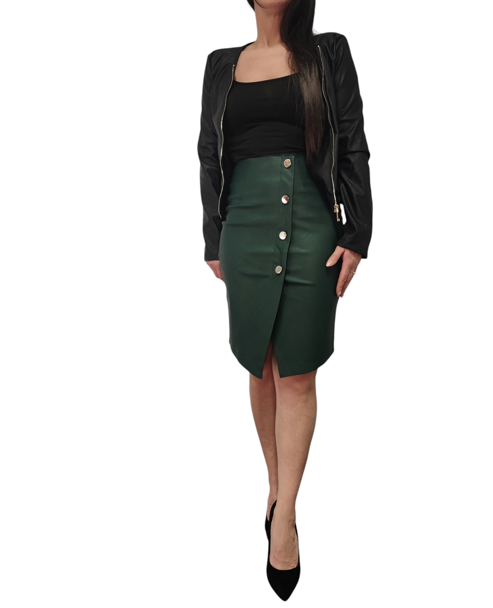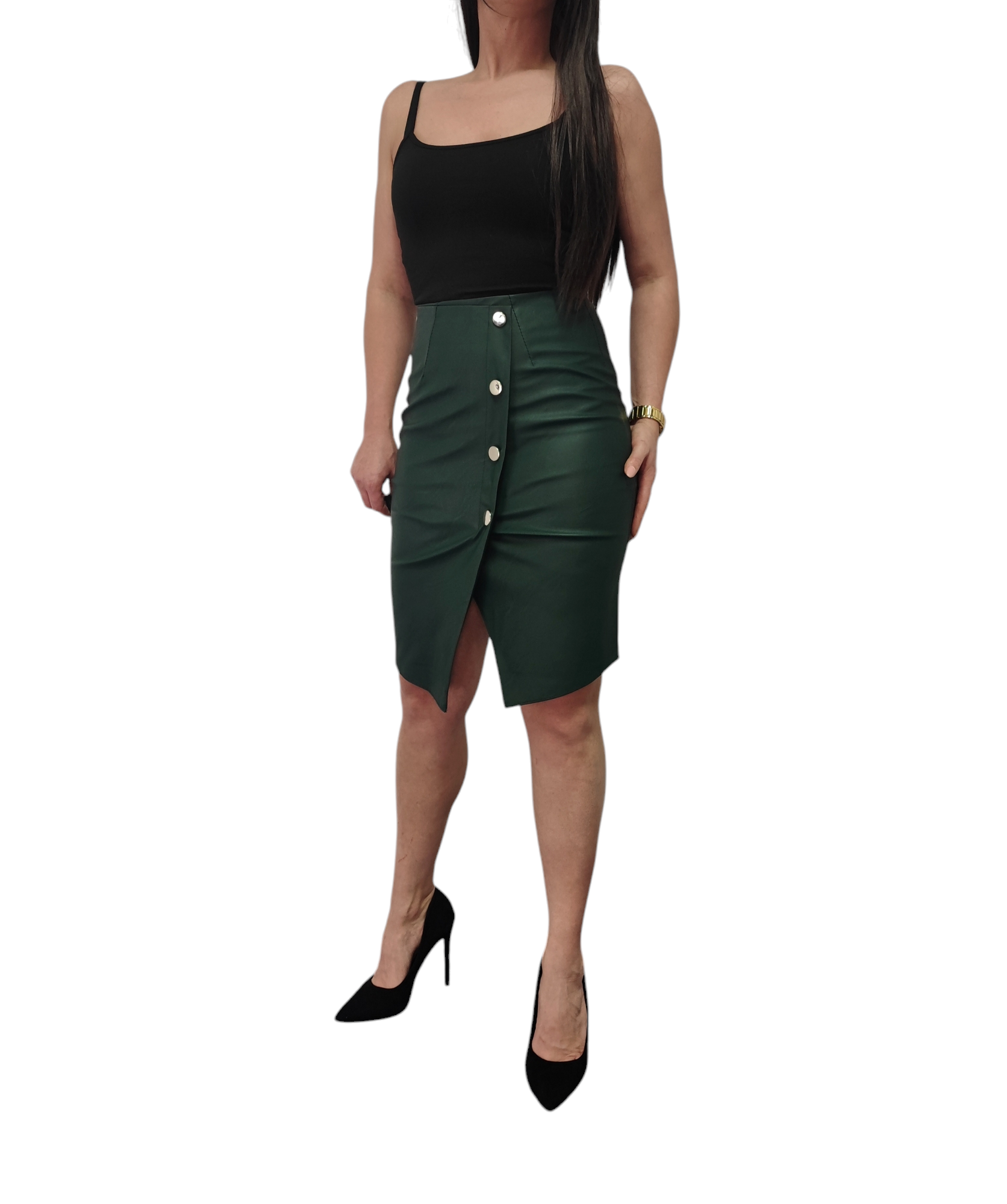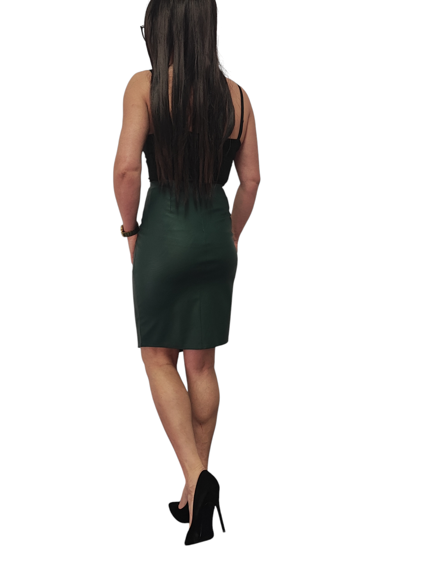 Elegancja Ołówkowa Spódnica o długości midi wykonana z eko skóry w ciemno zielonym kolorze