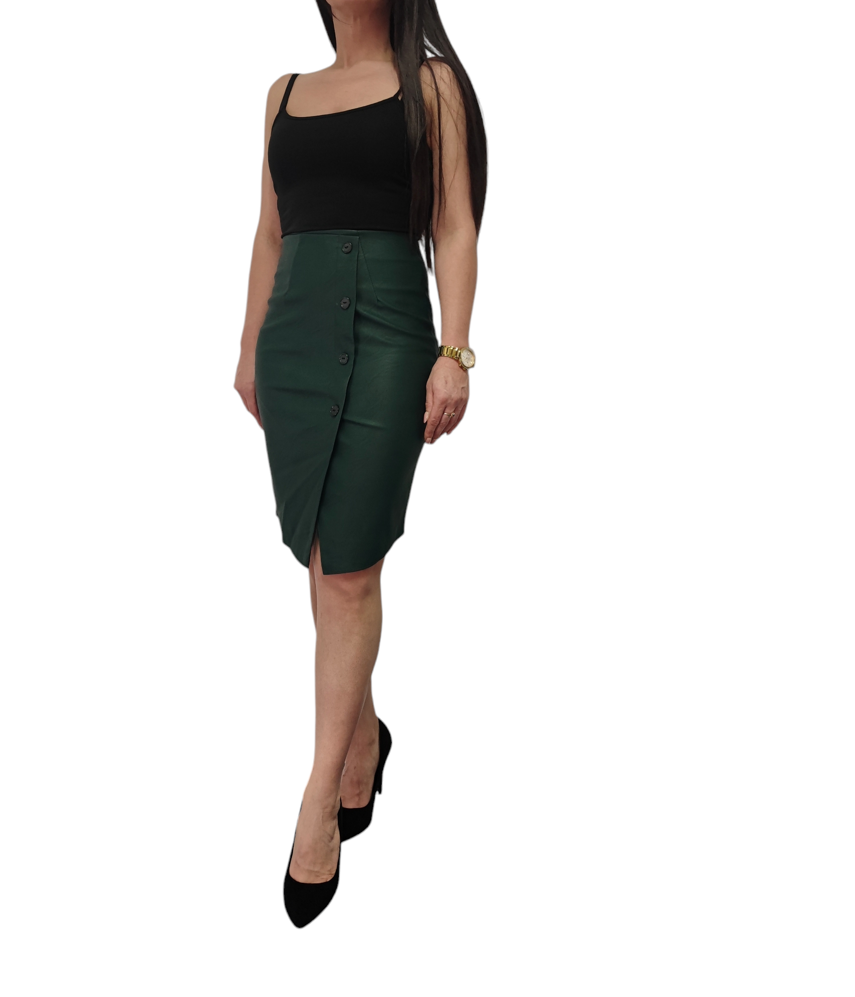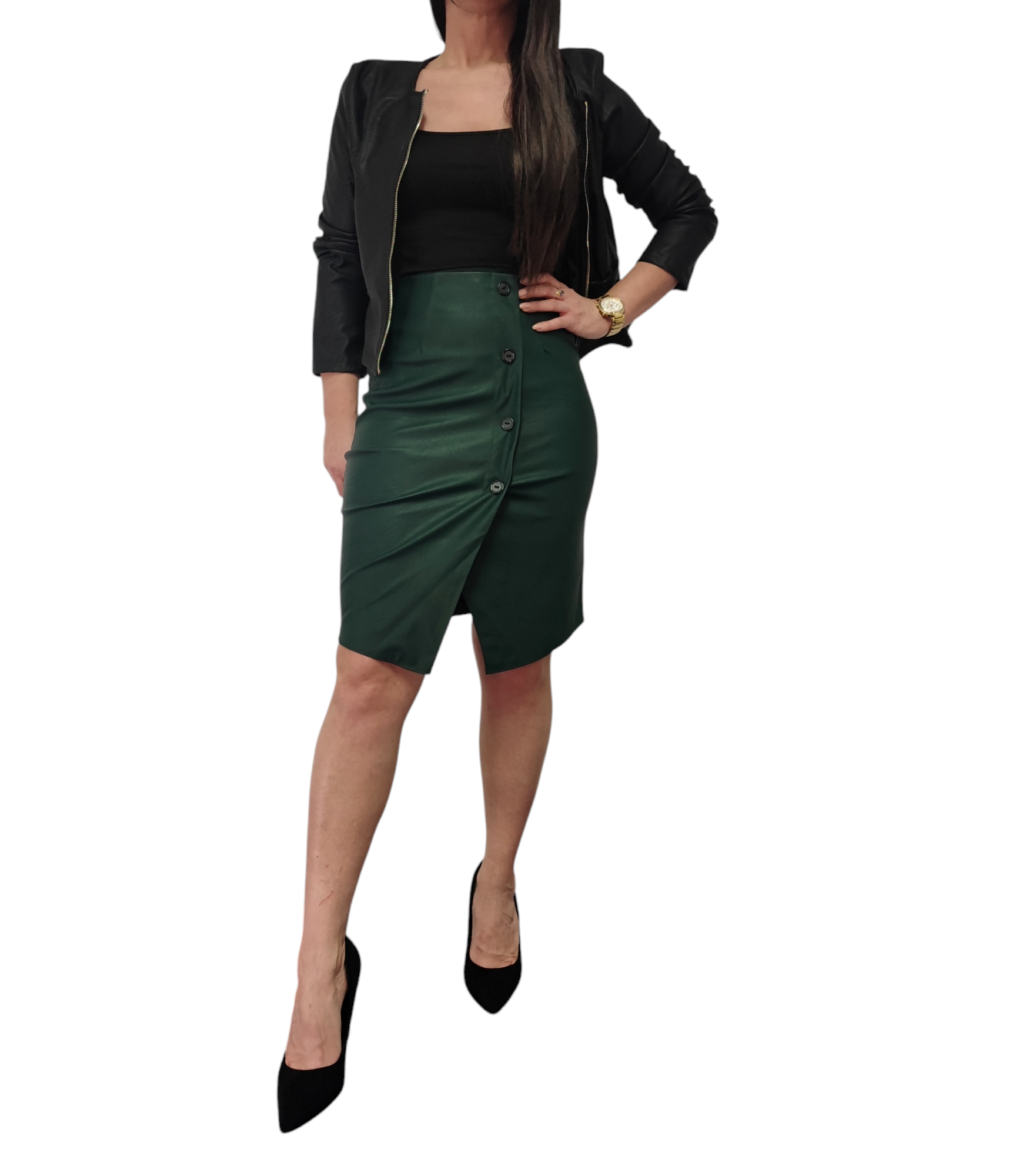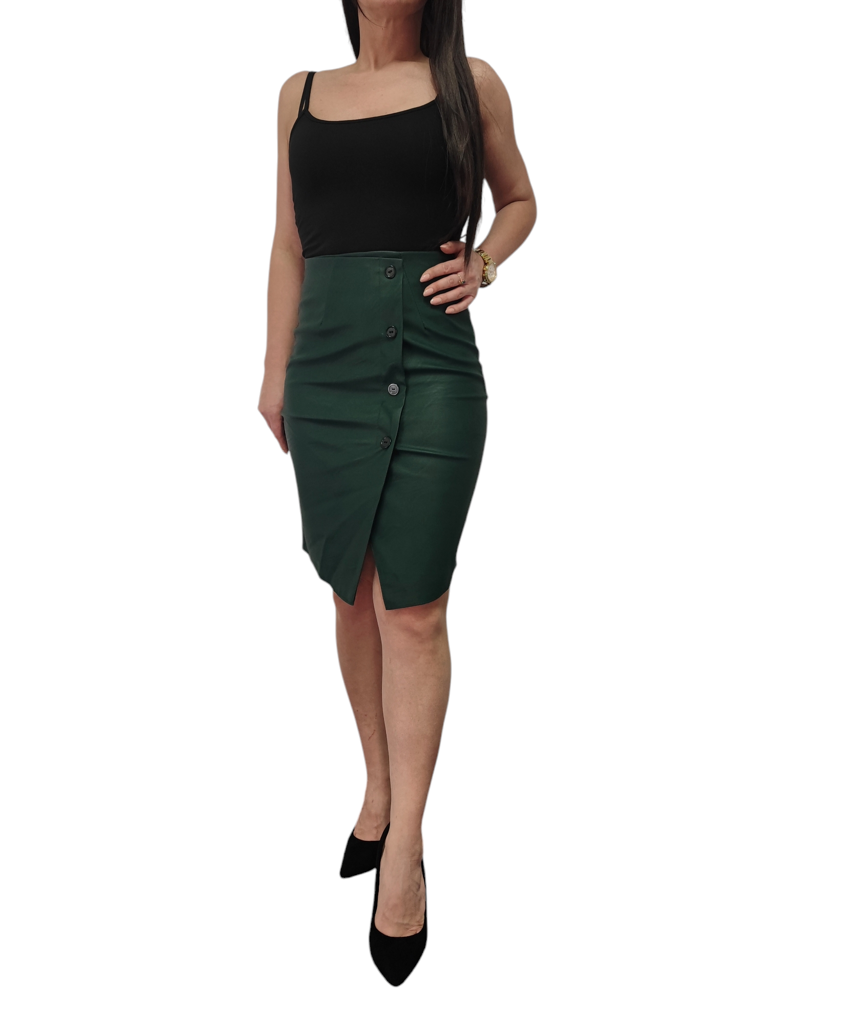 Elegancja Ołówkowa Spódnica o długości midi wykonana z eko skóry w ciemno zielonym kolorze