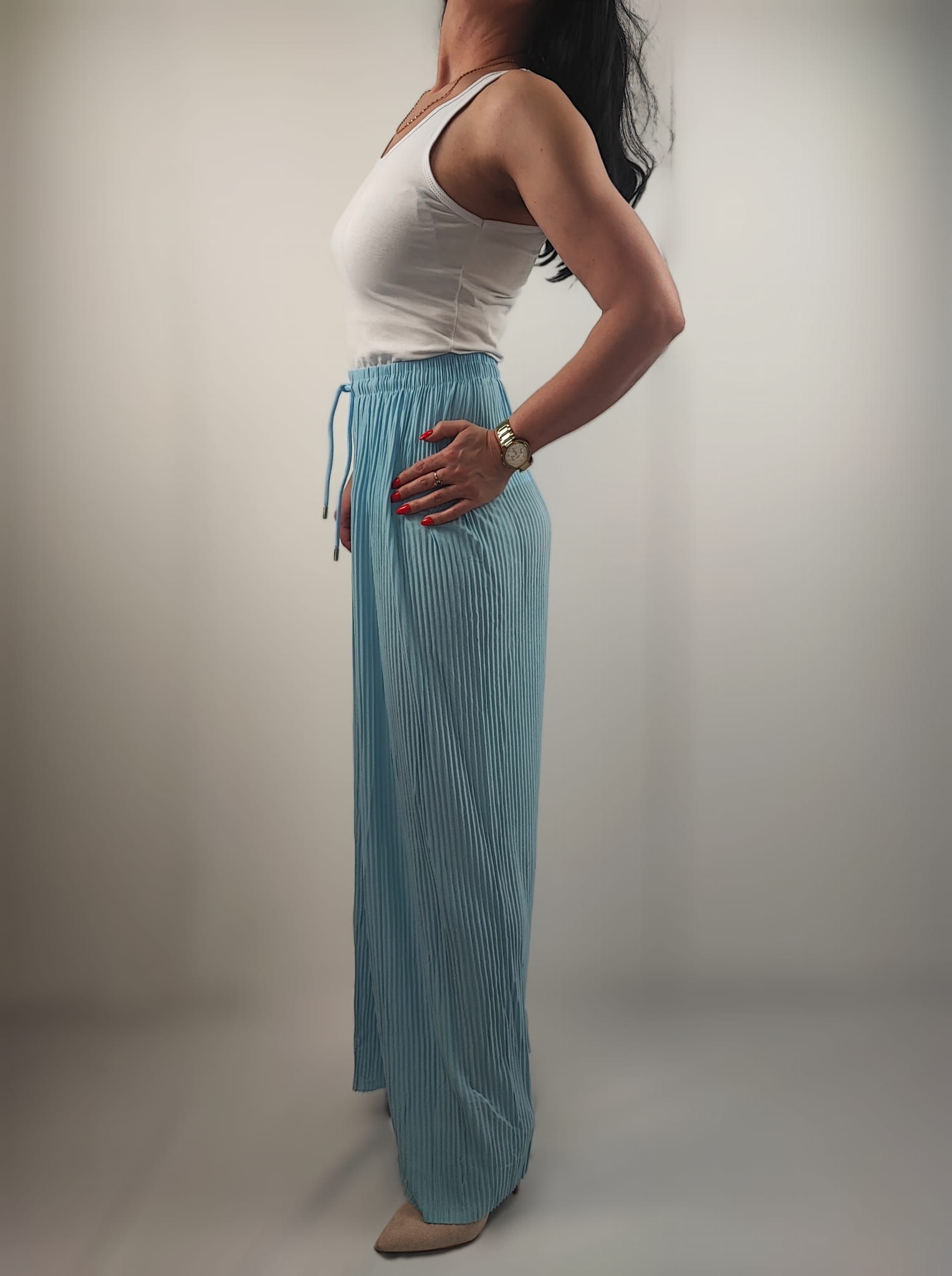 Plisowane spodnie z szerokimi nogawkami.