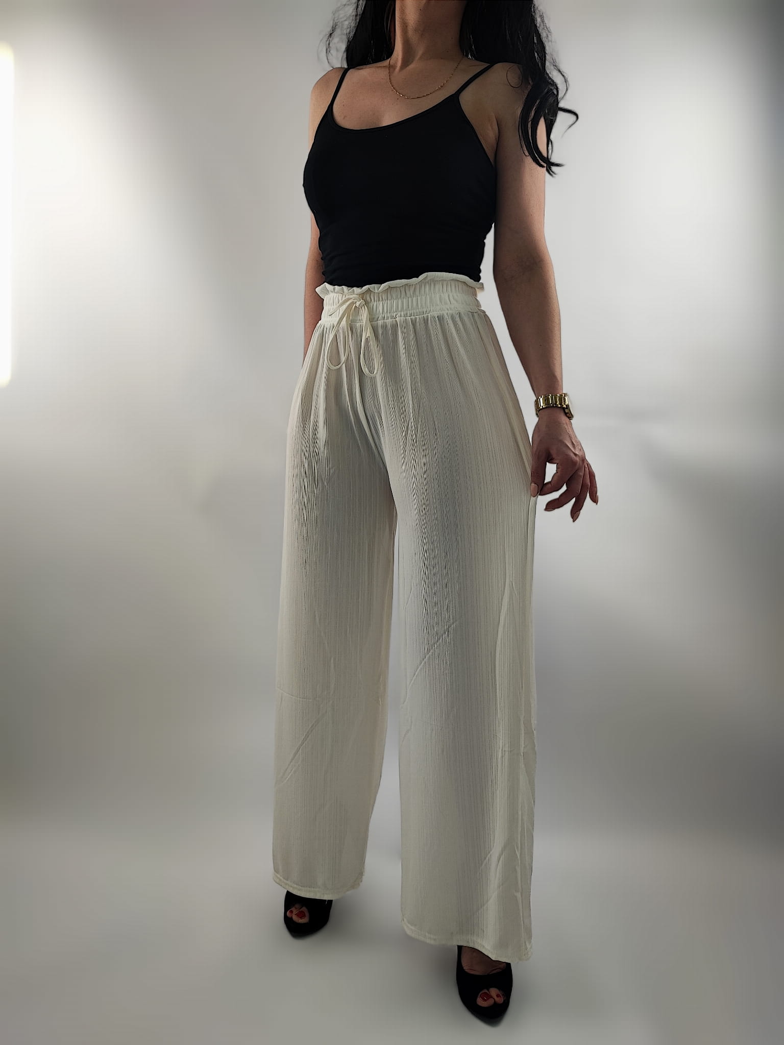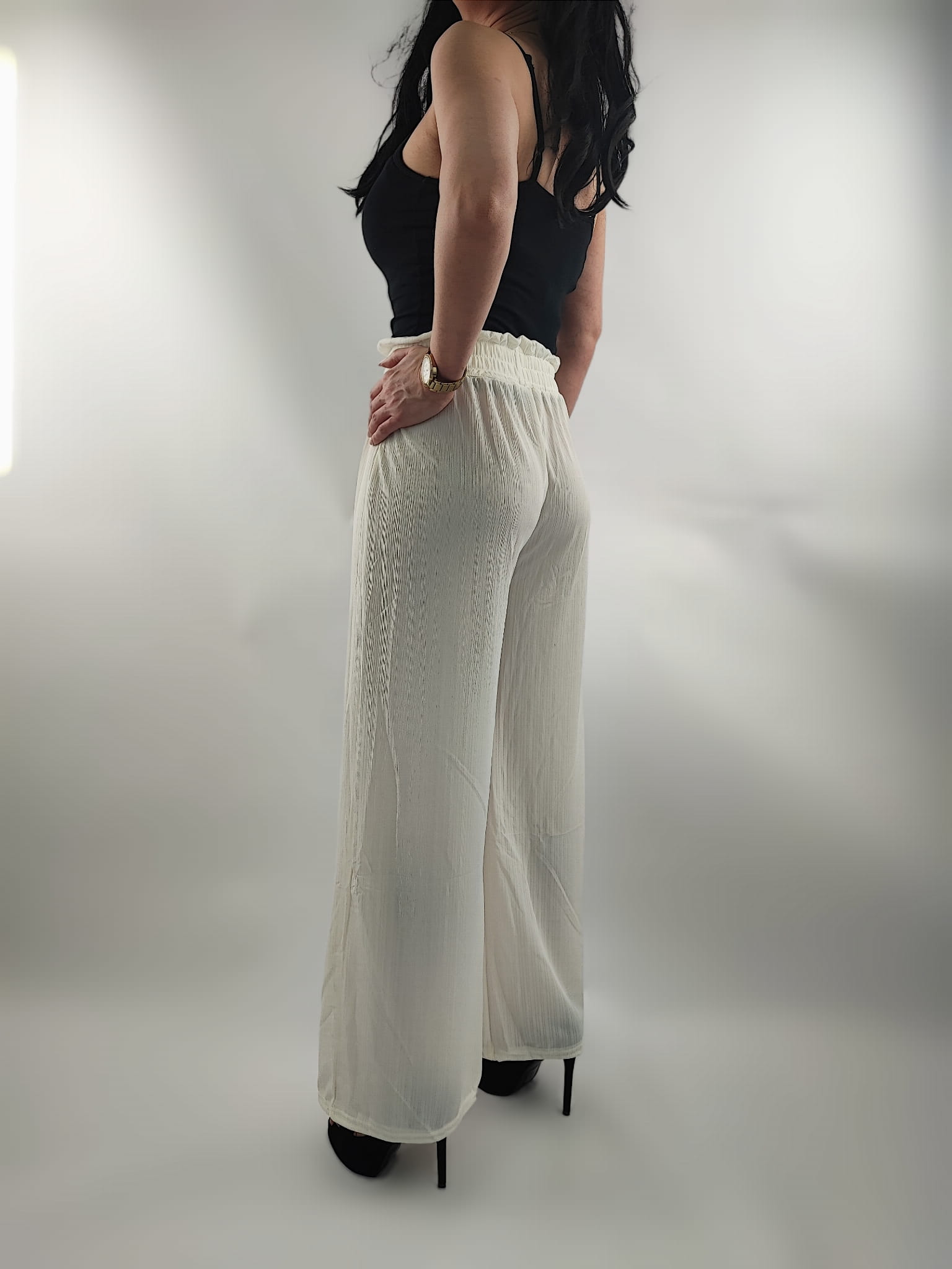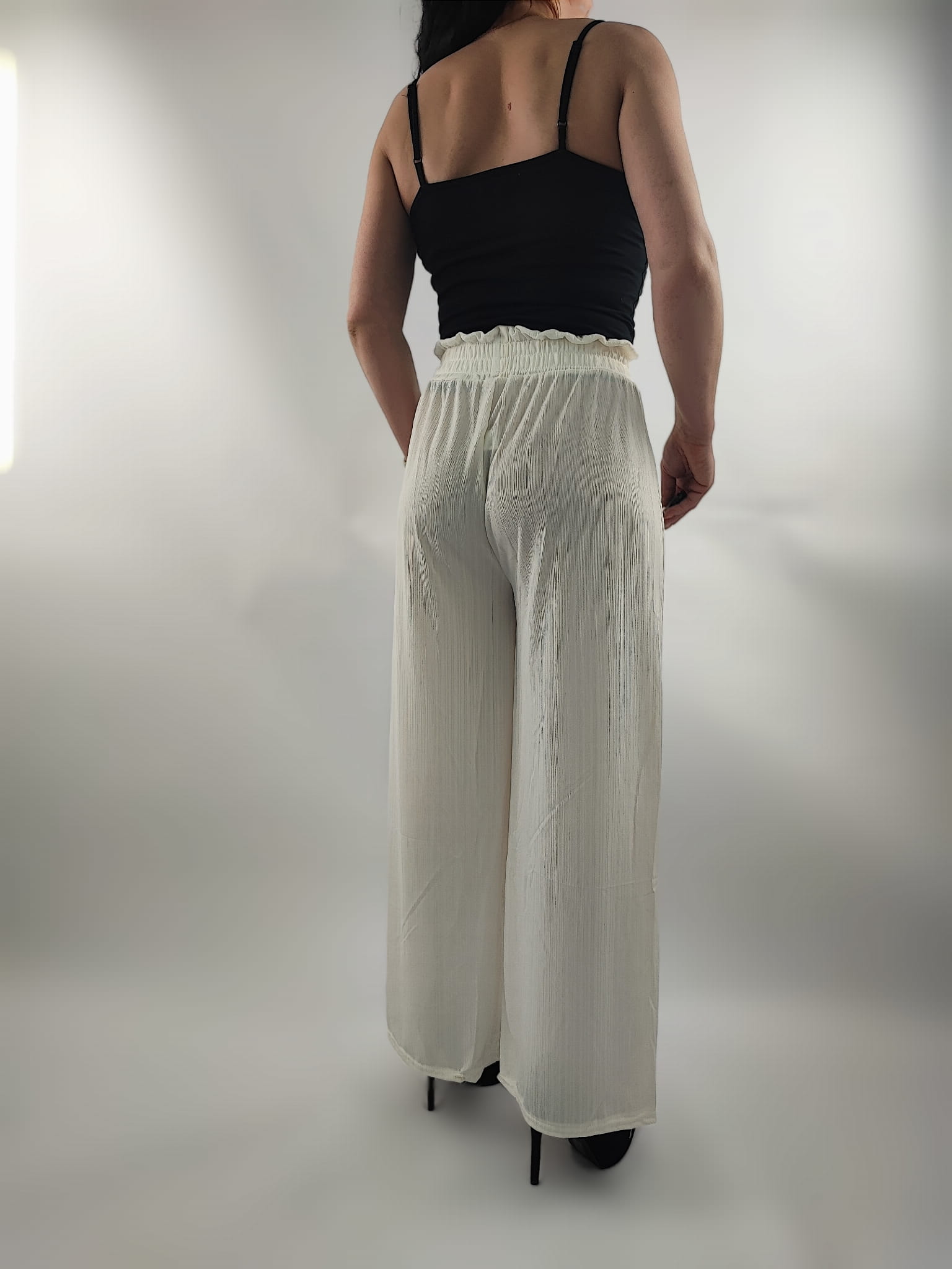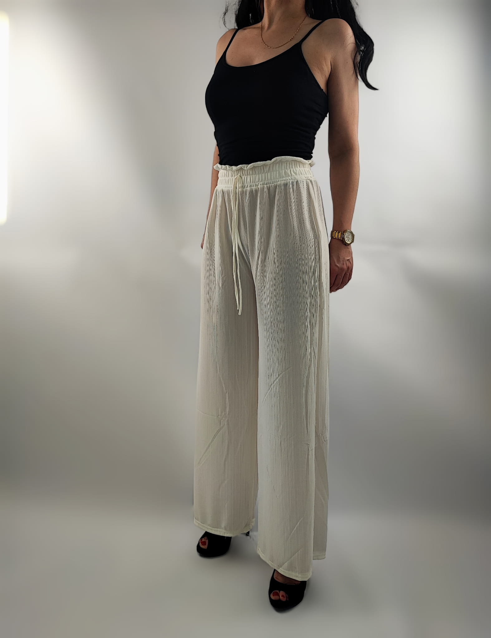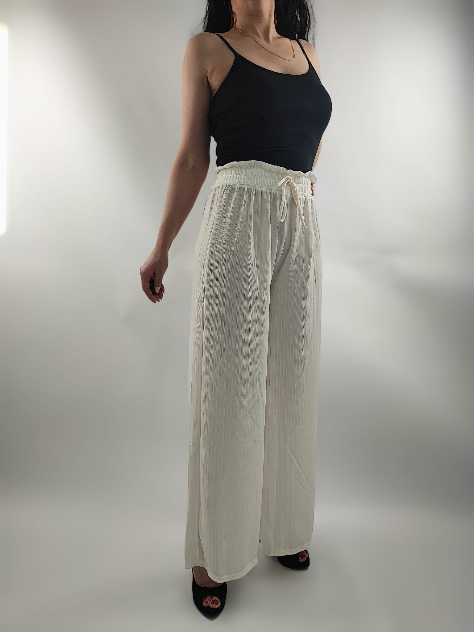 Drobno prążkowane spodnie z szerokimi nogawkami.
