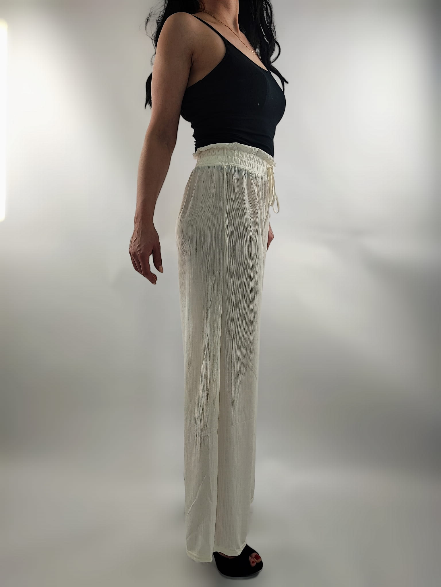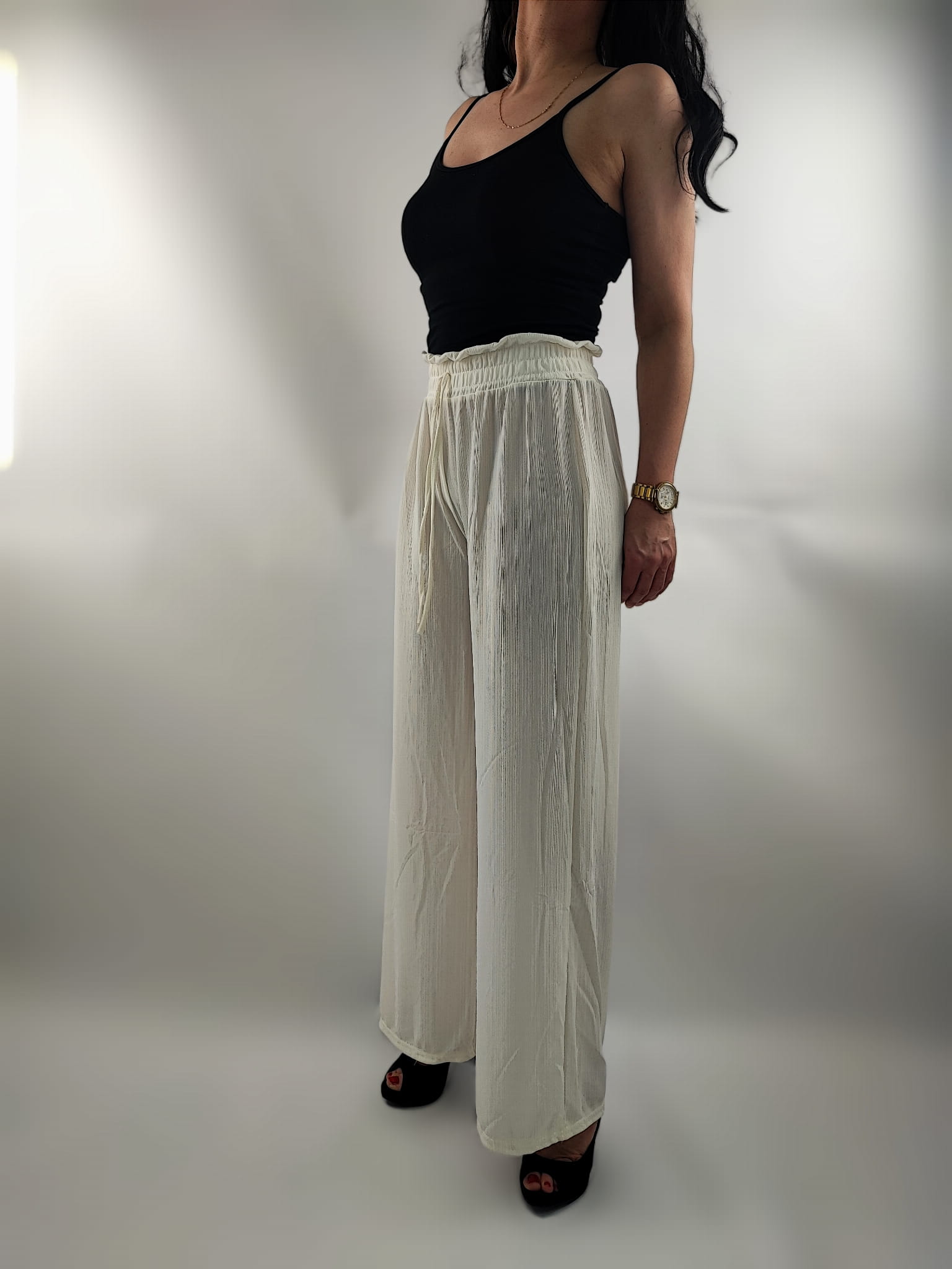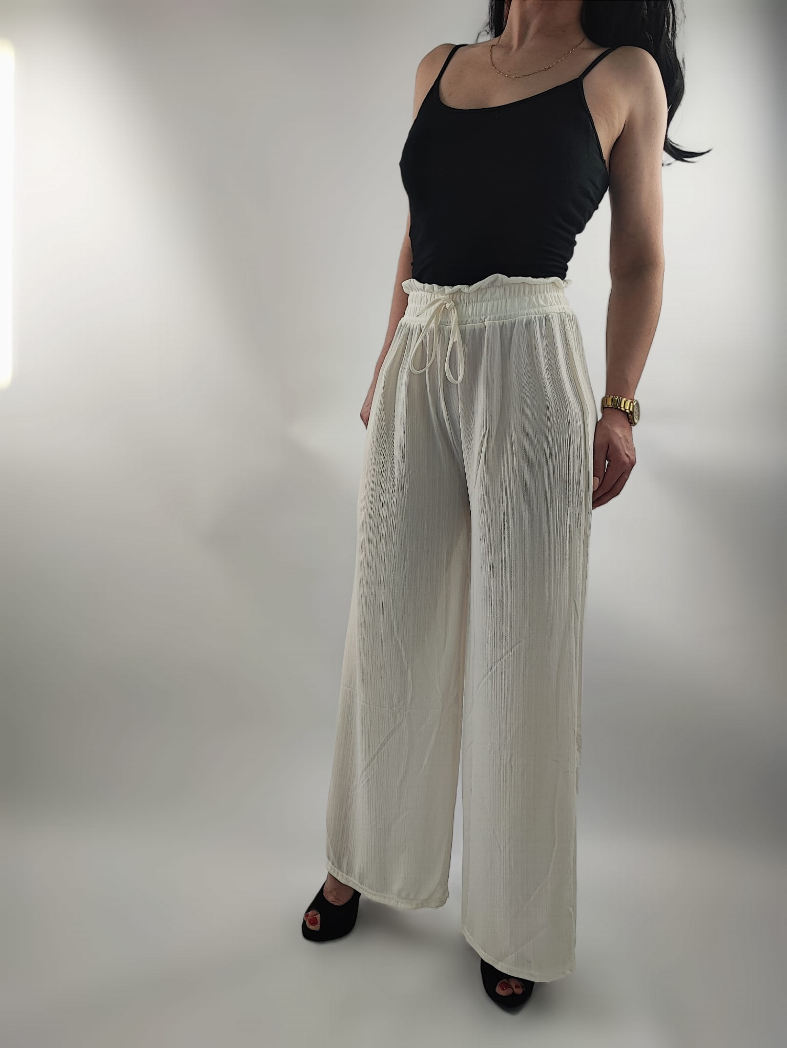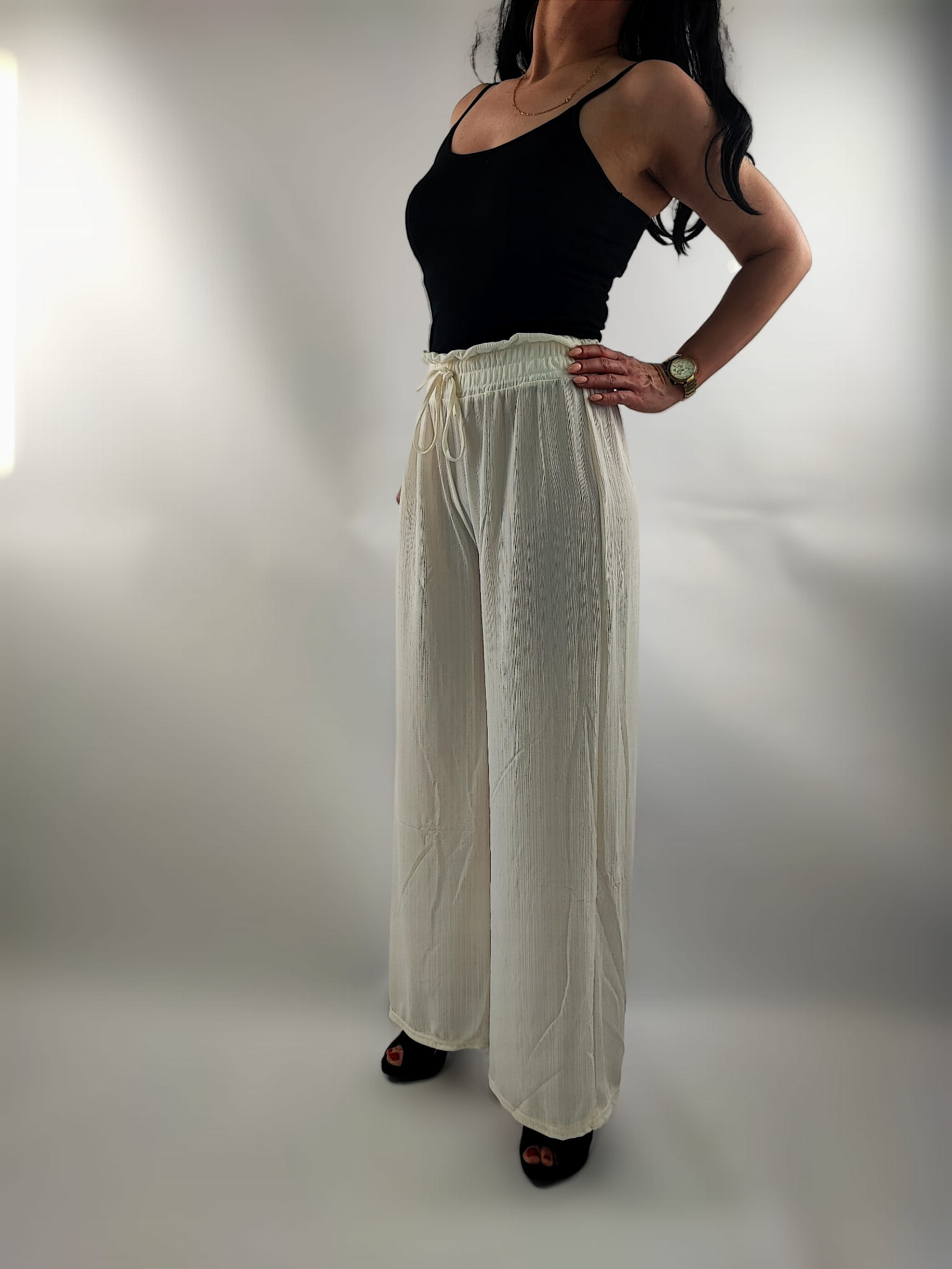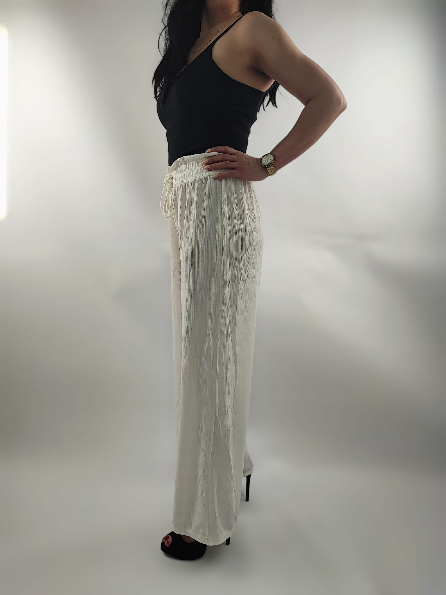 Drobno prążkowane spodnie z szerokimi nogawkami.