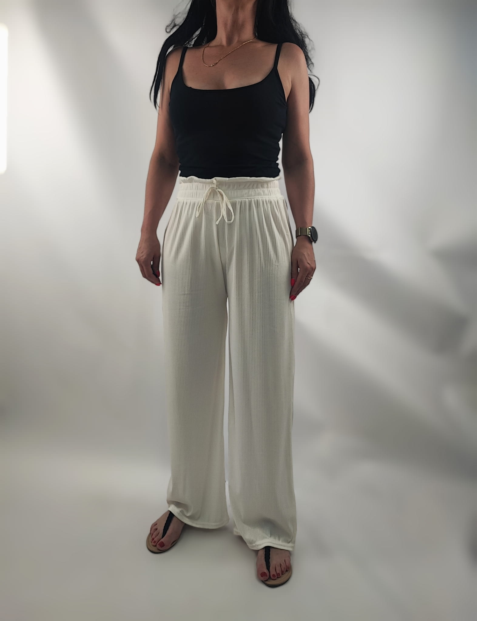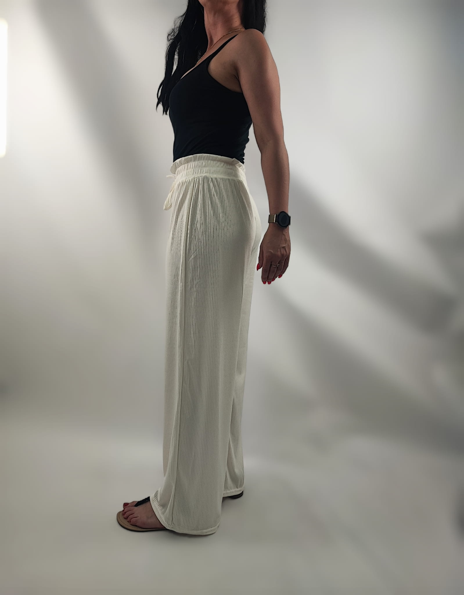 Spodnie są z wysokim stanem z szeroką gumką w pasie, dzięki czemu dopasowują się do talii + ozdobne troczki.