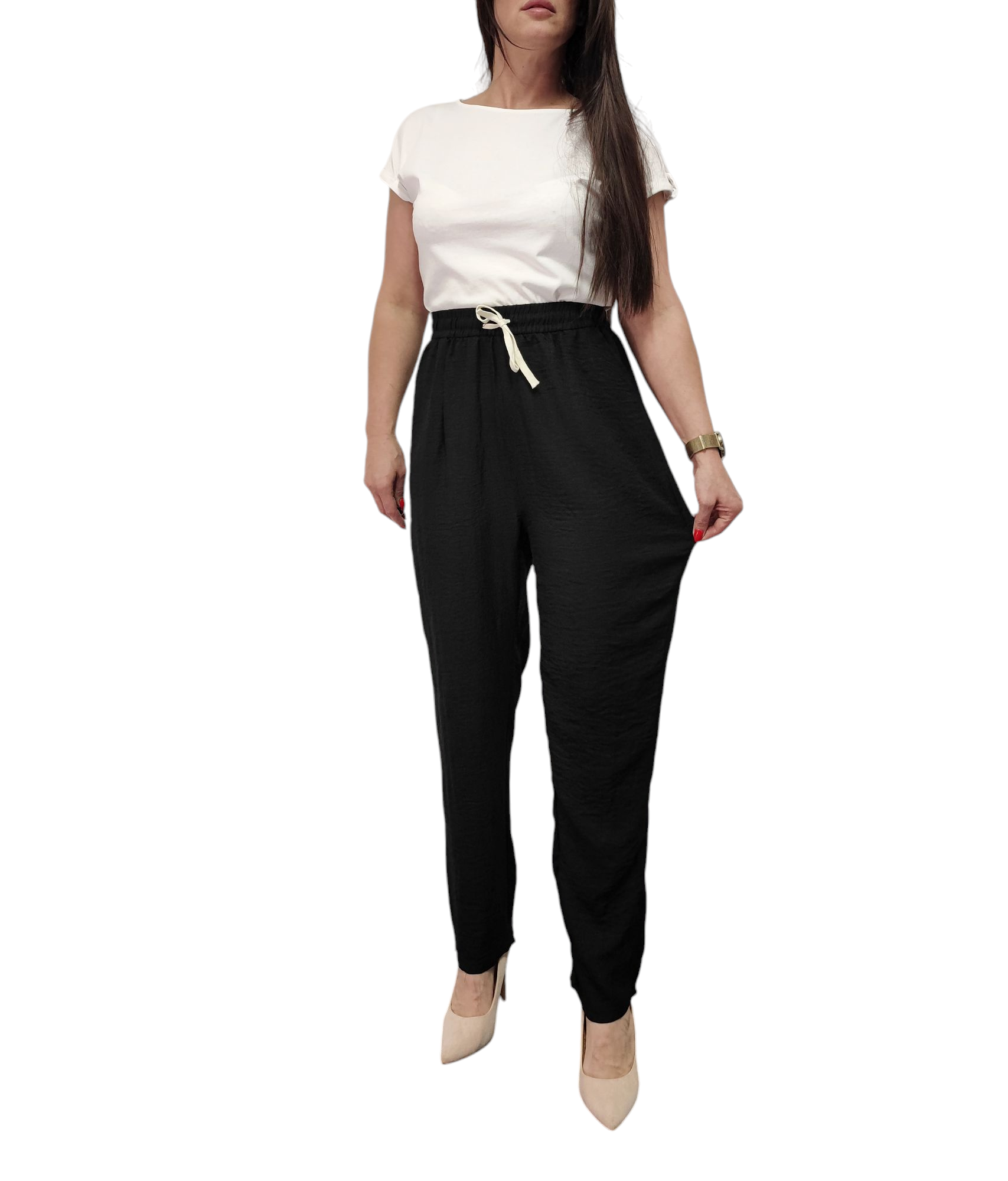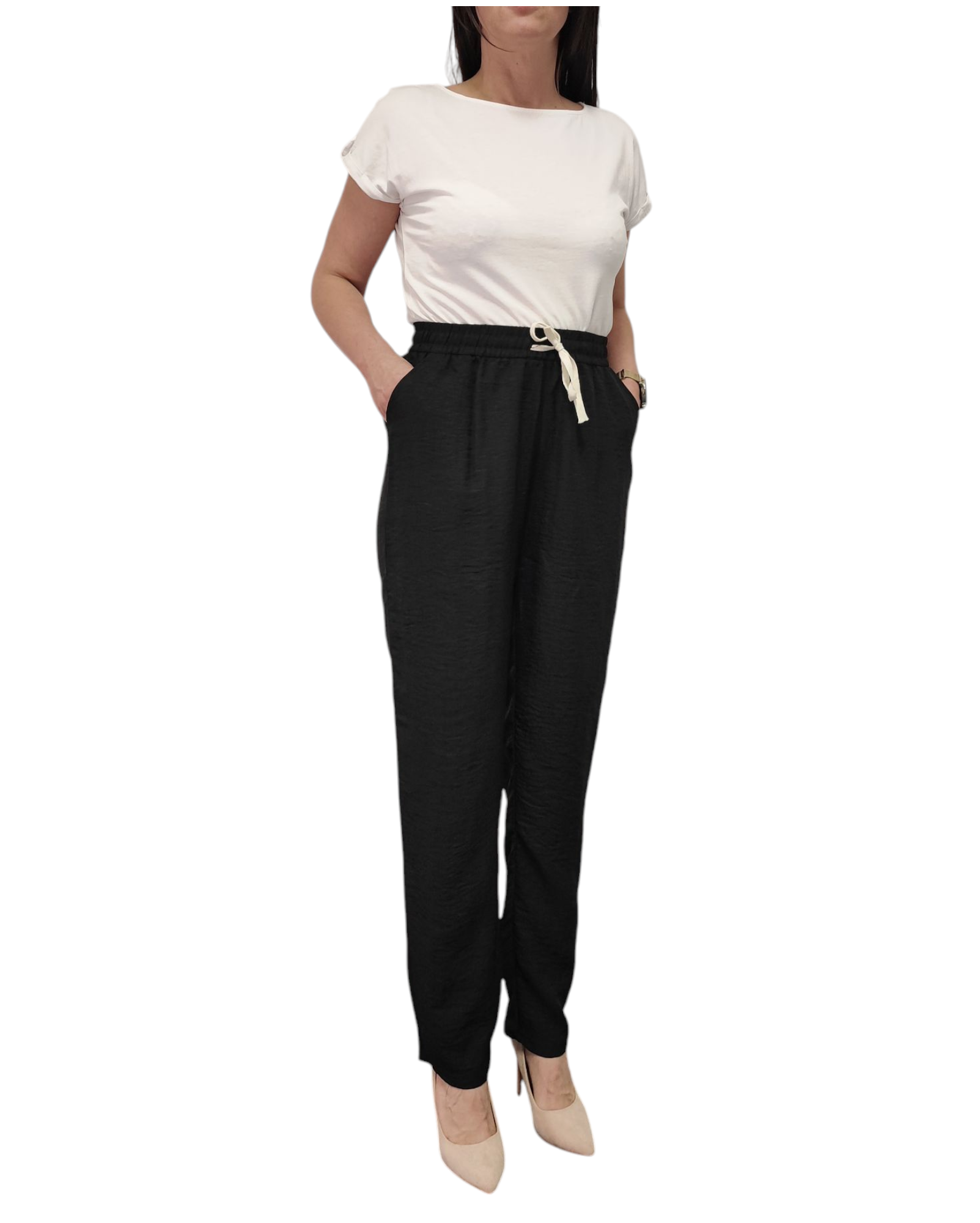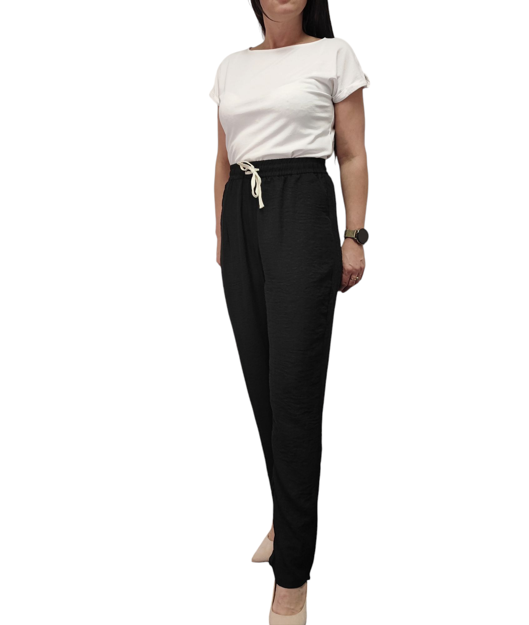 Spodnie Damskie z Materiału Szerokie Wysoki Stan Bawełna Lato Czarne