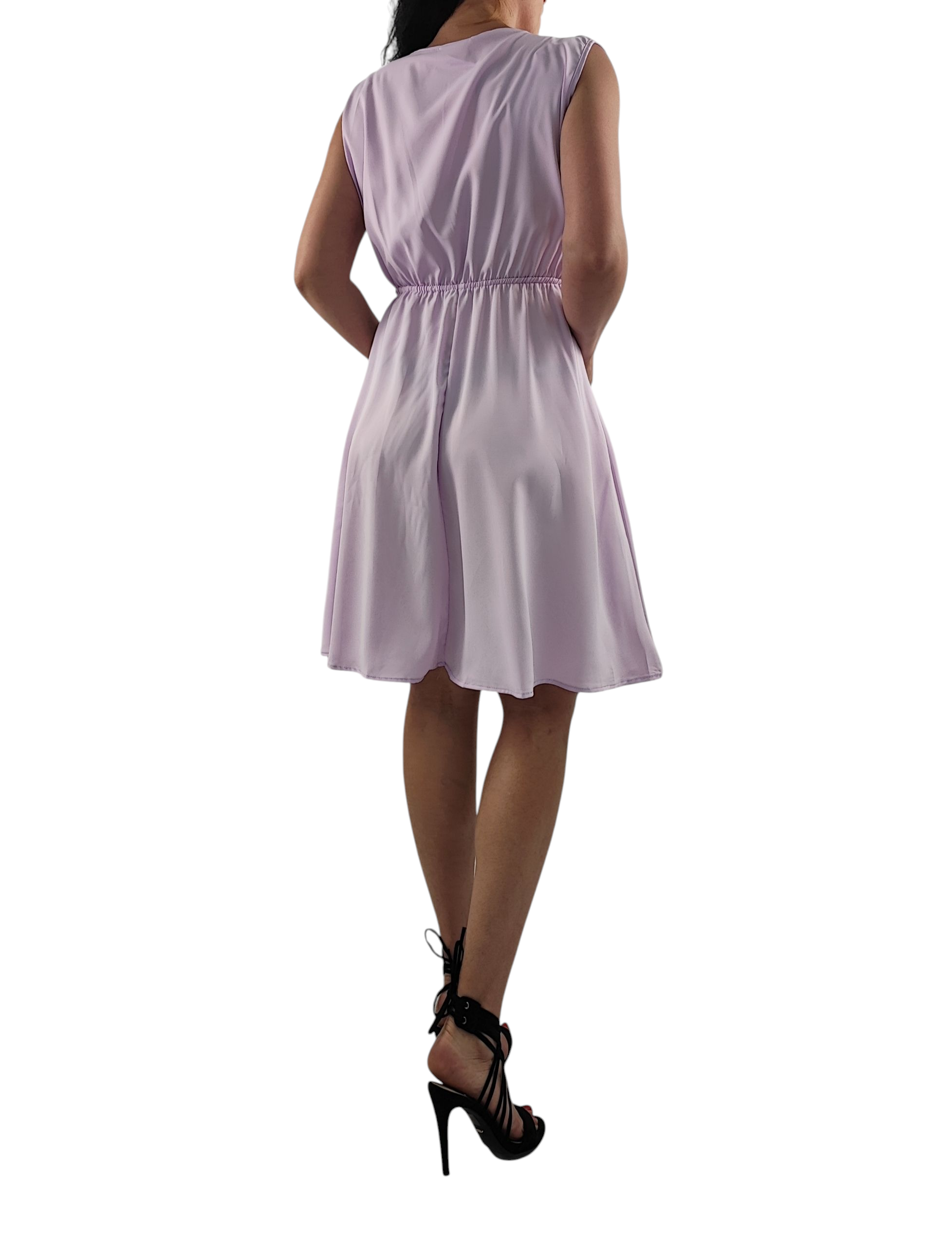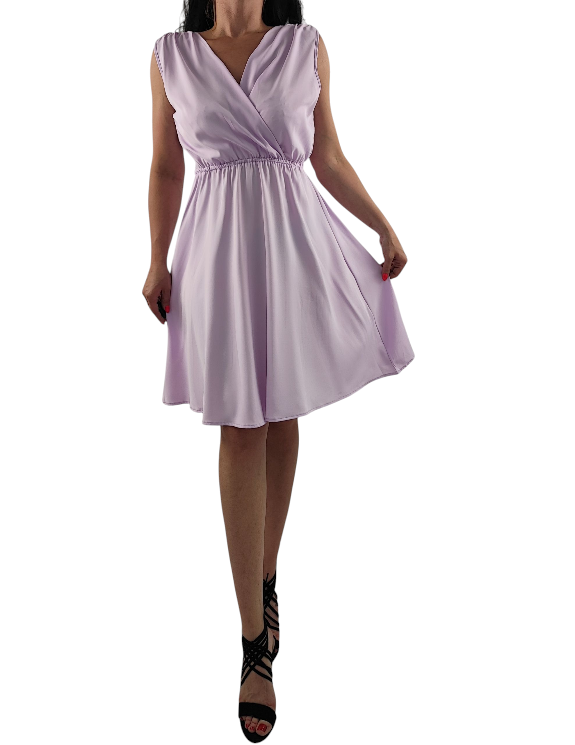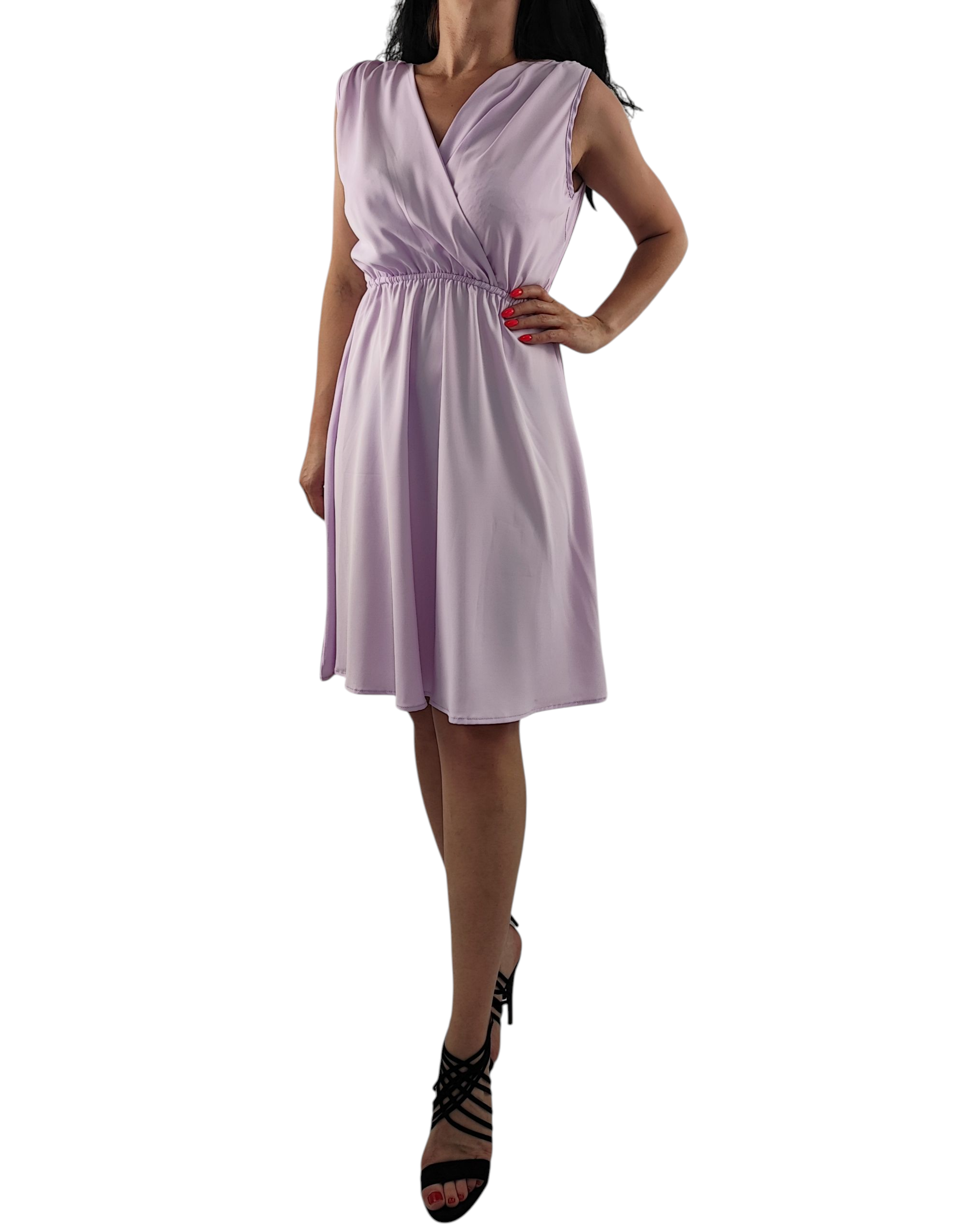Sukienka nie prześwituję. Dekolt kopertowy, bez rękawów. Gumka w pasie dzięki czemu sukienka przylega do ciała.