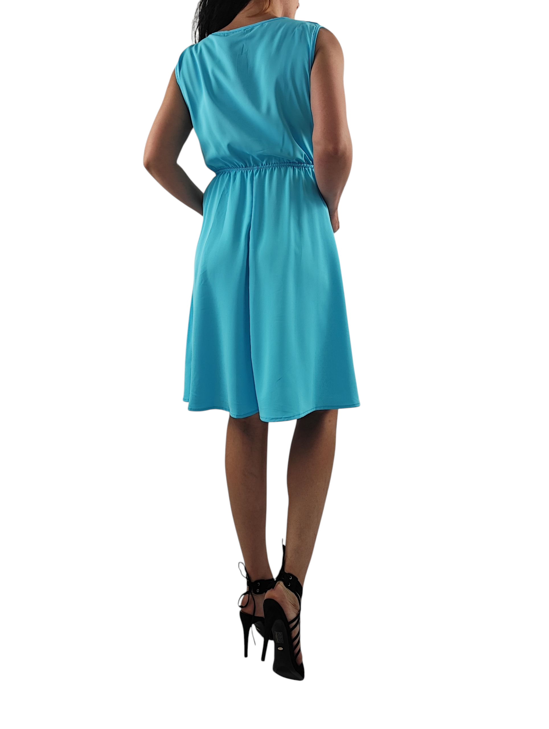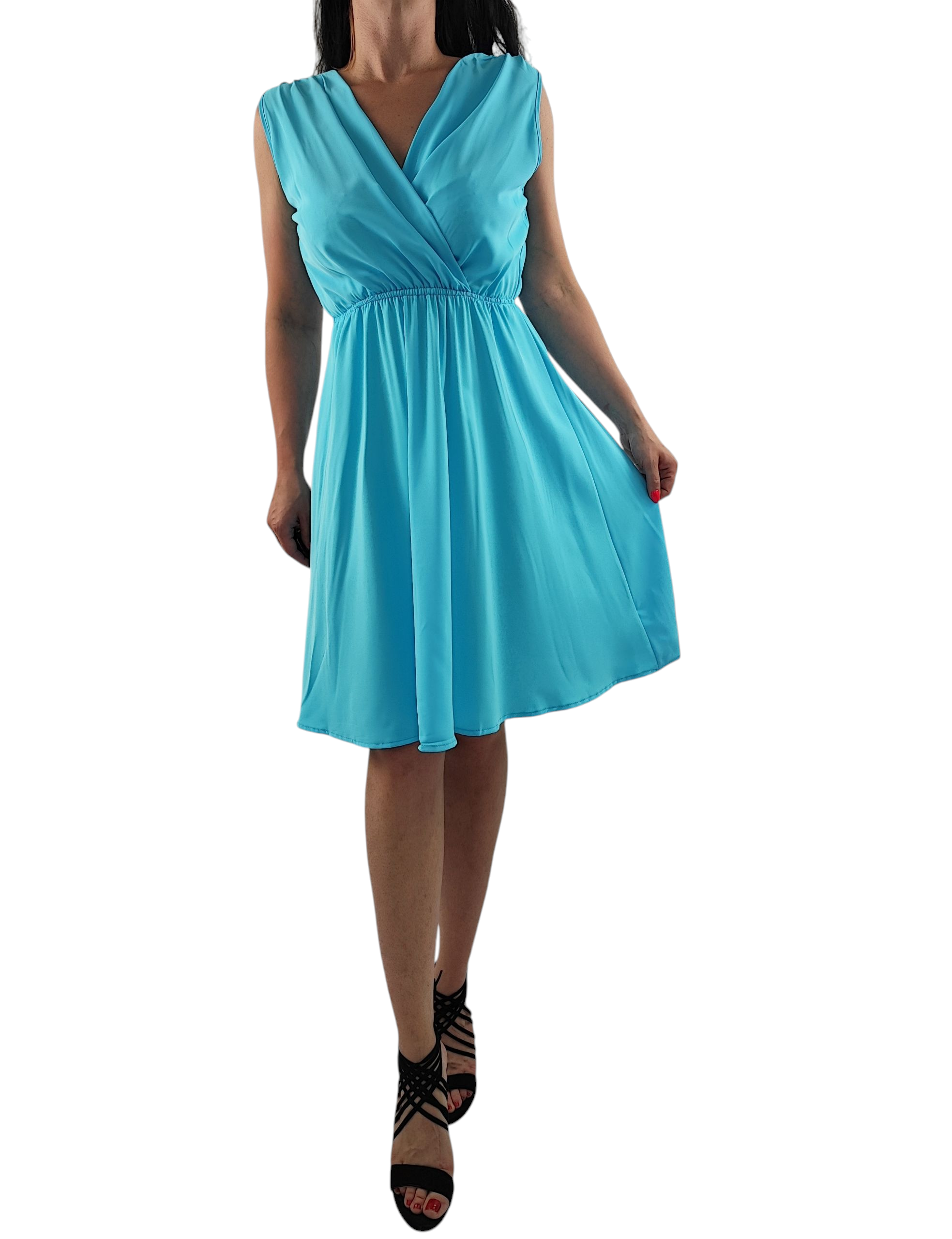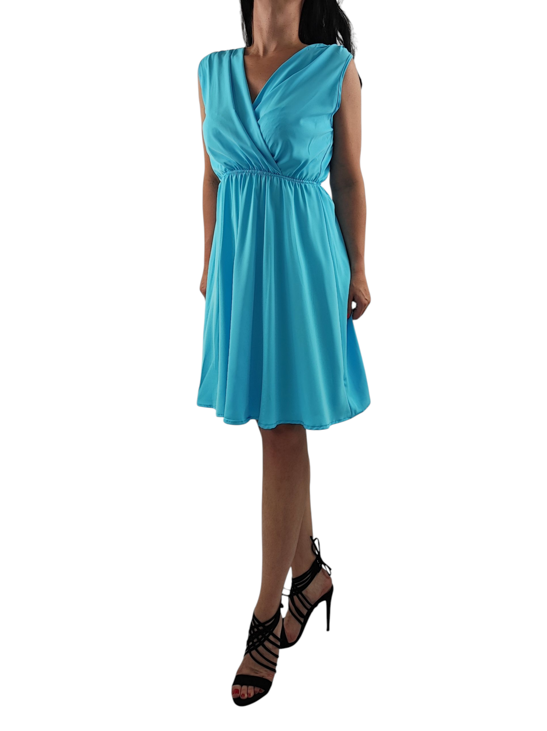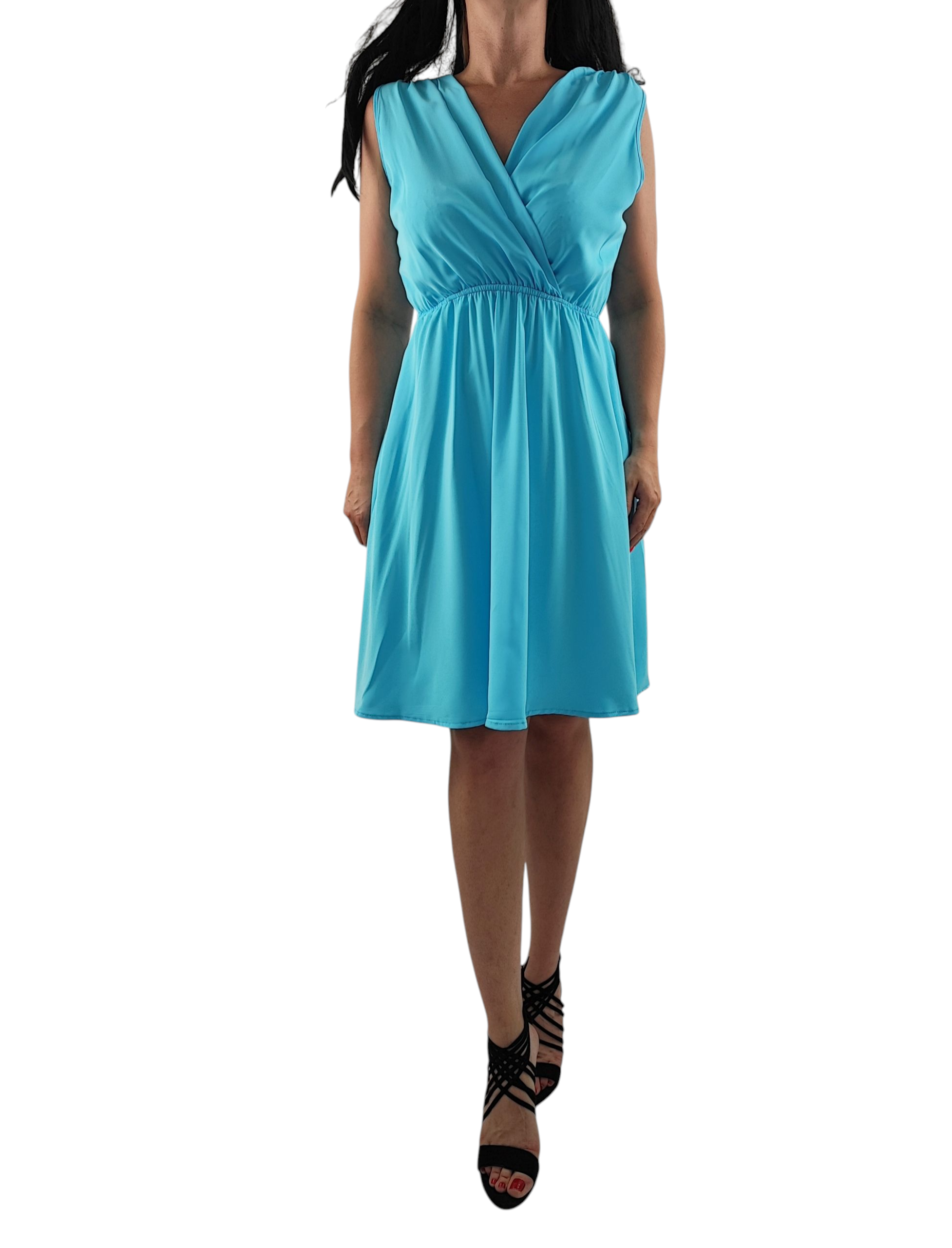 Sukienka nie prześwituję. Dekolt kopertowy, bez rękawów. Gumka w pasie dzięki czemu sukienka przylega do ciała.