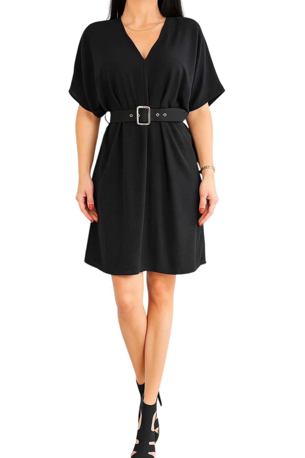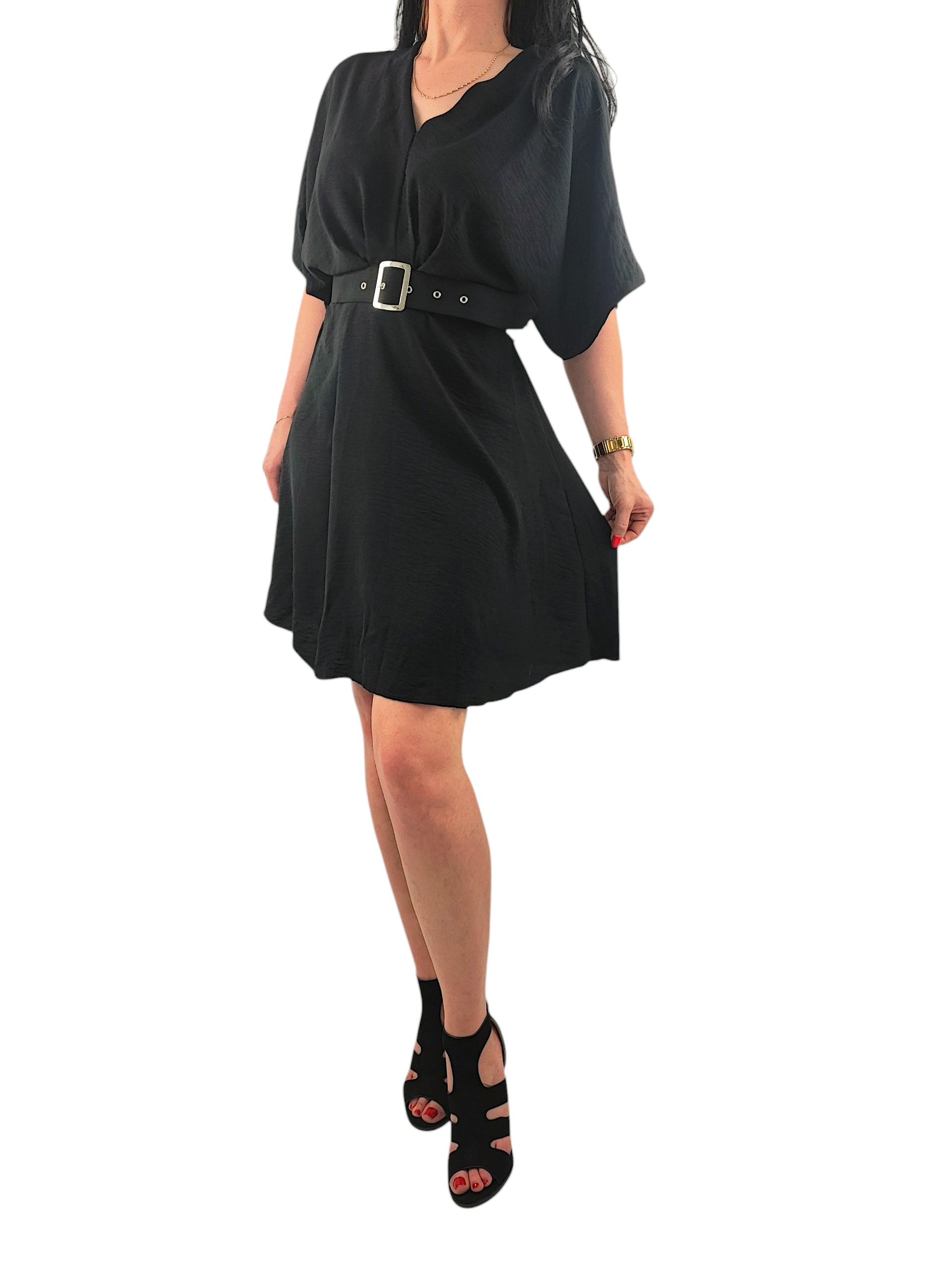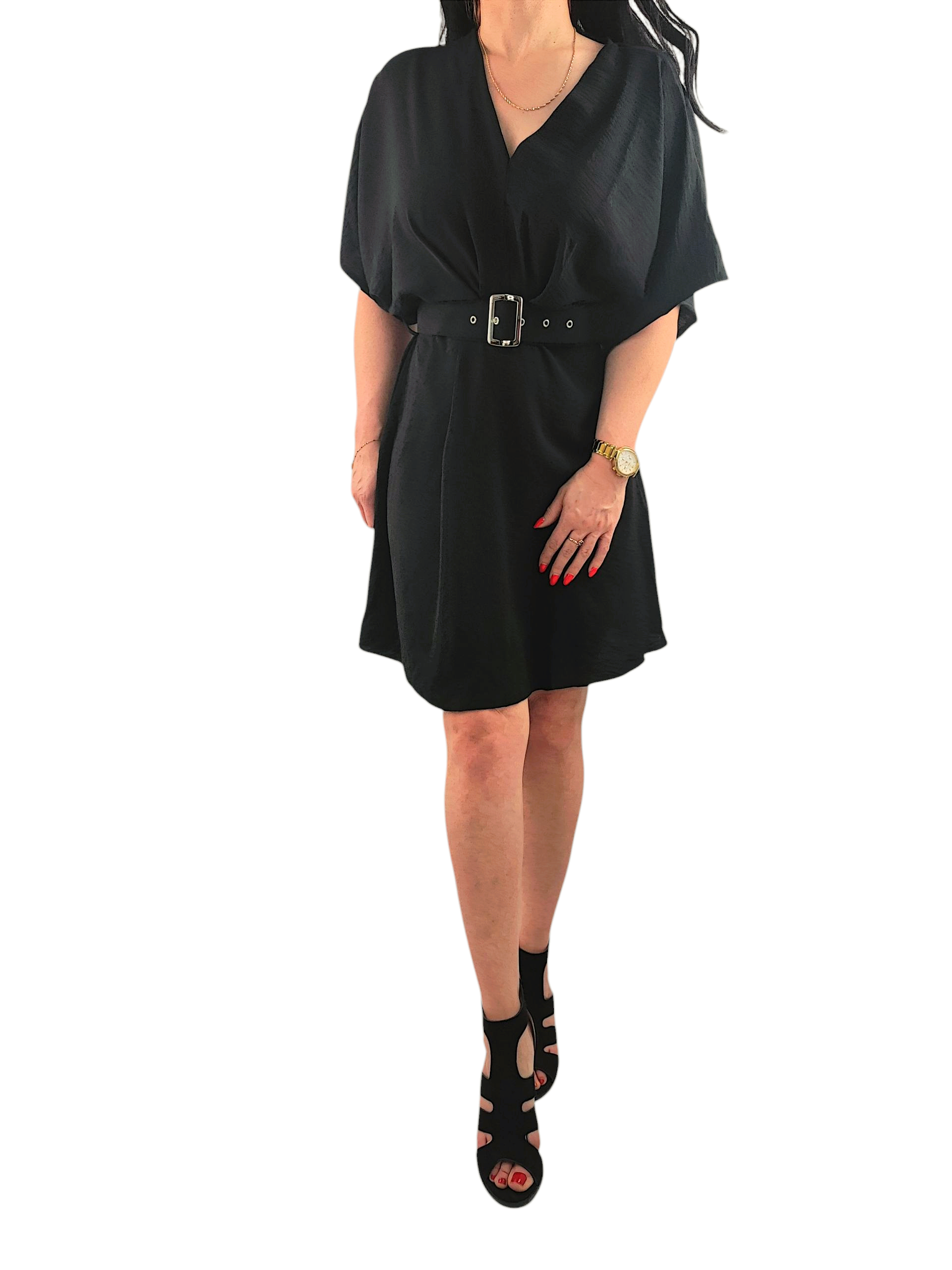 Sukienka Damska Krótki Szeroki Rękaw z Pasekiem Luźna Krótka Czarna