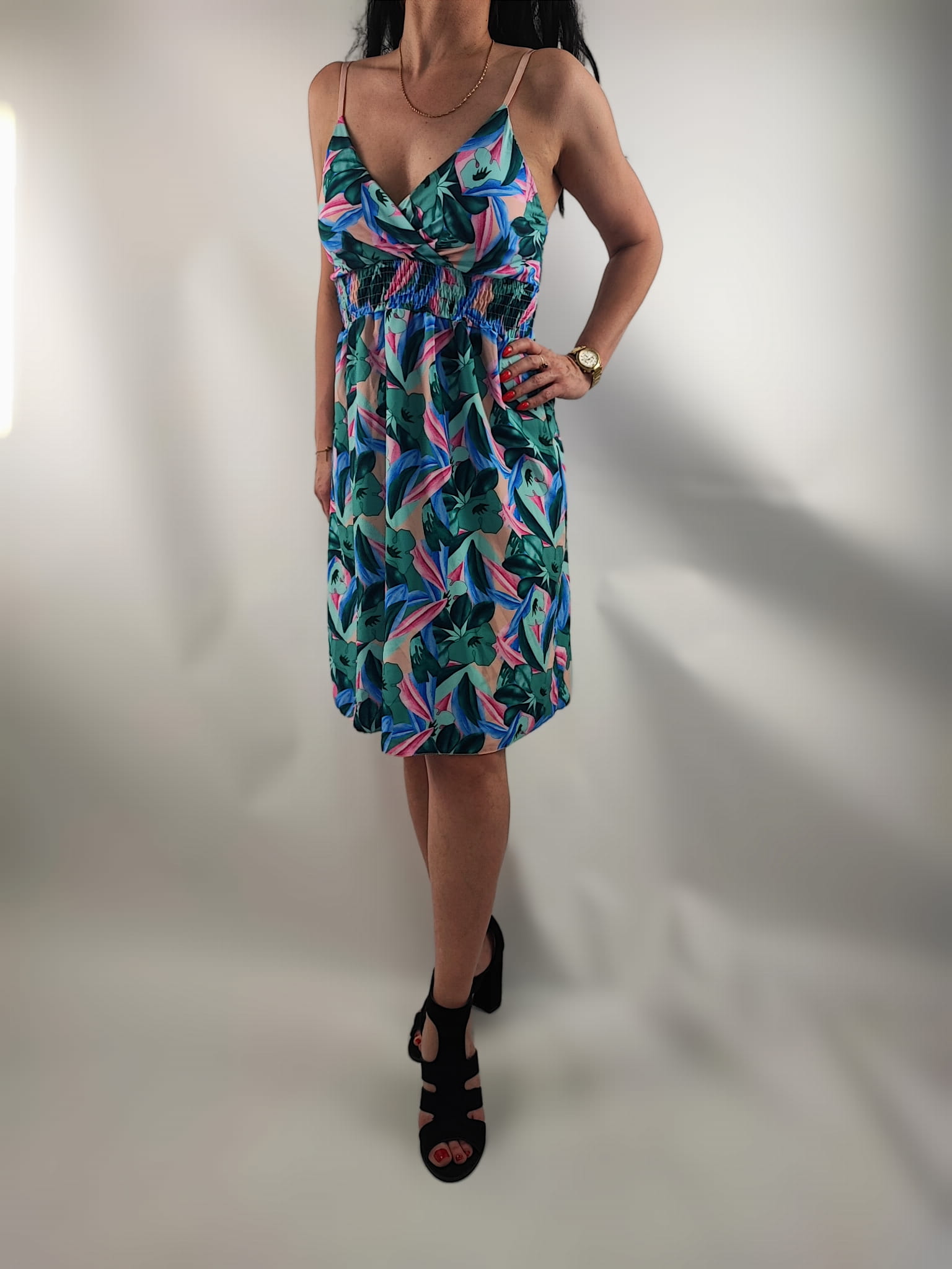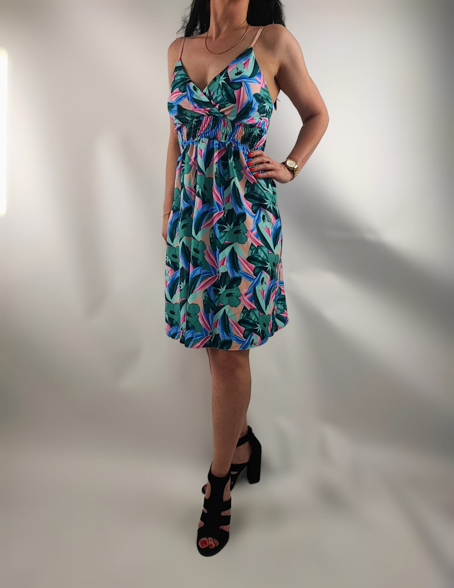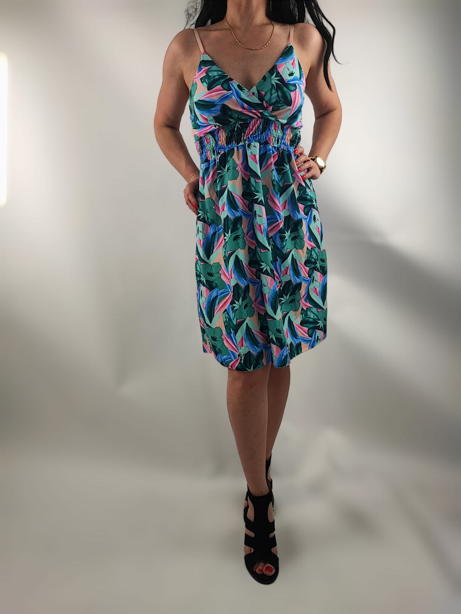 Sukienka nie prześwituję. Dekolt kopertowy. Cienkie regulowane ramiączka. Z tyłu sukienki na plecach wszyte małe gumeczki dzięki czemu sukienka przylega i nie odstaje. Z przodu w pasie wszyte drobne gumeczki dzięki czemu sukienka przylega do ciała.