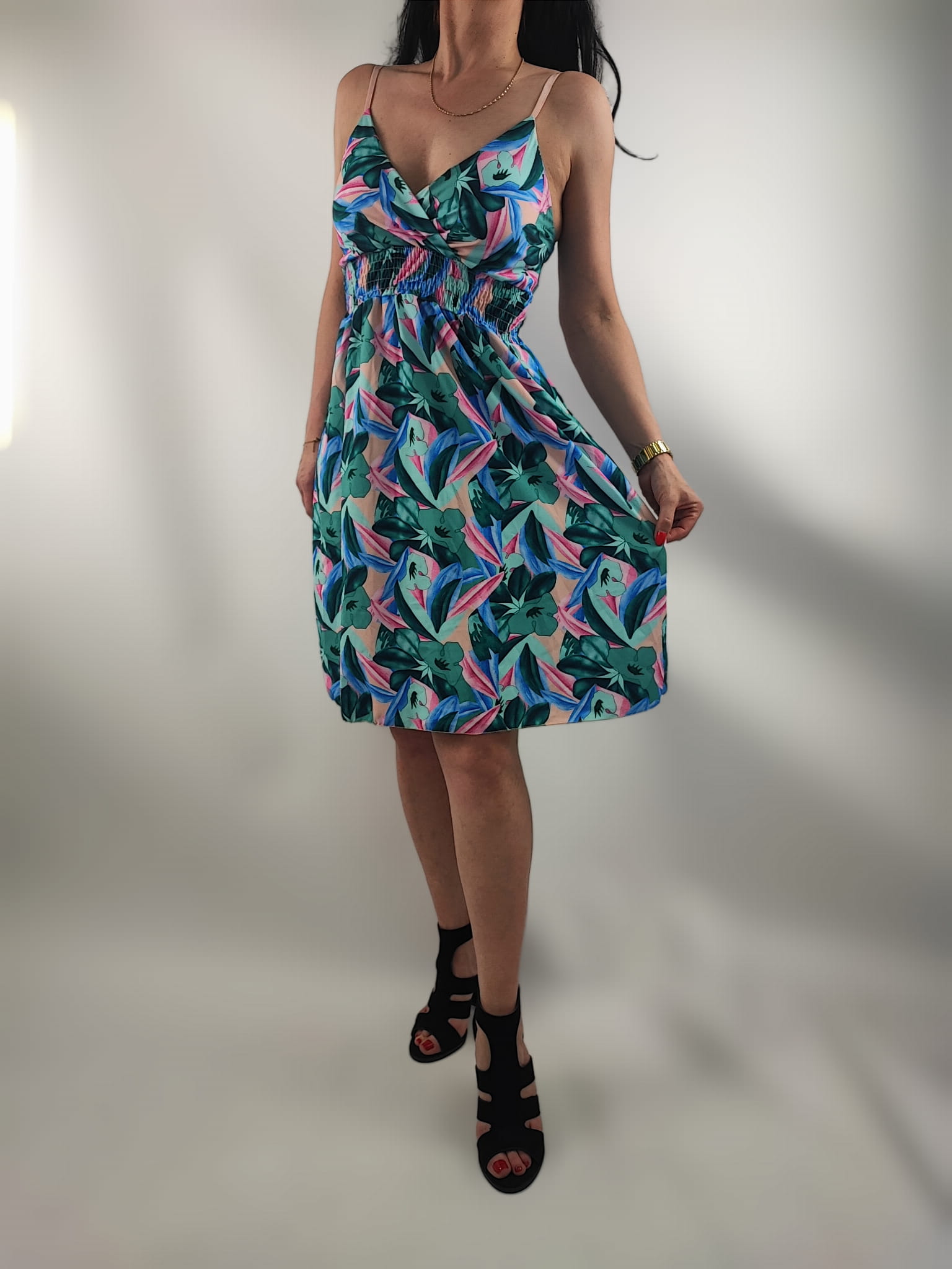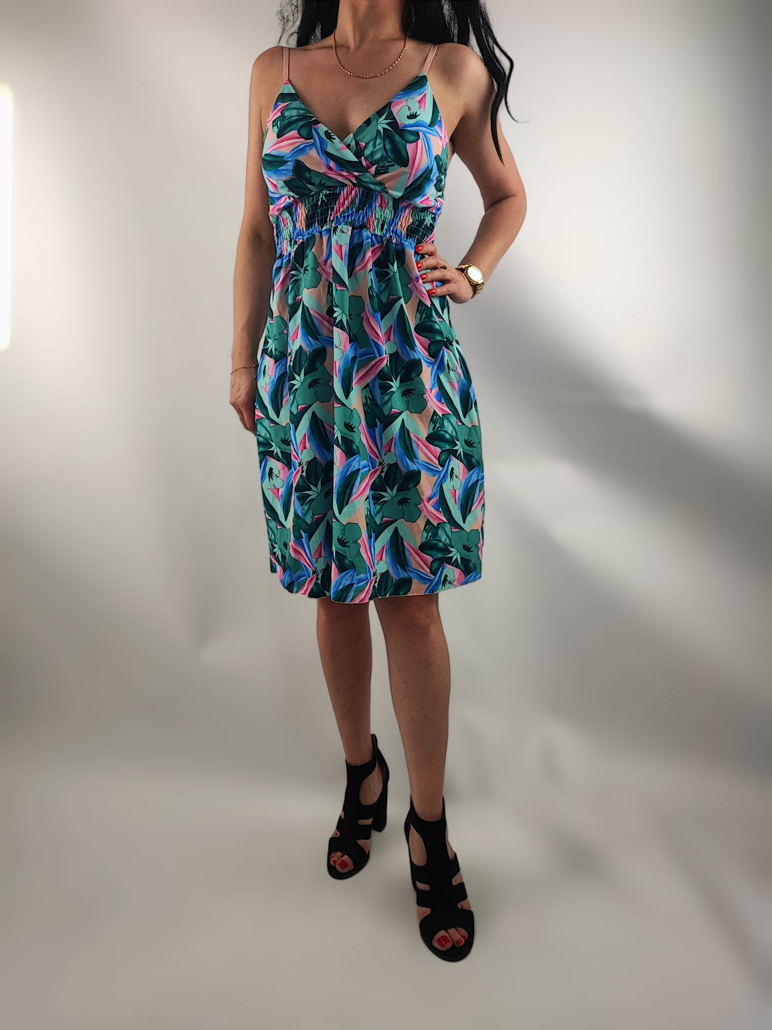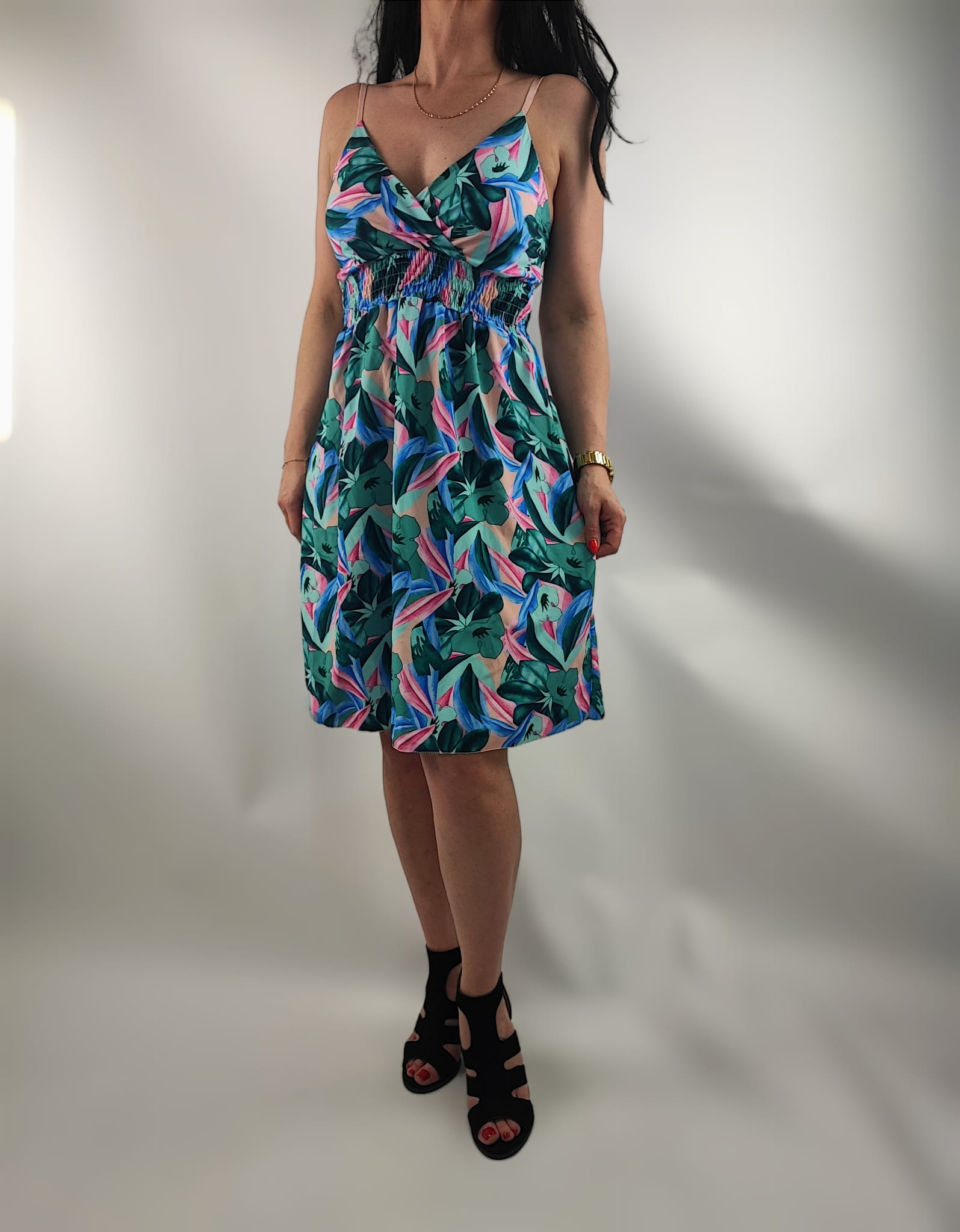Sukienka nie prześwituję. Dekolt kopertowy. Cienkie regulowane ramiączka. Z tyłu sukienki na plecach wszyte małe gumeczki dzięki czemu sukienka przylega i nie odstaje. Z przodu w pasie wszyte drobne gumeczki dzięki czemu sukienka przylega do ciała.