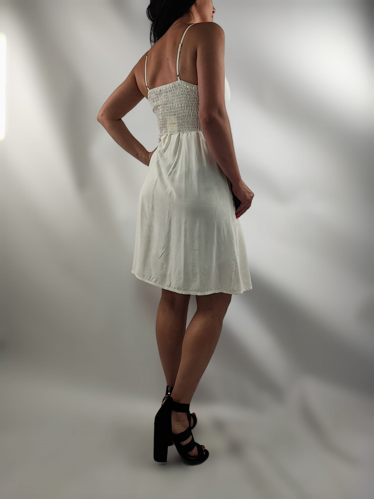 Sukienka jest przewiewna. Cienkie regulowane ramiączka. Z tyłu sukienki na plecach wszyte małe gumeczki dzięki czemu sukienka przylega i nie odstaje. W biuście posiada gąbki dzięki czemu nie trzeba nosić stanika, gąbki można przesuwać co umożliwia ułożenie i dopasowanie ich do biustu. Wiązana w biuście