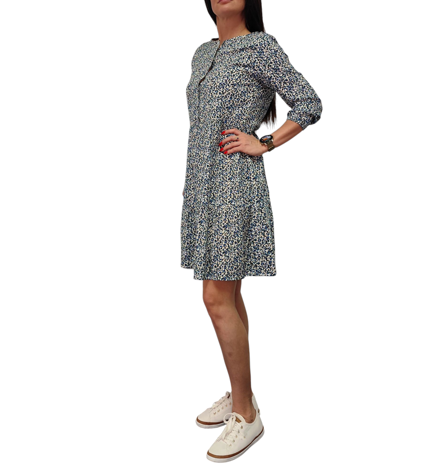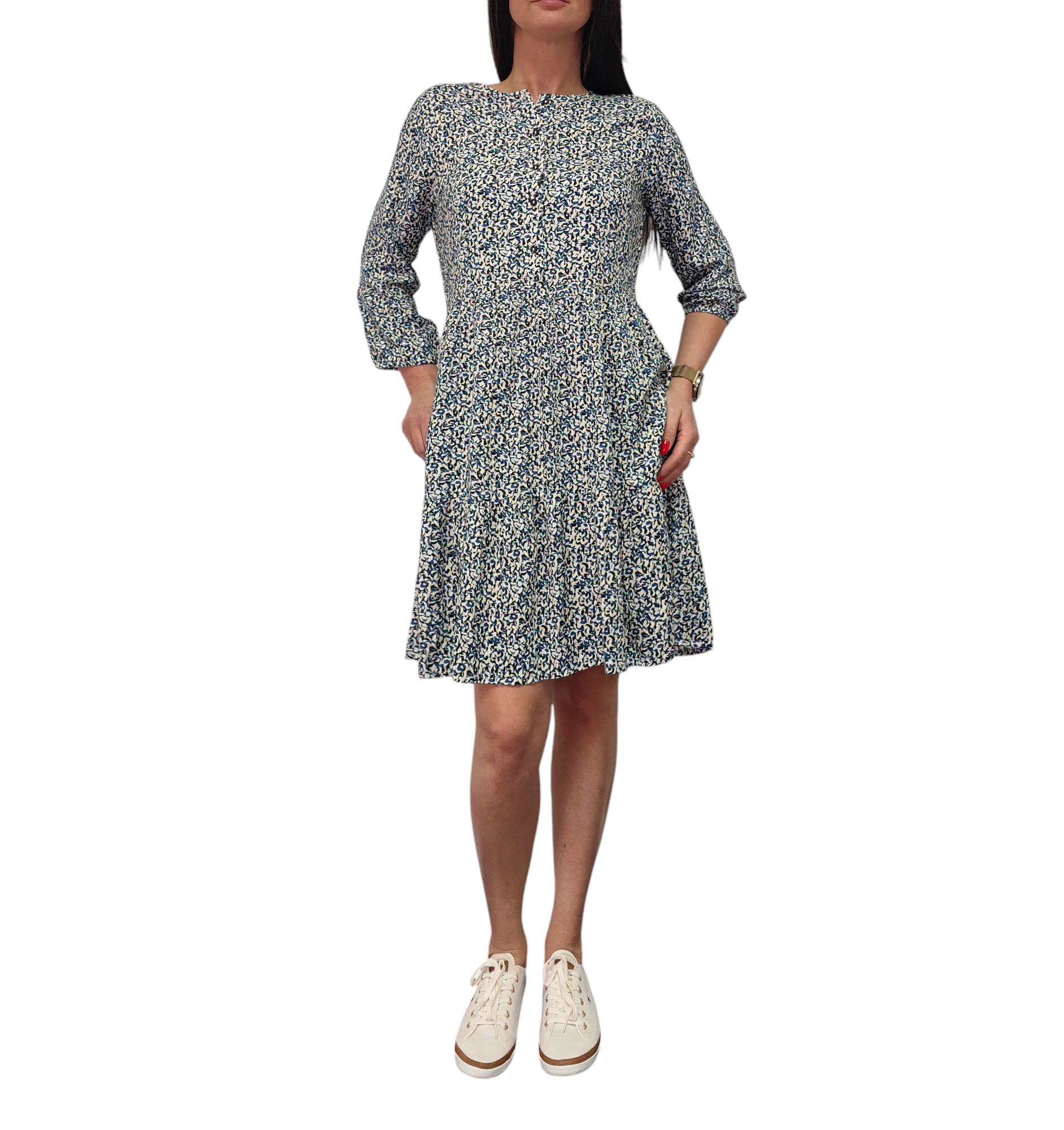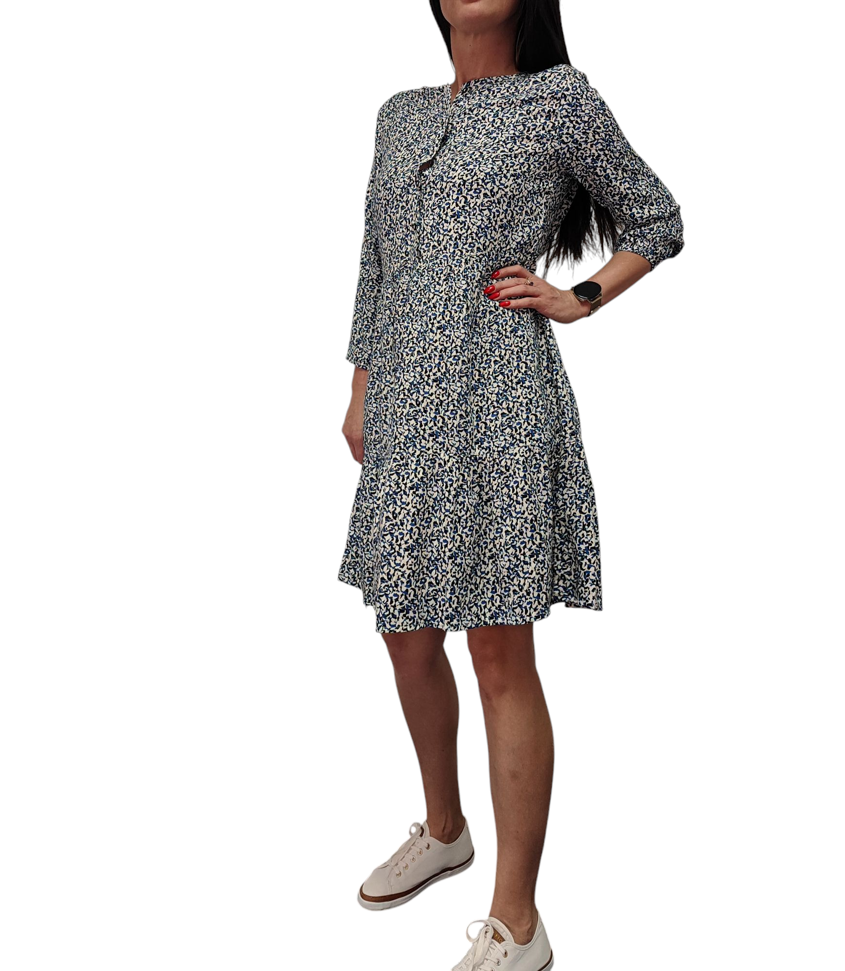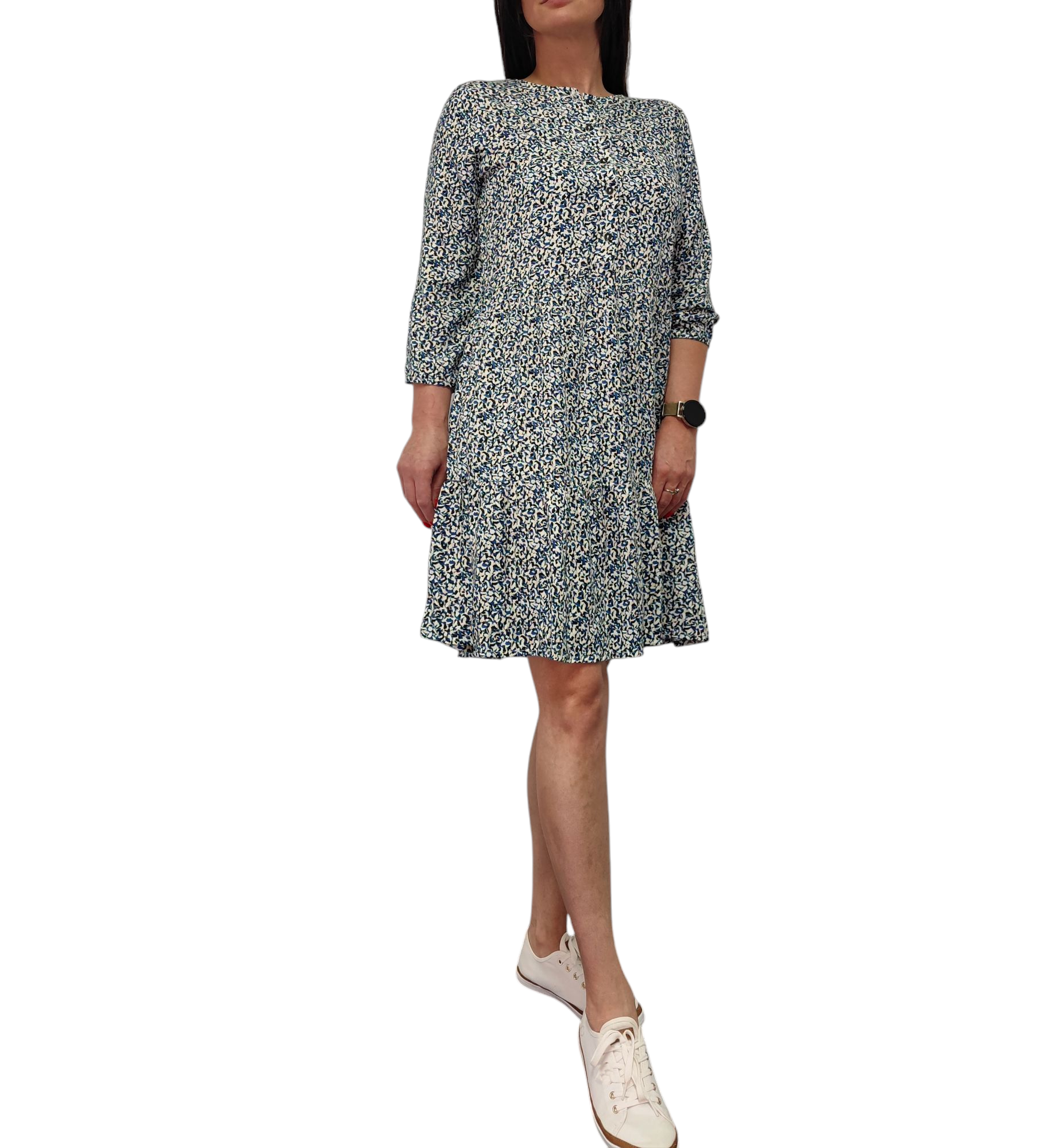 Kolor sukienki jest mieszany: niebieski, biały, kremowy, czarny