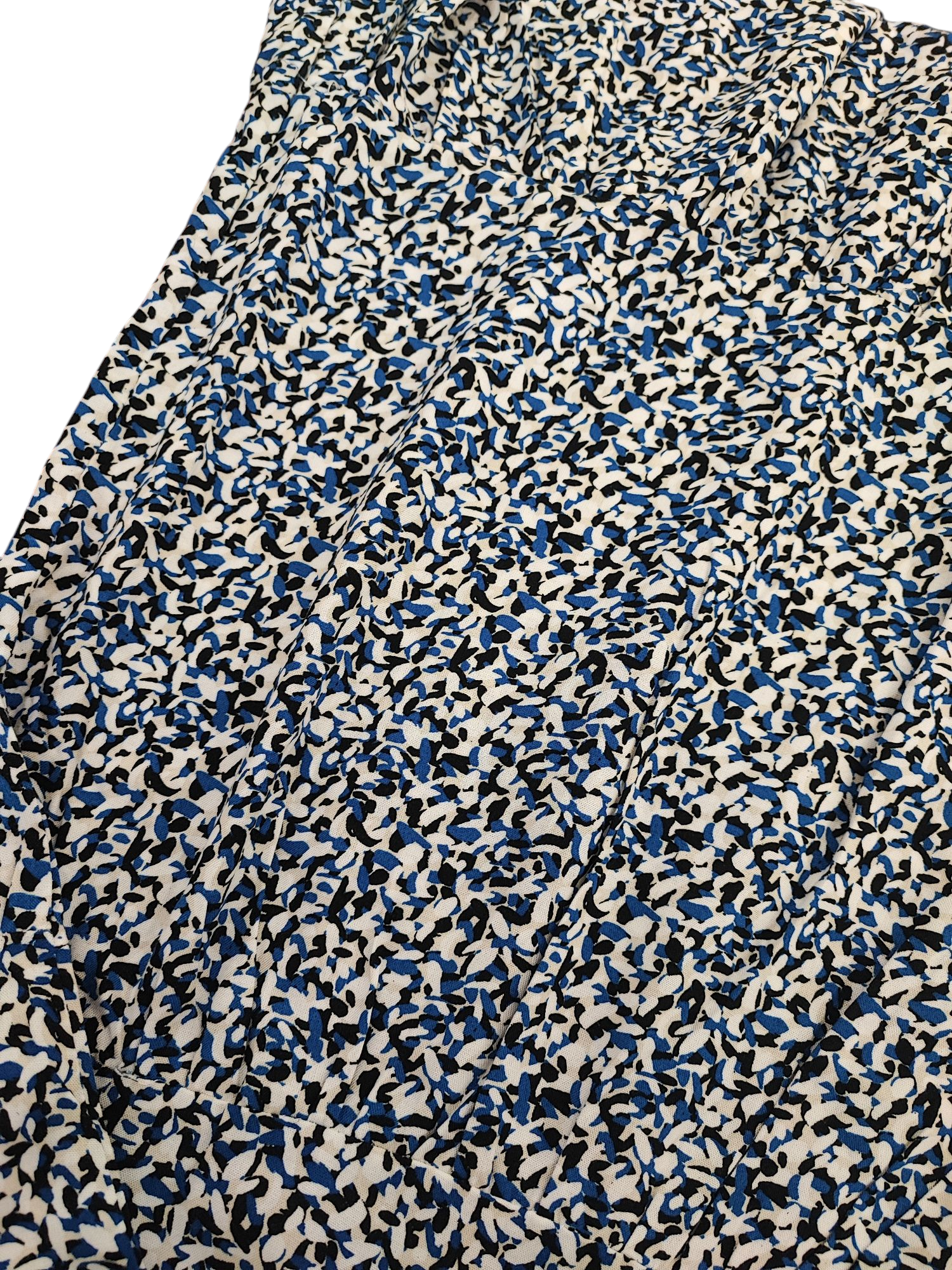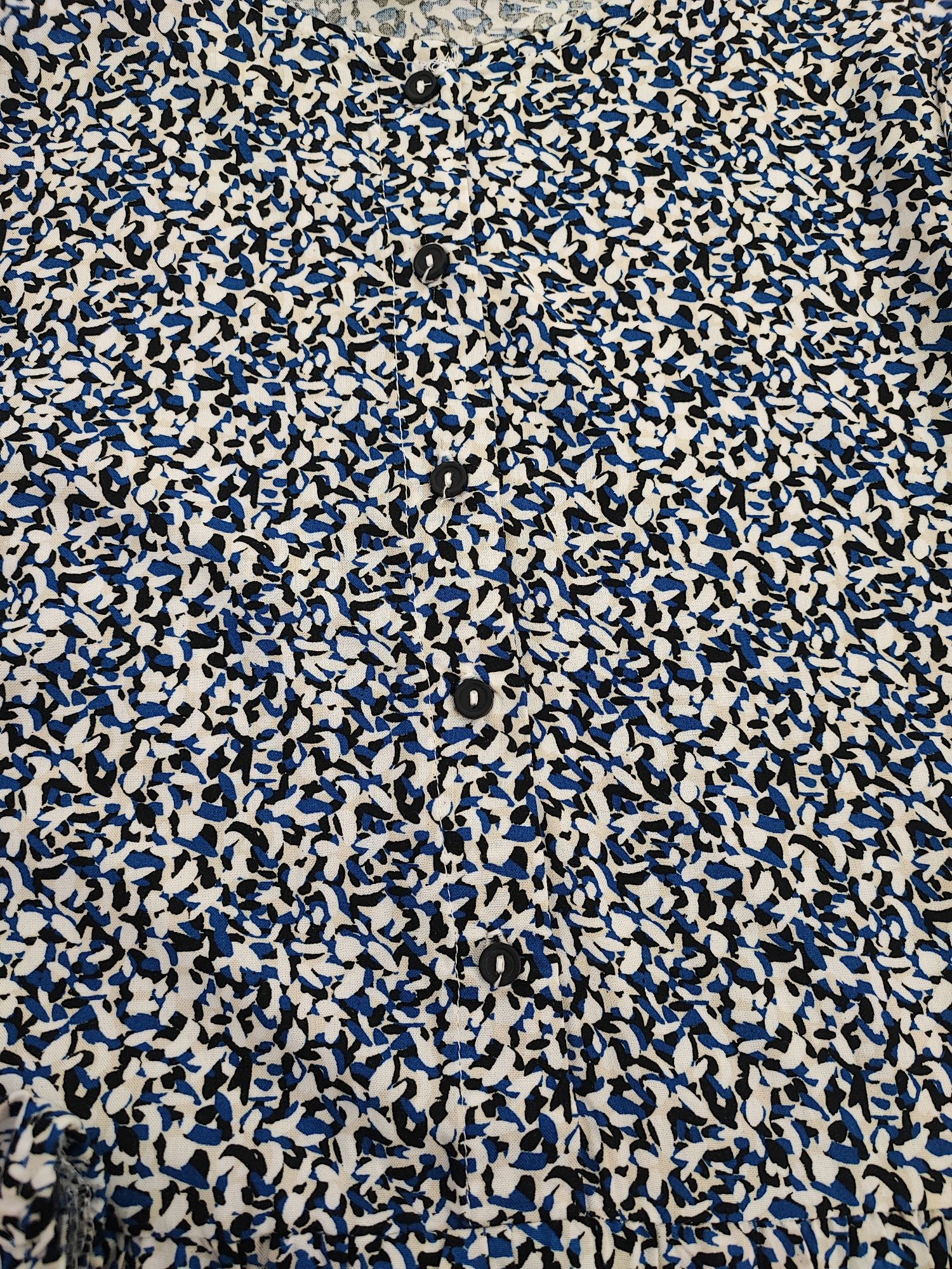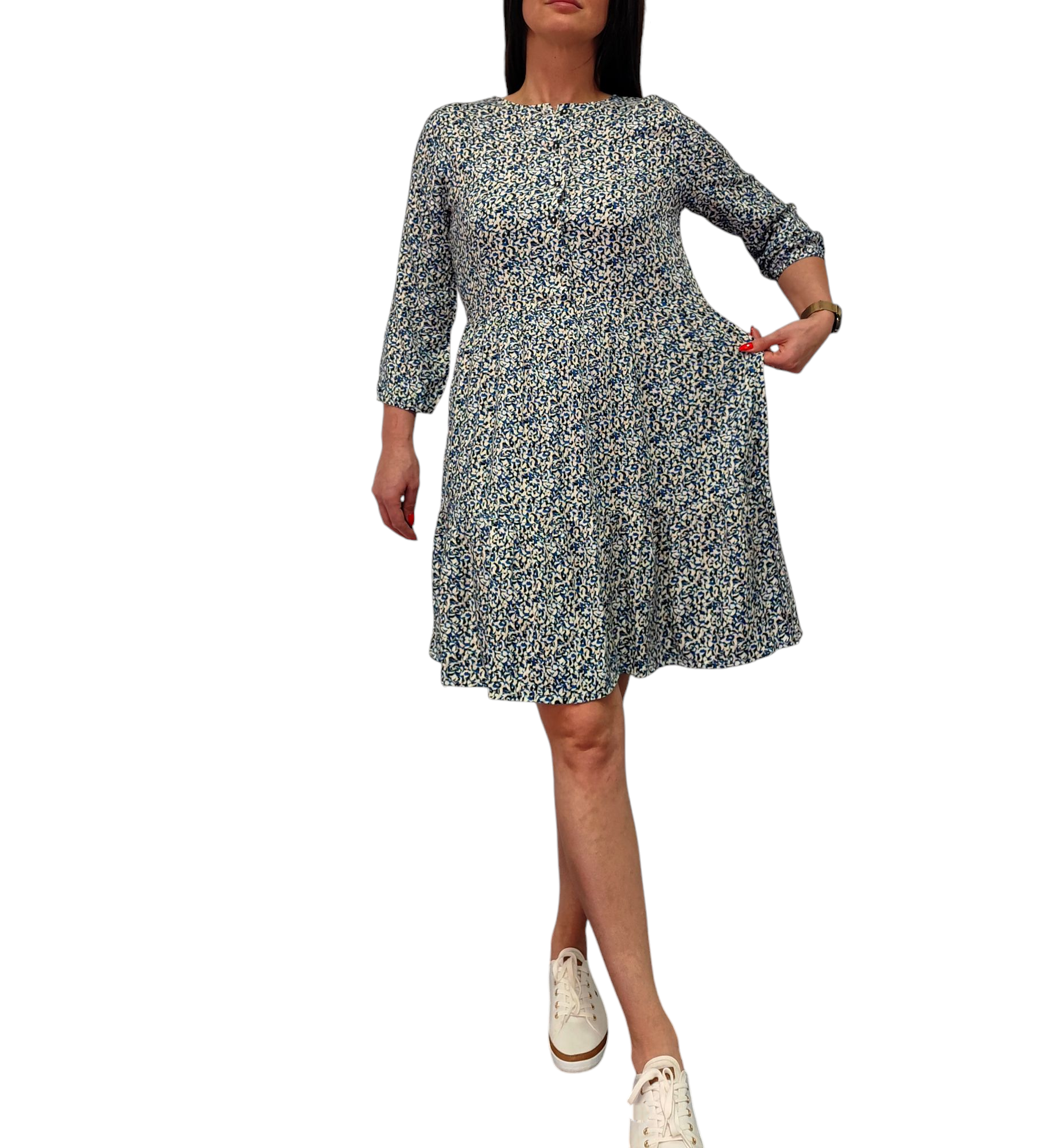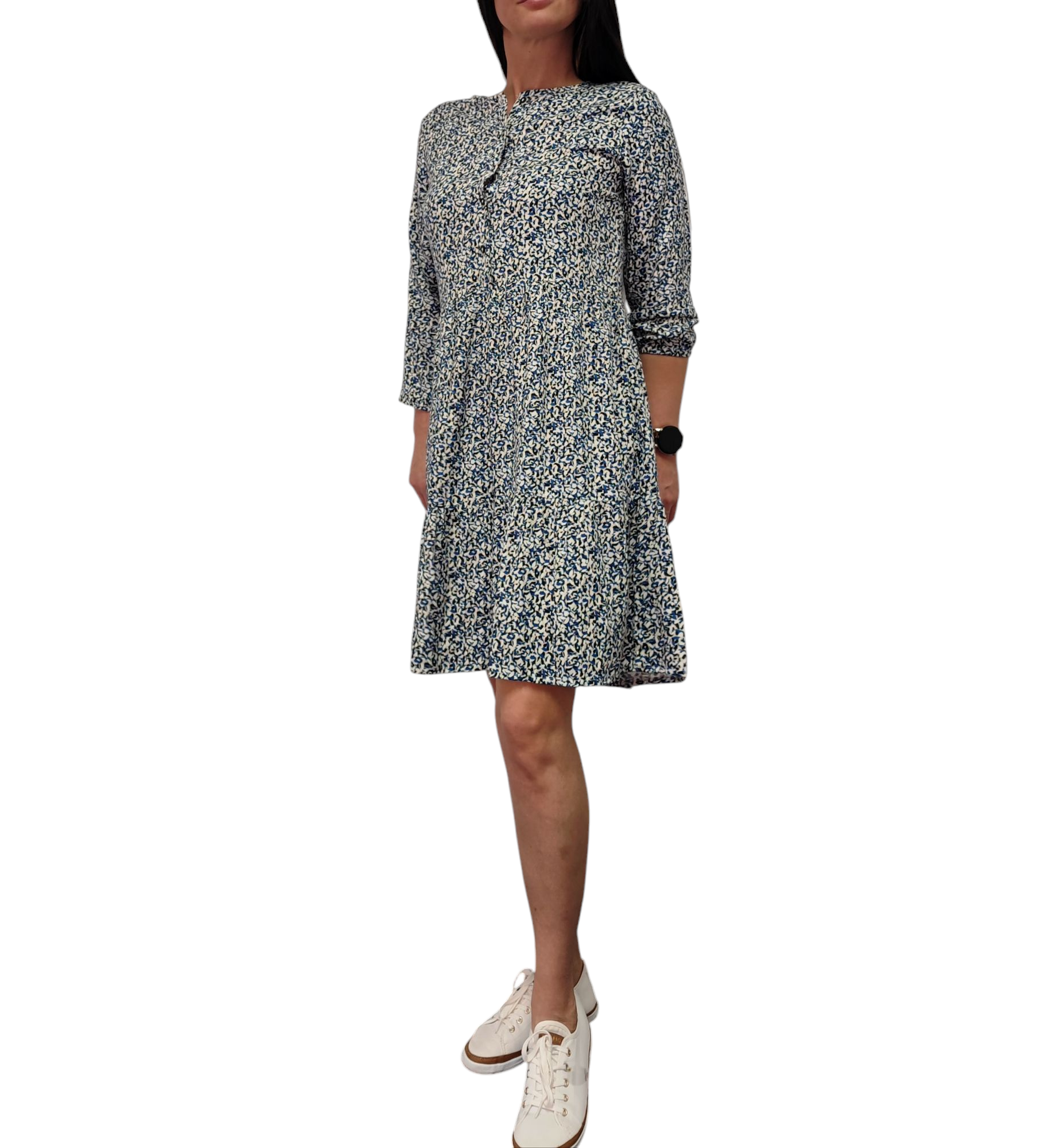 Kolor sukienki jest mieszany: niebieski, biały, kremowy, czarny