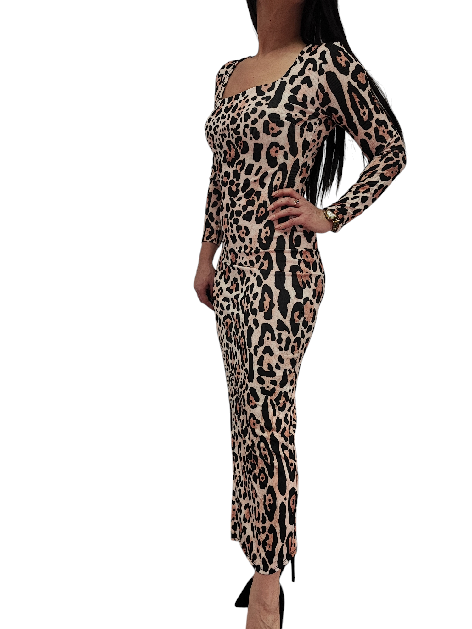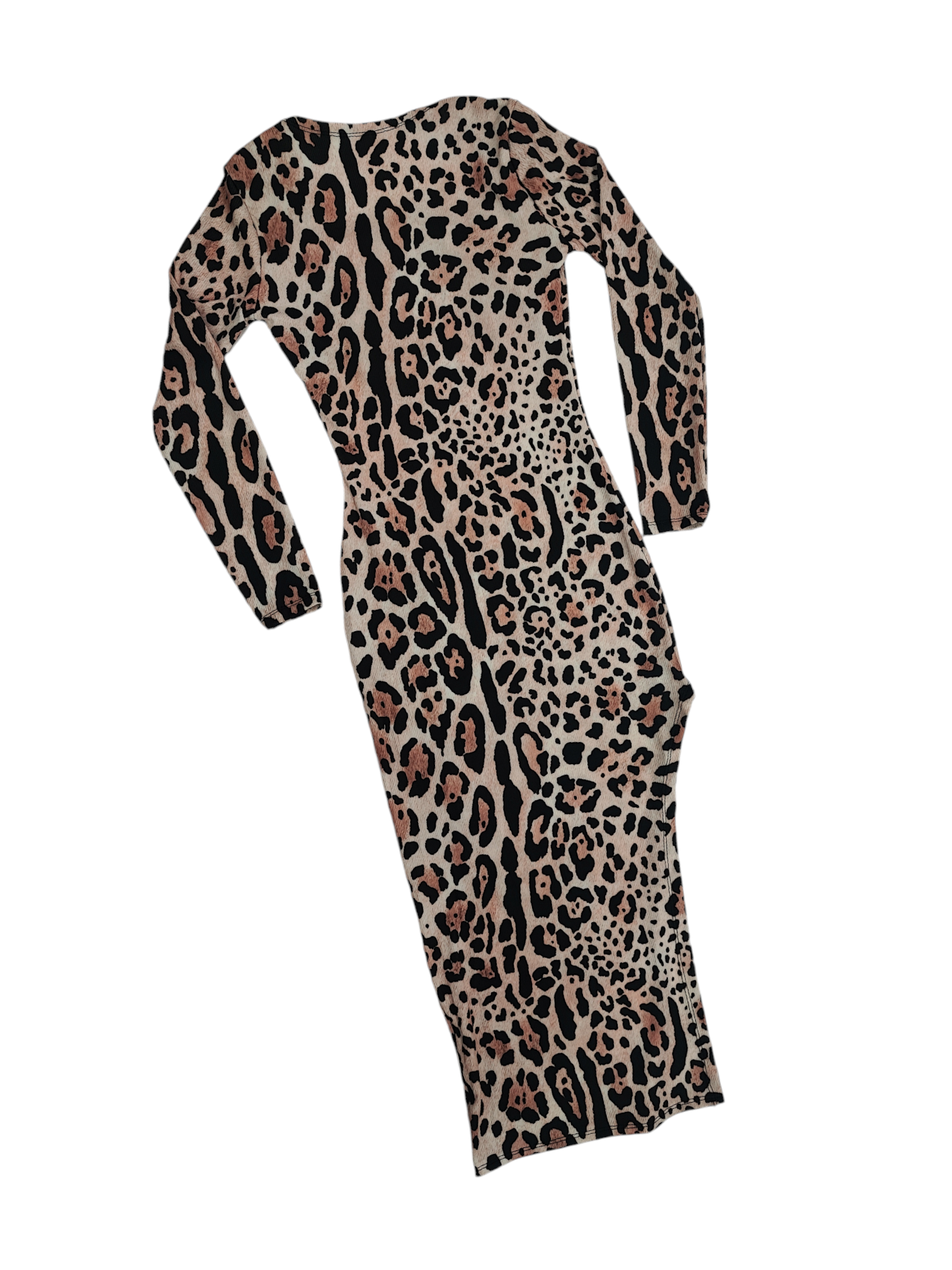 Sukienka Długa z Rozporkiem Długi Rękaw w Panterkę Midi Czarny/Beżowy