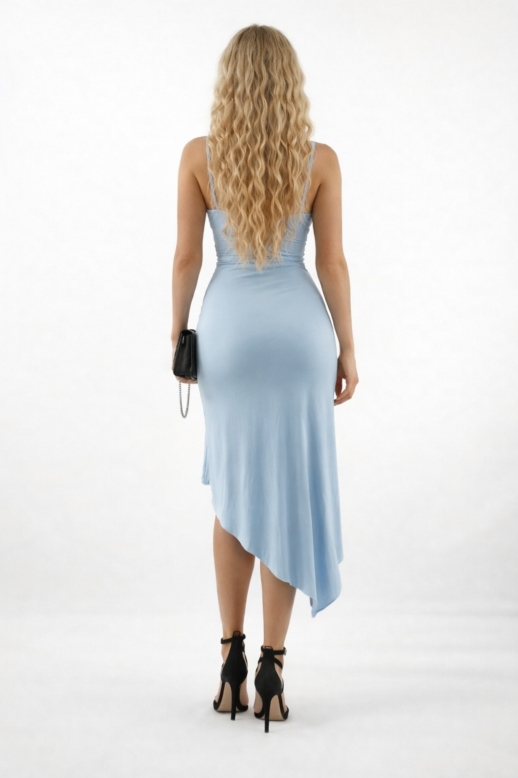 Sukienka Elegancka Asymetryczna na Ramiączkach Wesele Przyjęcie Niebieska