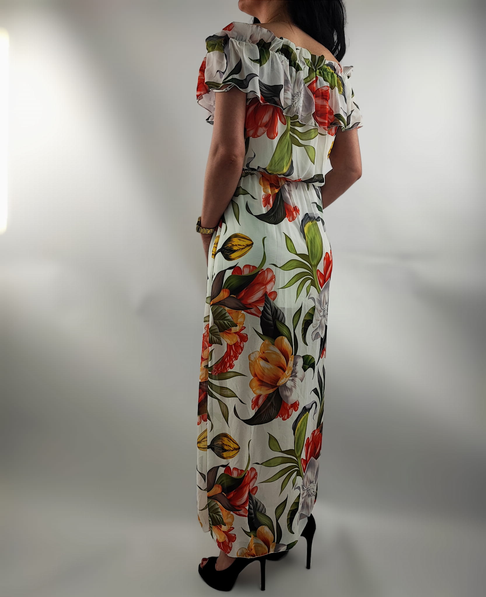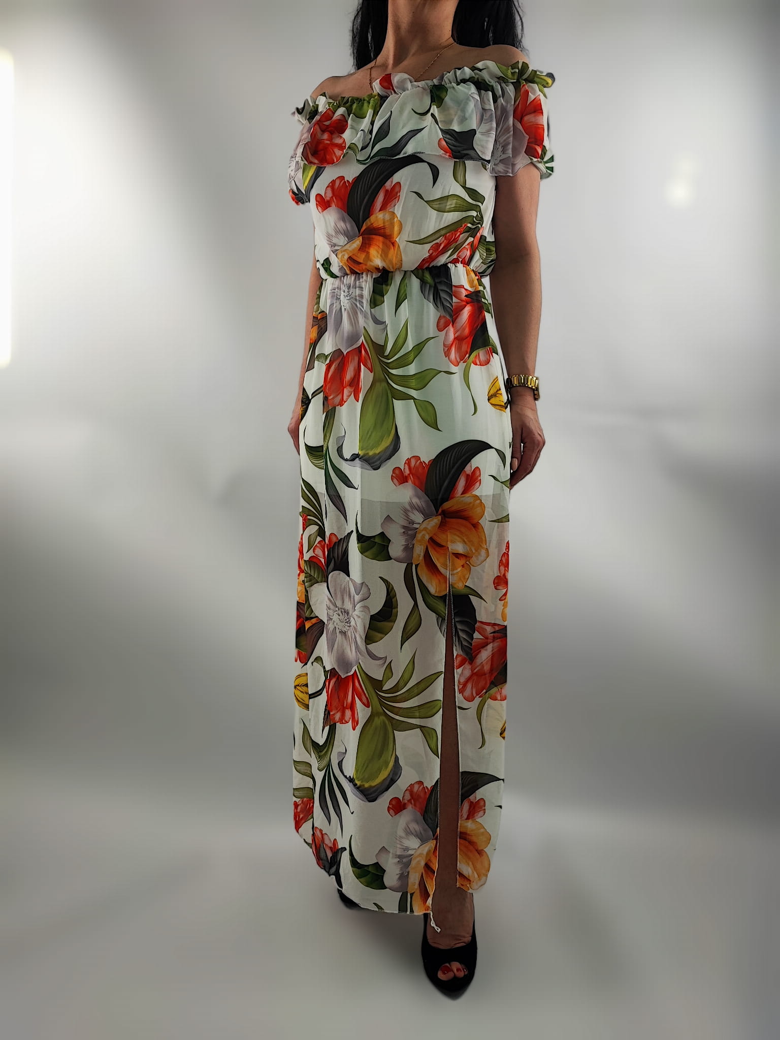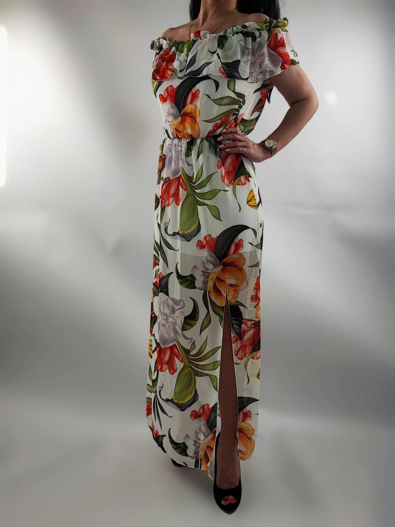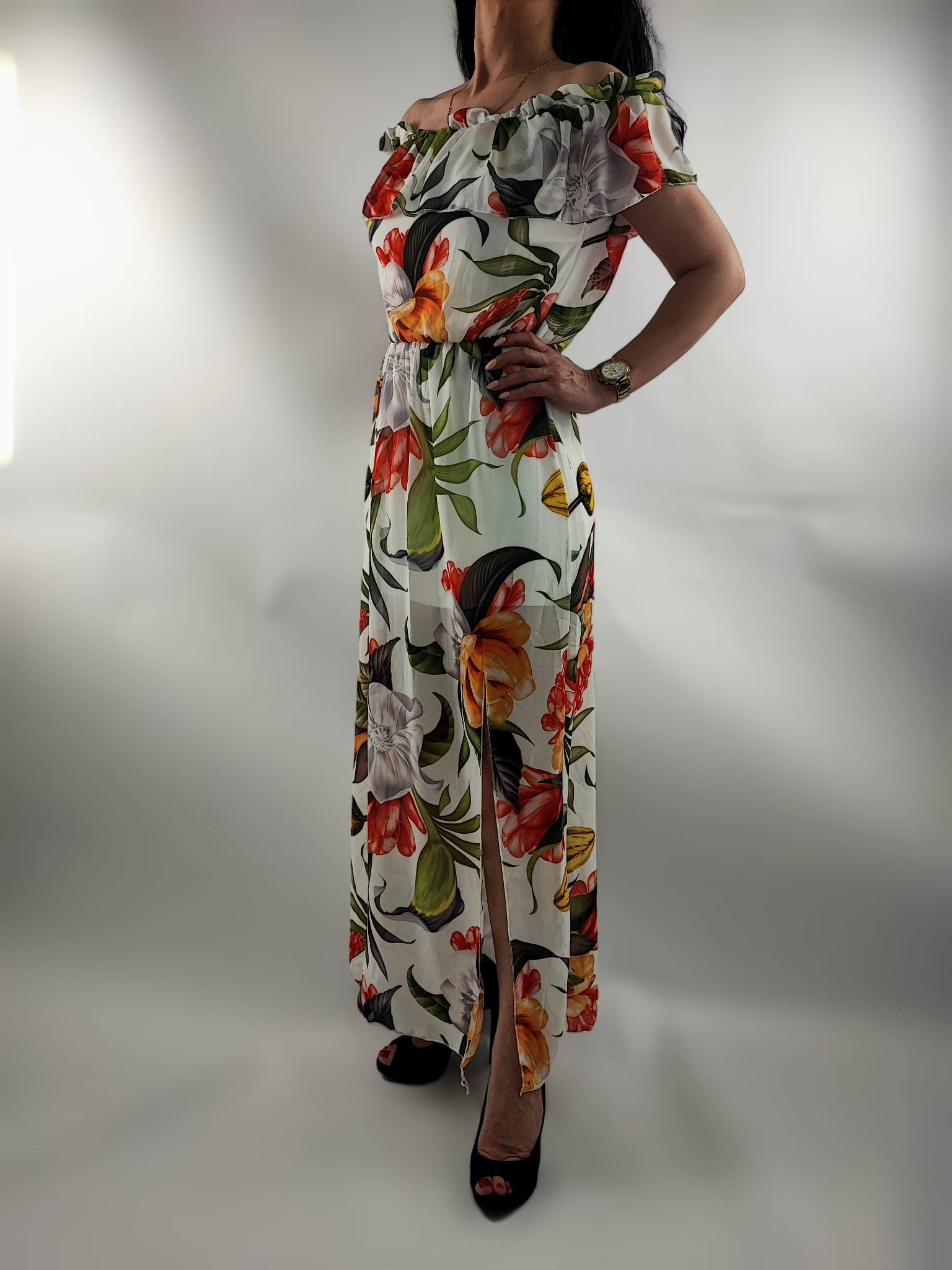 Sukienka Hiszpanka Szyfonowa z Rozporkiem Mix Kwiaty Uniwersalna