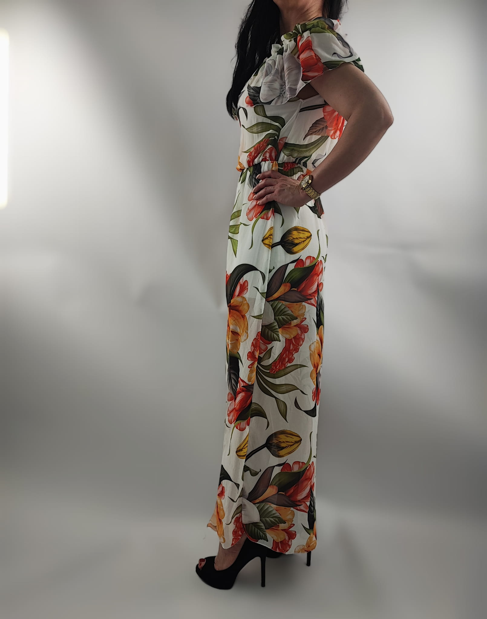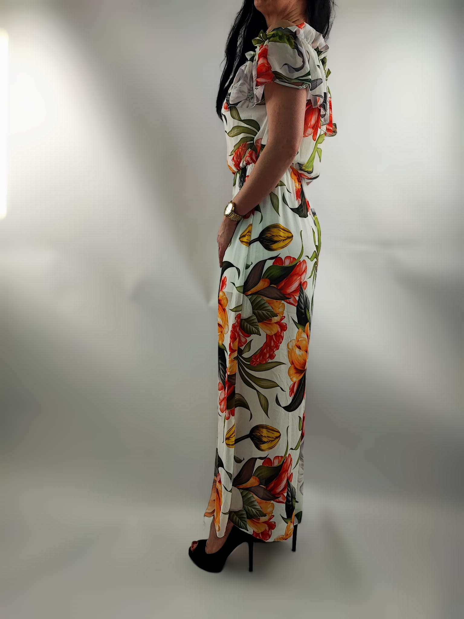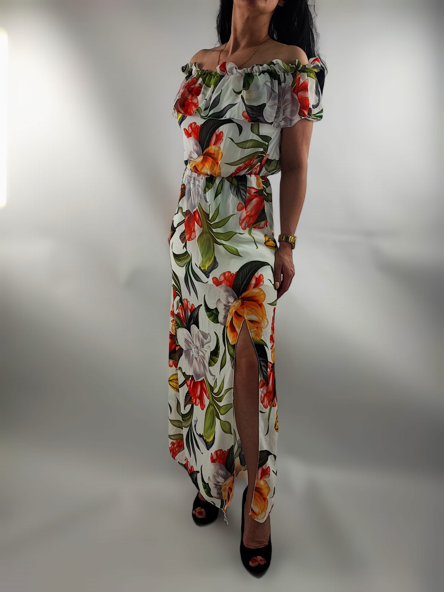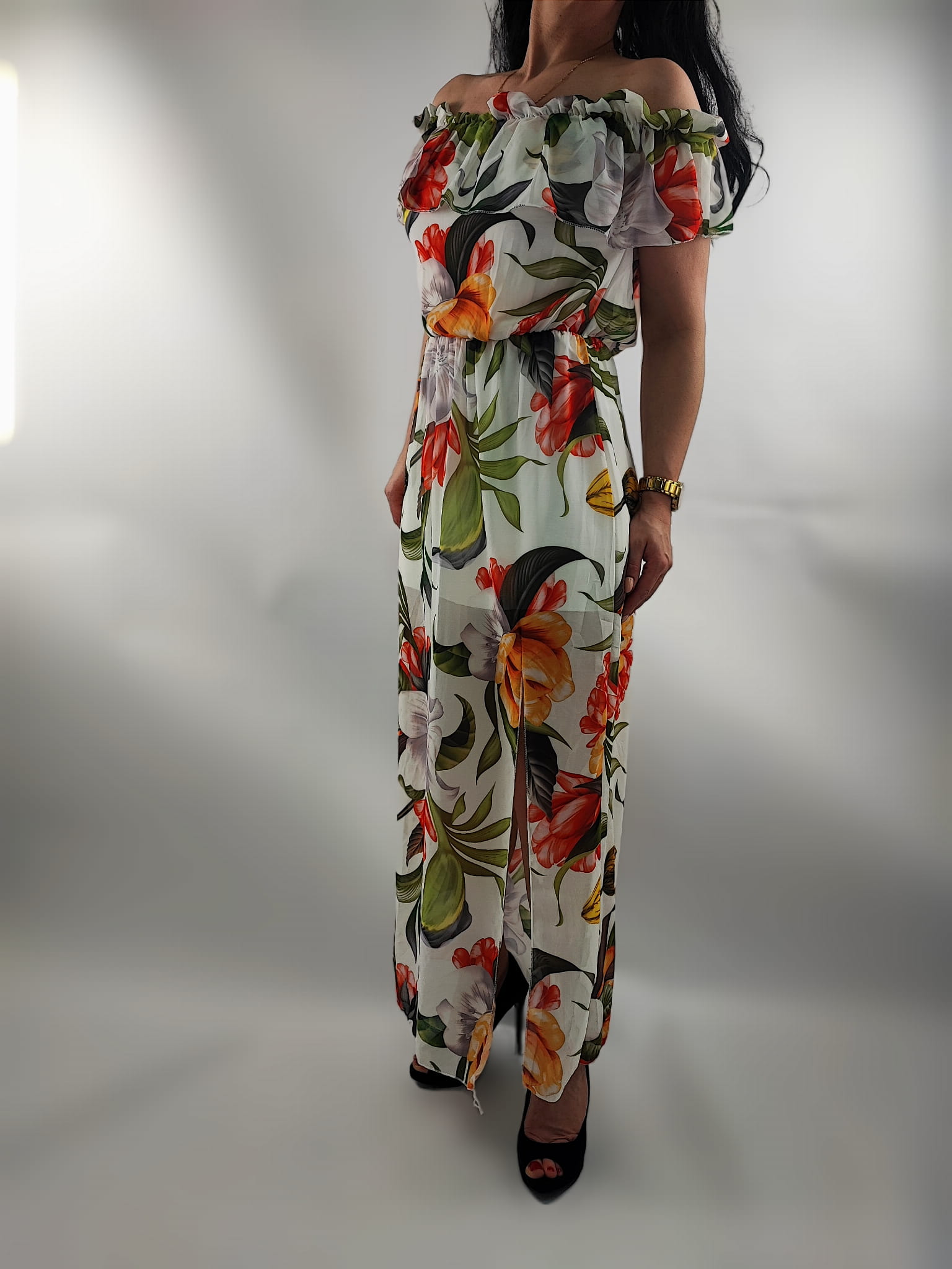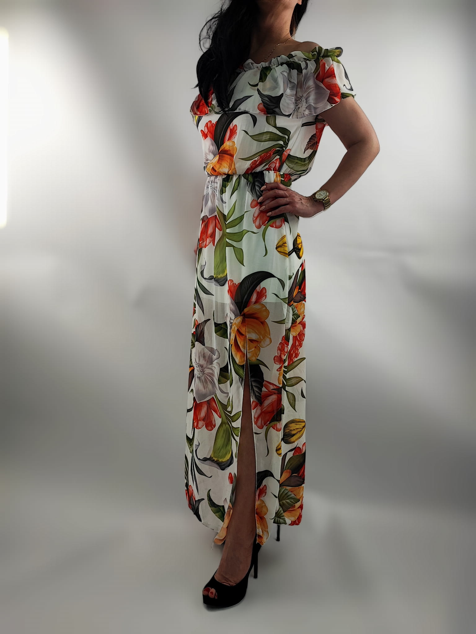 Sukienka Hiszpanka Szyfonowa z Rozporkiem Mix Kwiaty Uniwersalna
