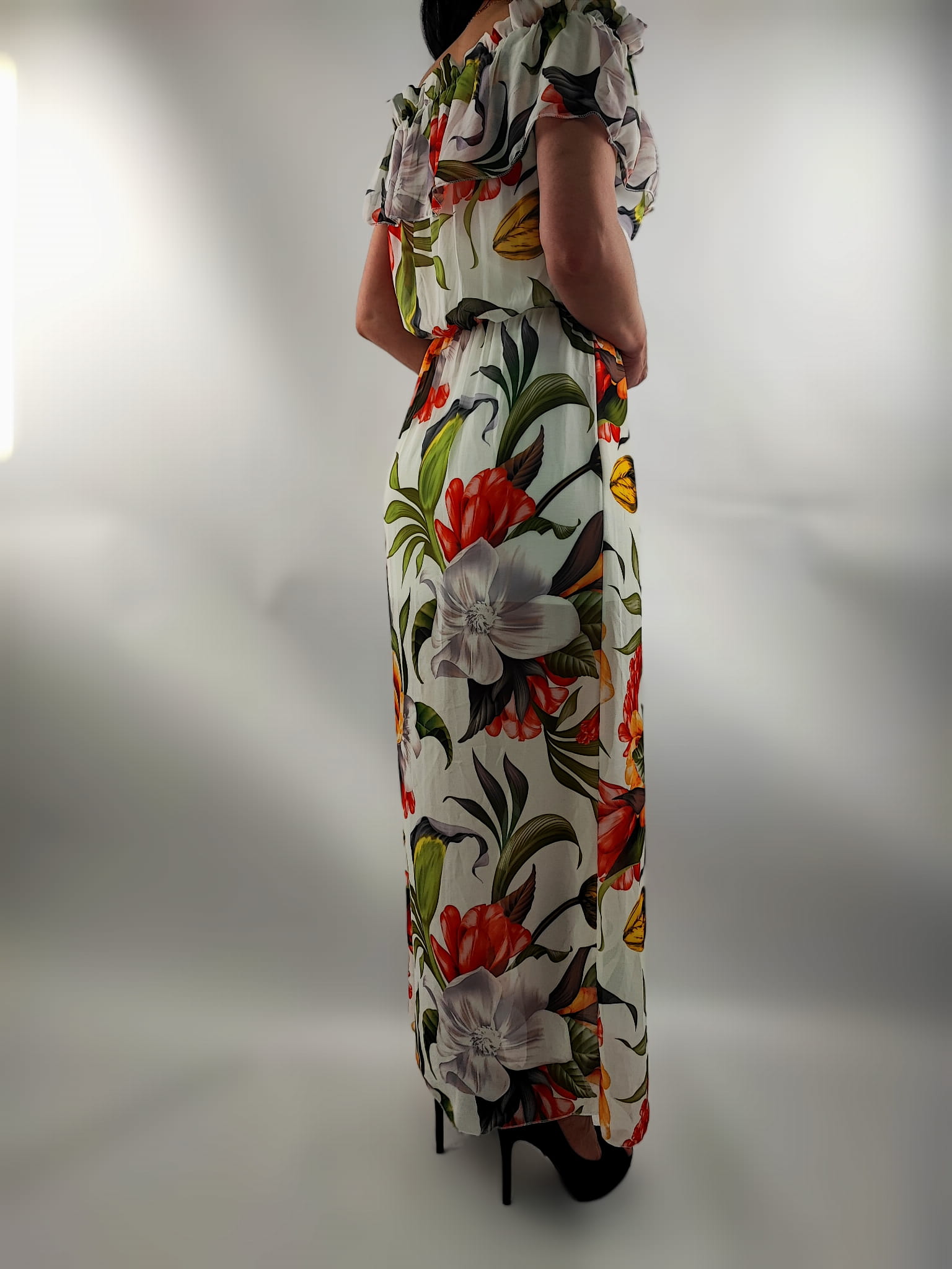 Sukienka posiada wszytą gumkę w górnej cześć falbany na ramionach (dekolt) oraz wszytą gumkę w talii, dzięki czemu przylega do ciała i uwydatnia talię.