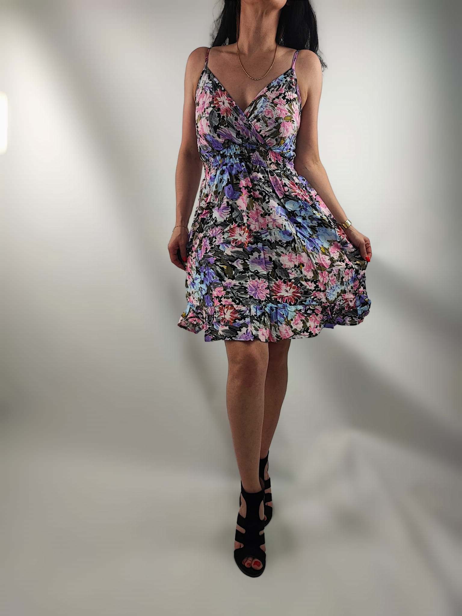 Sukienka jest przewiewna , nie prześwituję. Dekolt kopertowy. Cienkie regulowane ramiączka. Z tyłu sukienki na plecach wszyte małe gumeczki dzięki czemu sukienka przylega i nie odstaje. Z przodu w psie wszyte drobne gumeczki dzięki czemu sukienka przylega do ciała. Dół sukienki wykończony delikatną subtelną falbaną