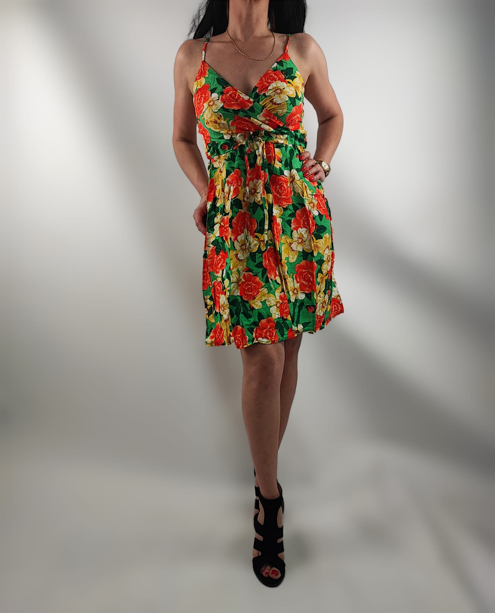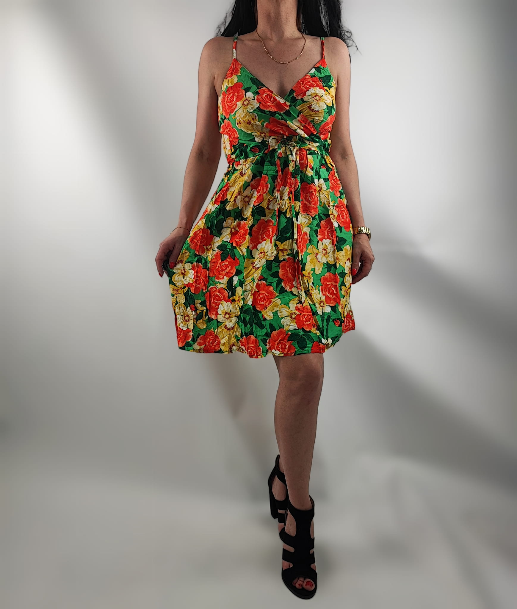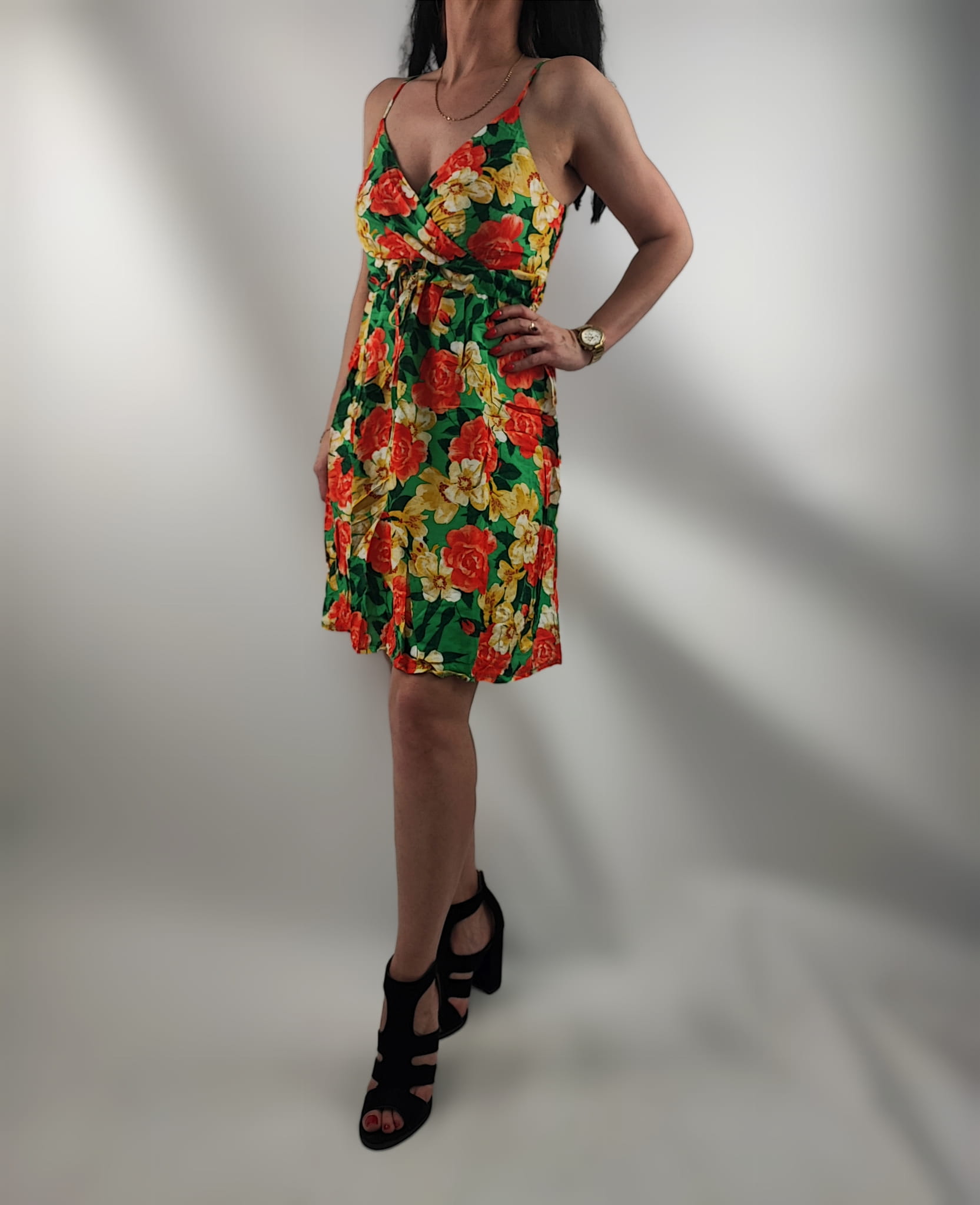 Sukienka jest przewiewna , nie prześwituję. Dekolt kopertowy. Cienkie regulowane ramiączka. Z tyłu sukienki na plecach wszyte małe gumeczki dzięki czemu sukienka przylega i nie odstaje. Z przodu wiązanie w pasie sznureczkami z materiału i w tym samym kolorze co sukienka.