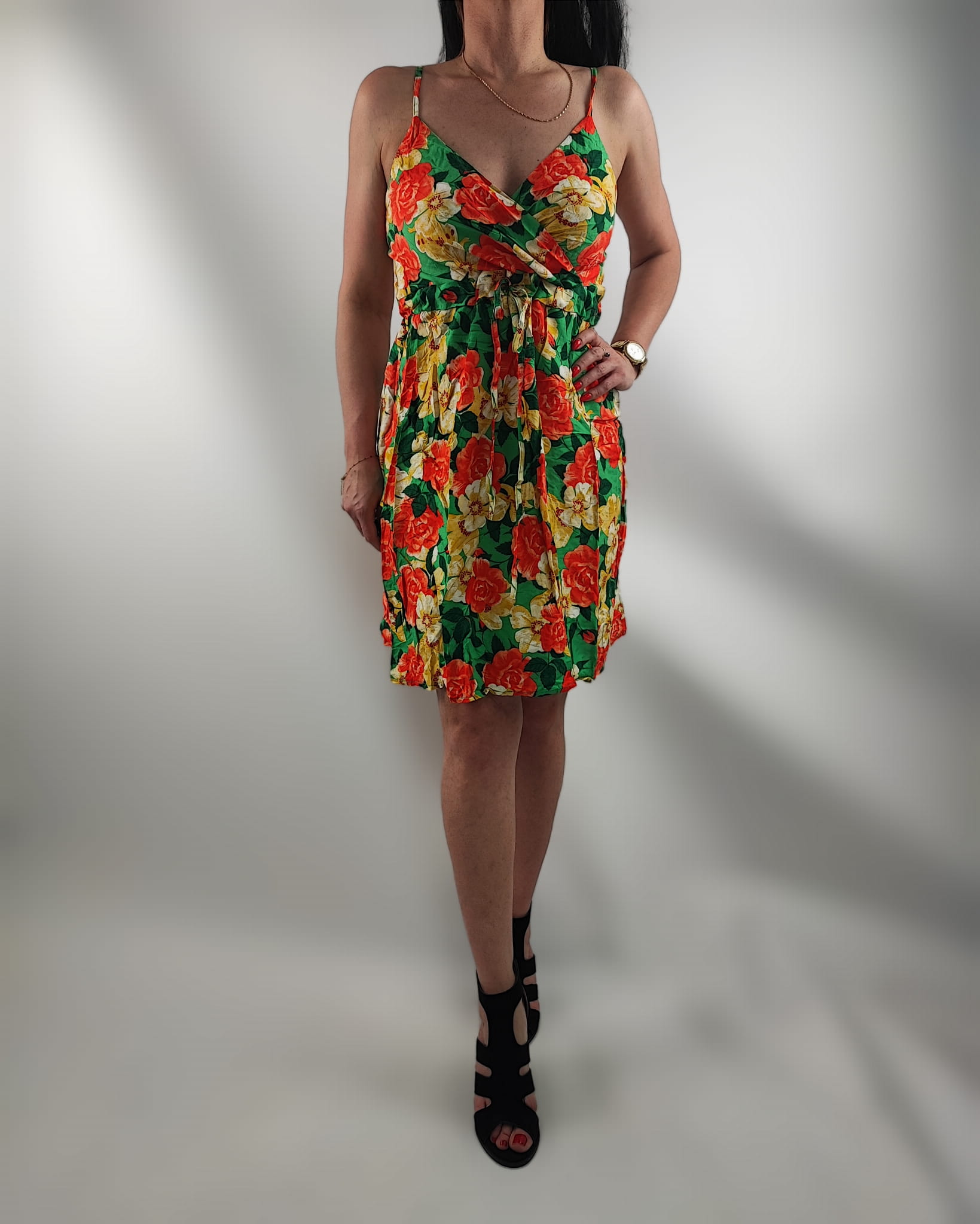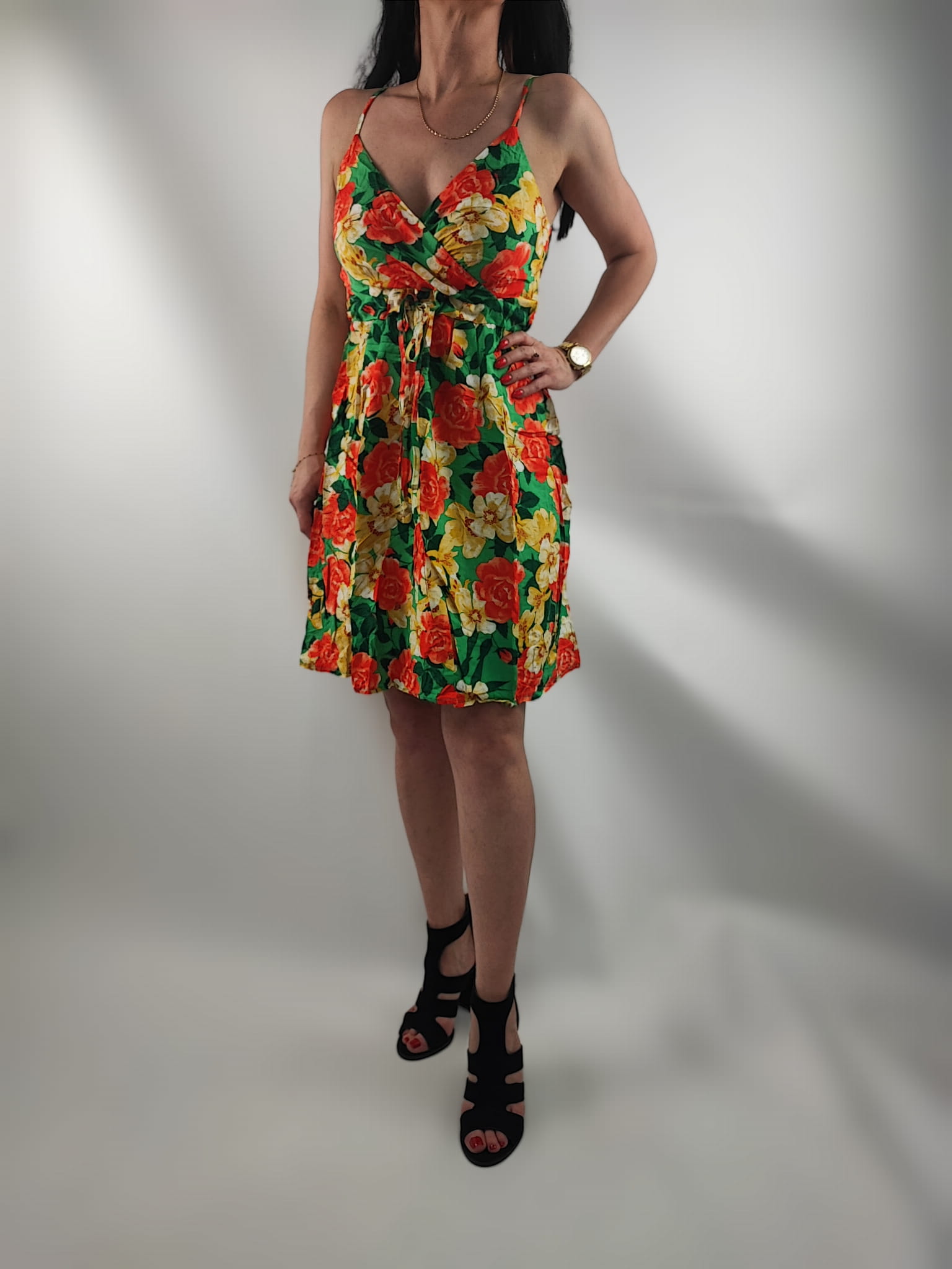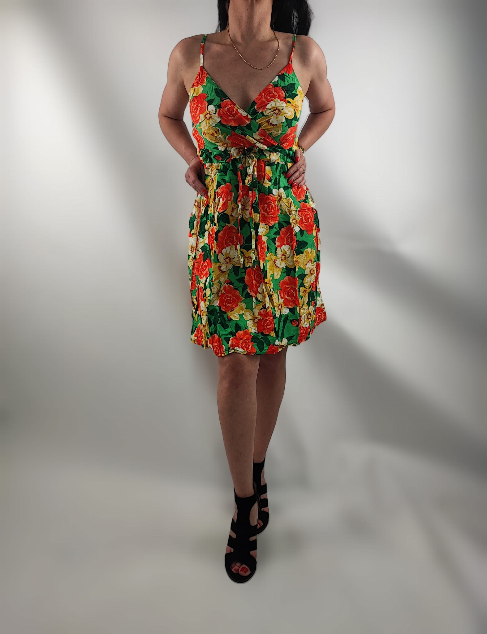 Sukienka jest przewiewna , nie prześwituję. Dekolt kopertowy. Cienkie regulowane ramiączka. Z tyłu sukienki na plecach wszyte małe gumeczki dzięki czemu sukienka przylega i nie odstaje. Z przodu wiązanie w pasie sznureczkami z materiału i w tym samym kolorze co sukienka.