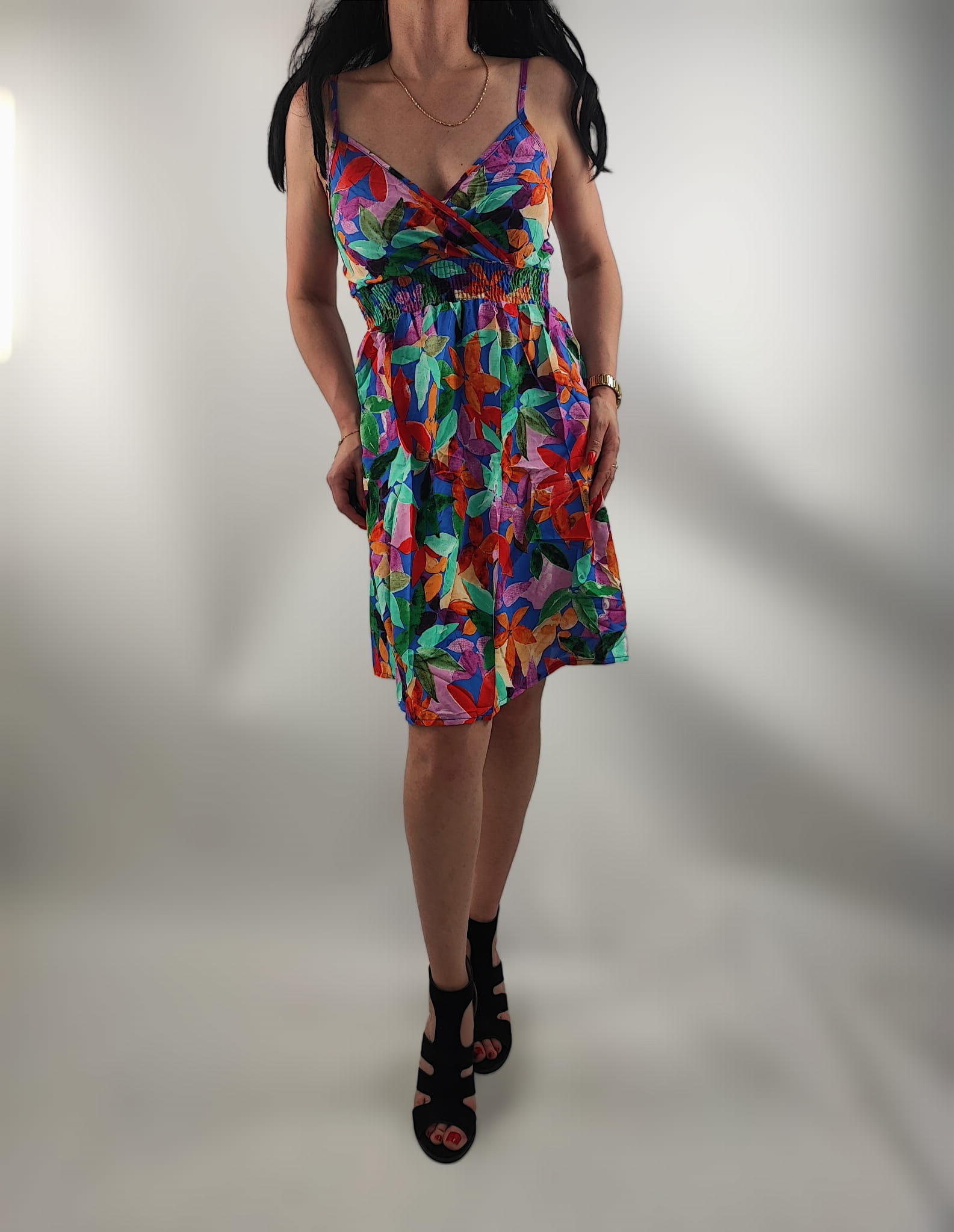 Sukienka jest przewiewna , nie prześwituję. Dekolt kopertowy. Cienkie regulowane ramiączka. Z tyłu sukienki na plecach wszyte małe gumeczki dzięki czemu sukienka przylega i nie odstaje. Z przodu w pasie wszyte drobne gumeczki dzięki czemu sukienka przylega do ciała.