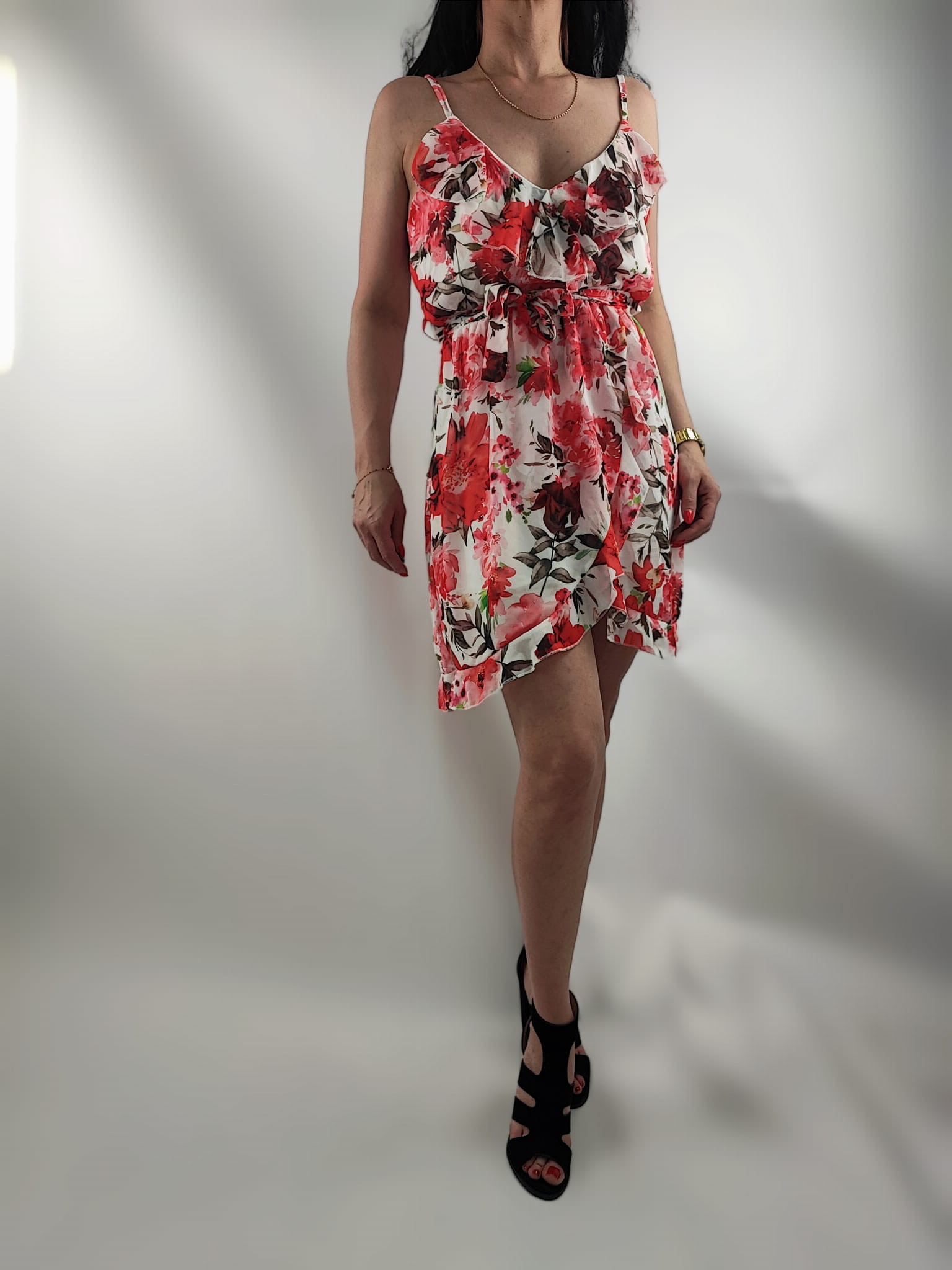Sukienka Szyfonowa Falbana Cienkie Ramiączka Czerwone Kwiaty Biały Uni.S/M/L