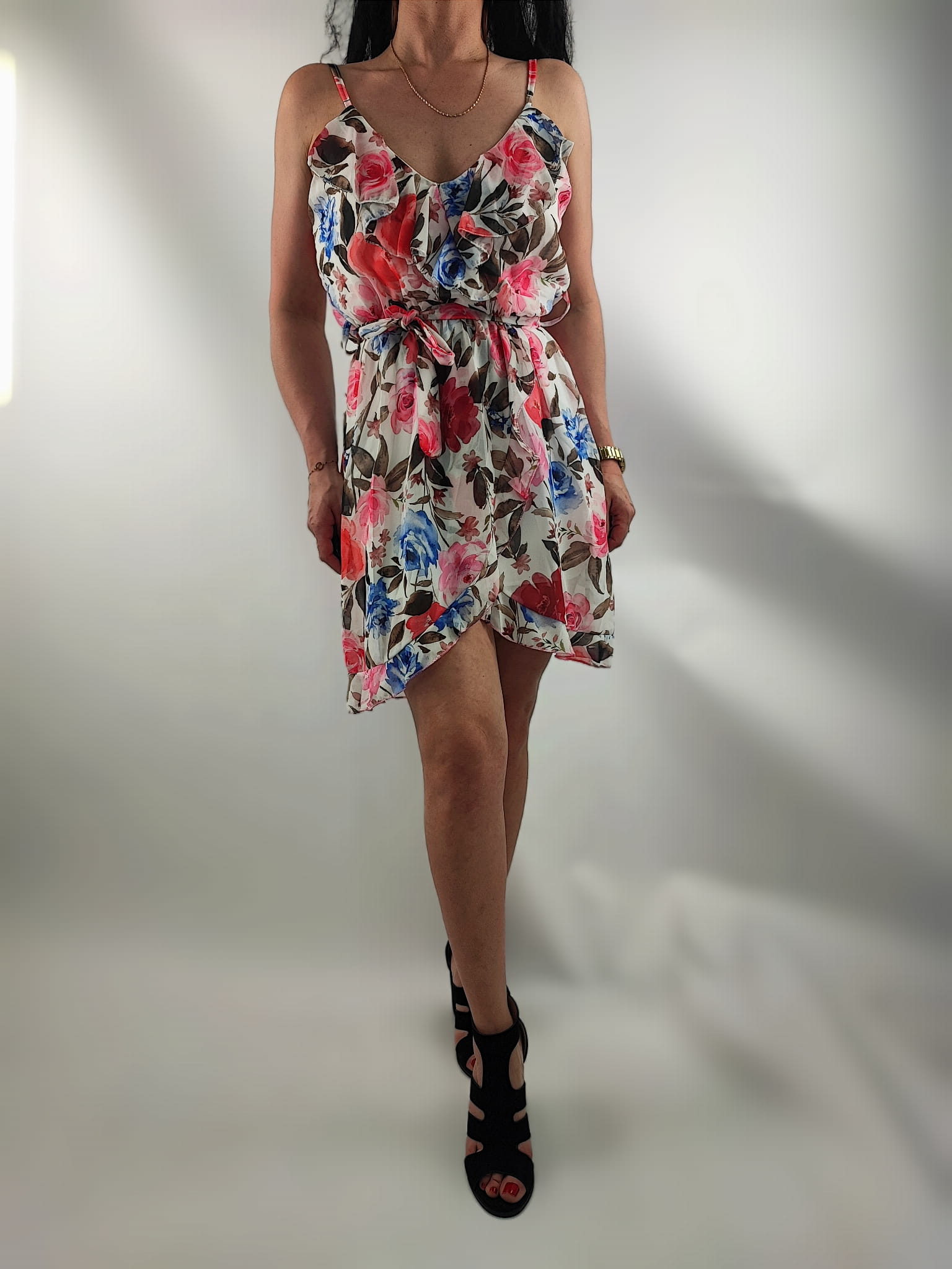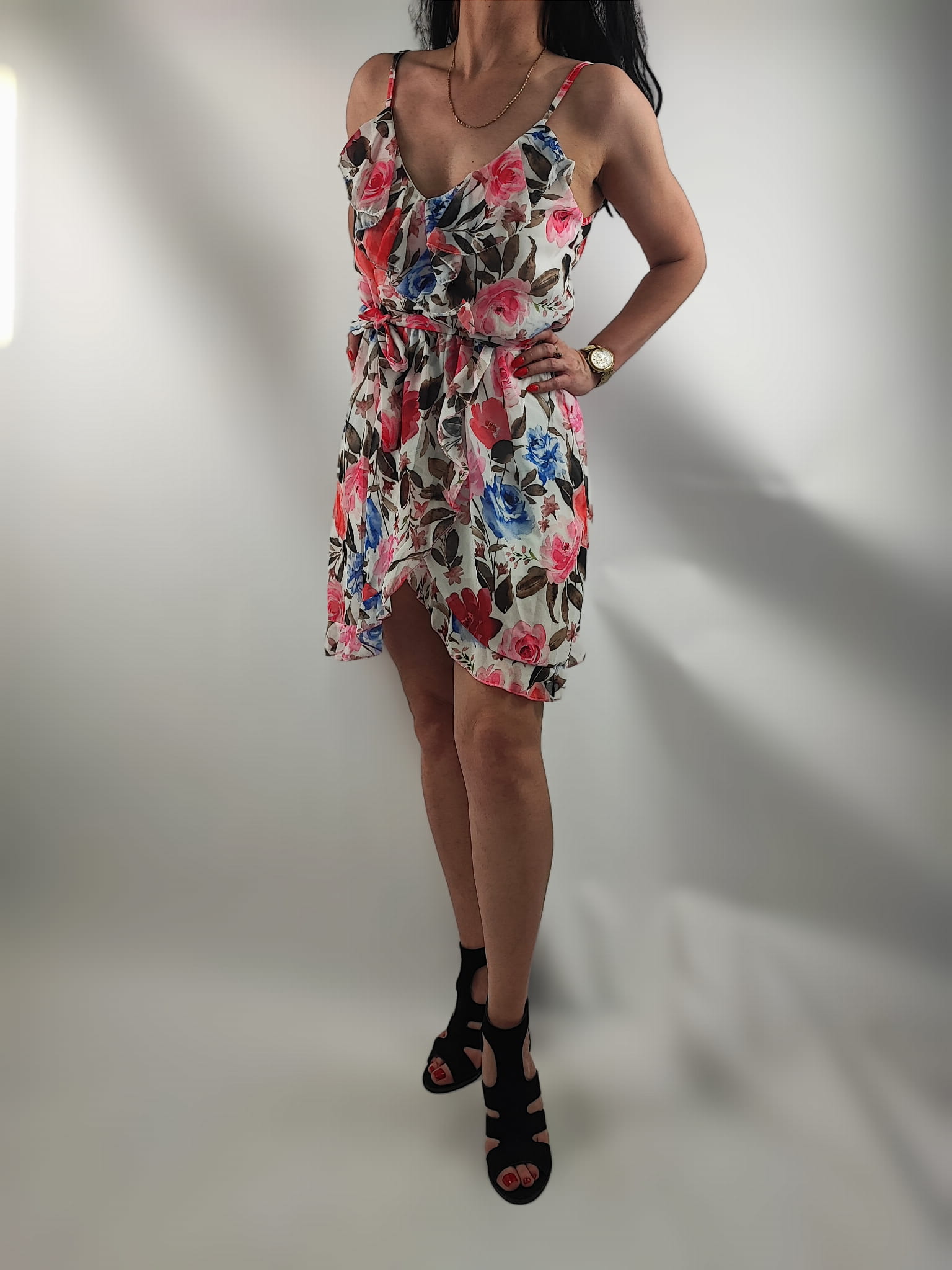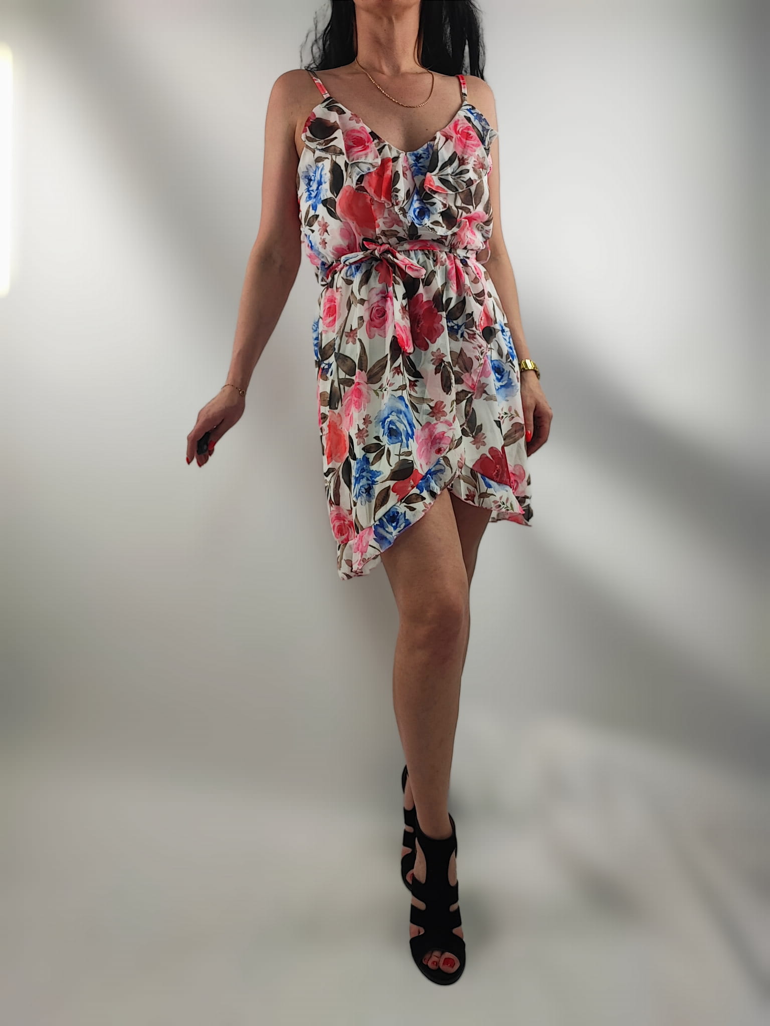 Sukienka Szyfonowa Falbana Cienkie Ramiączka Mix Kwiaty Biały Uni.S/M/L