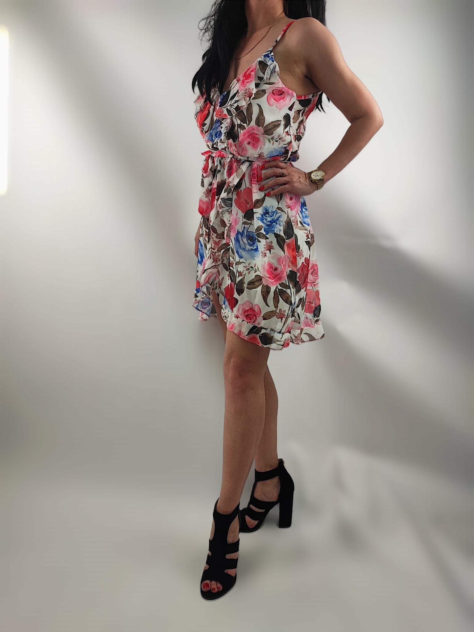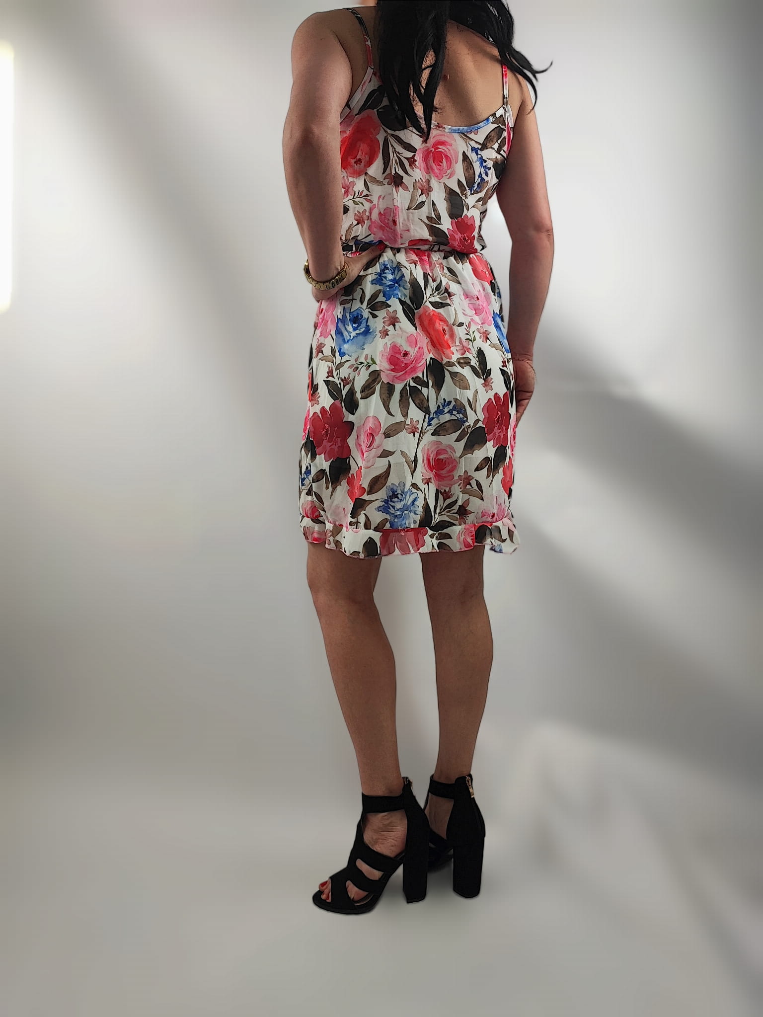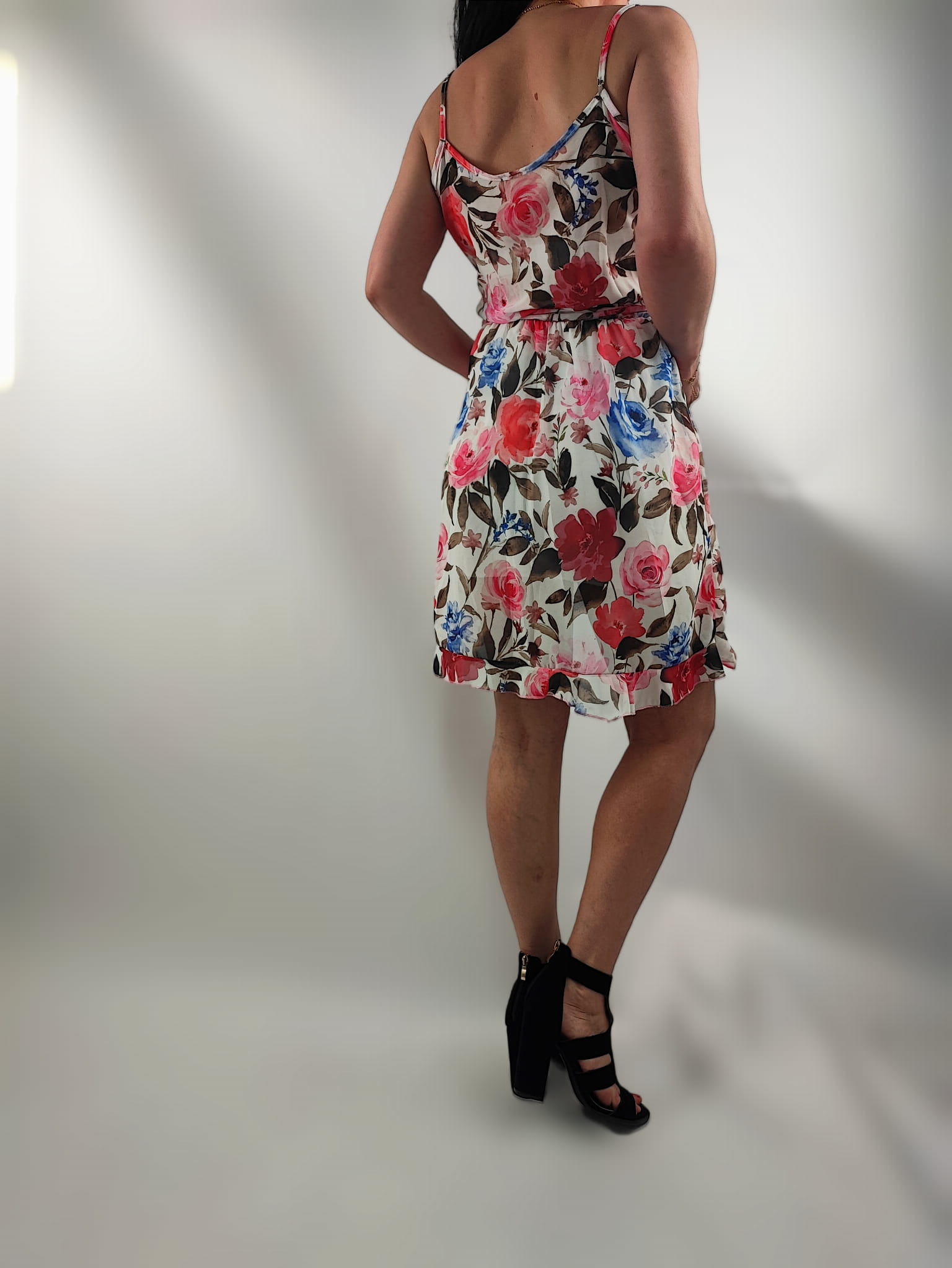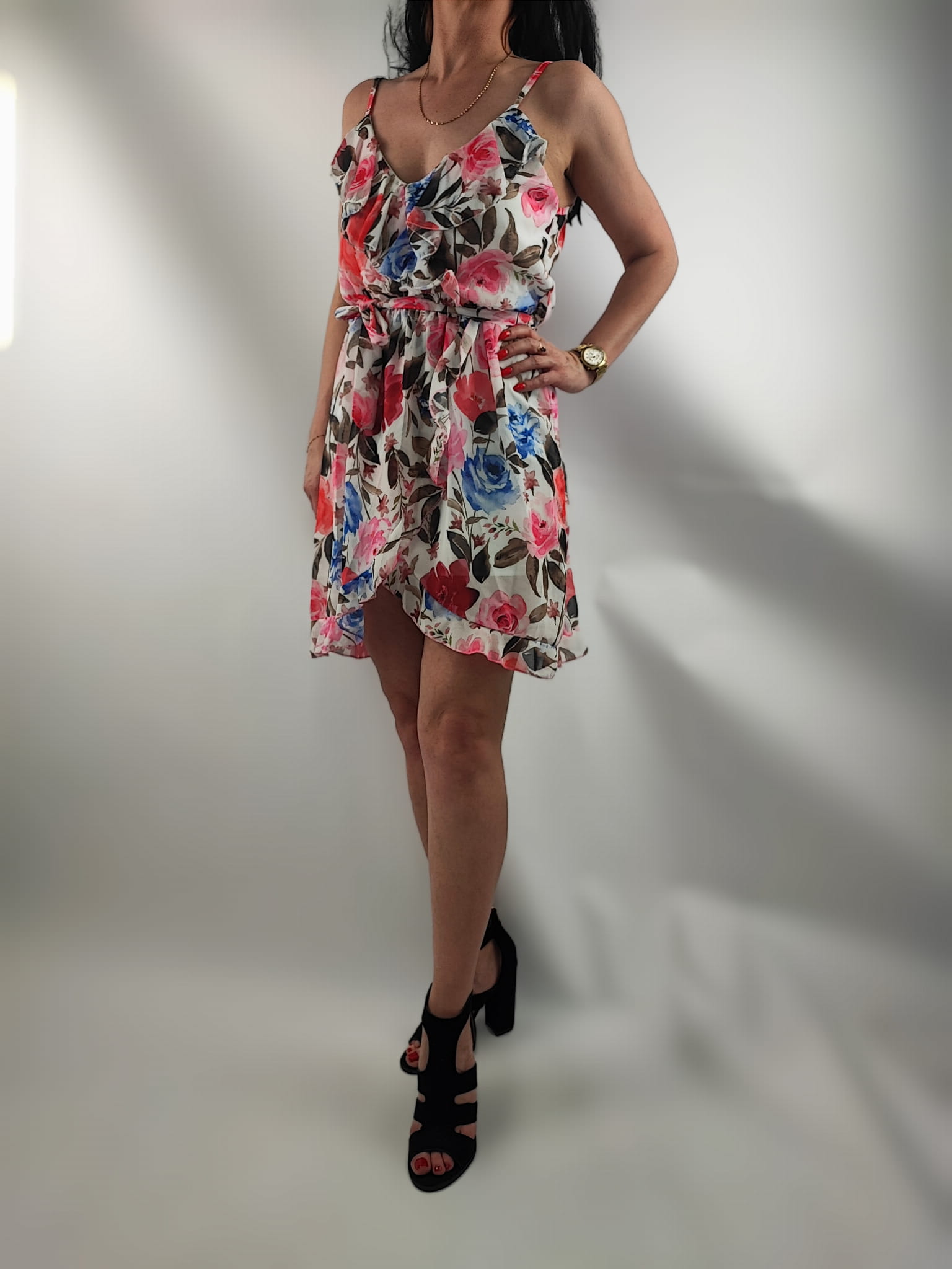 Sukienka Szyfonowa Falbana Cienkie Ramiączka Mix Kwiaty Biały Uni.S/M/L