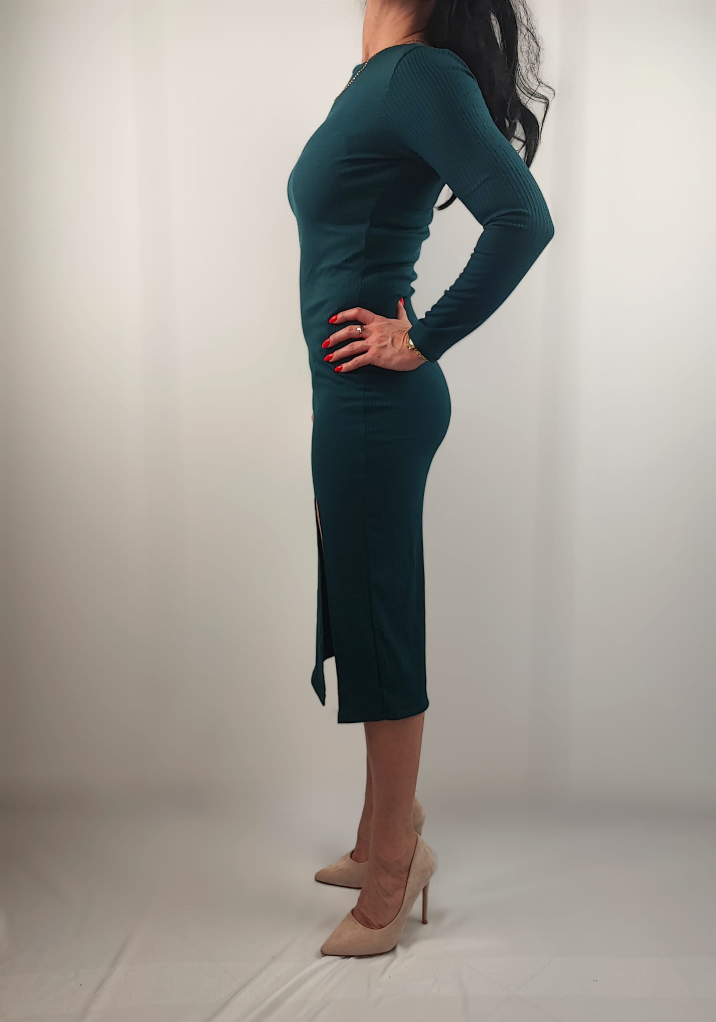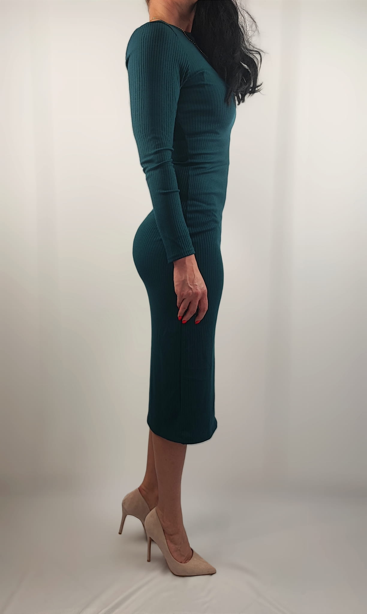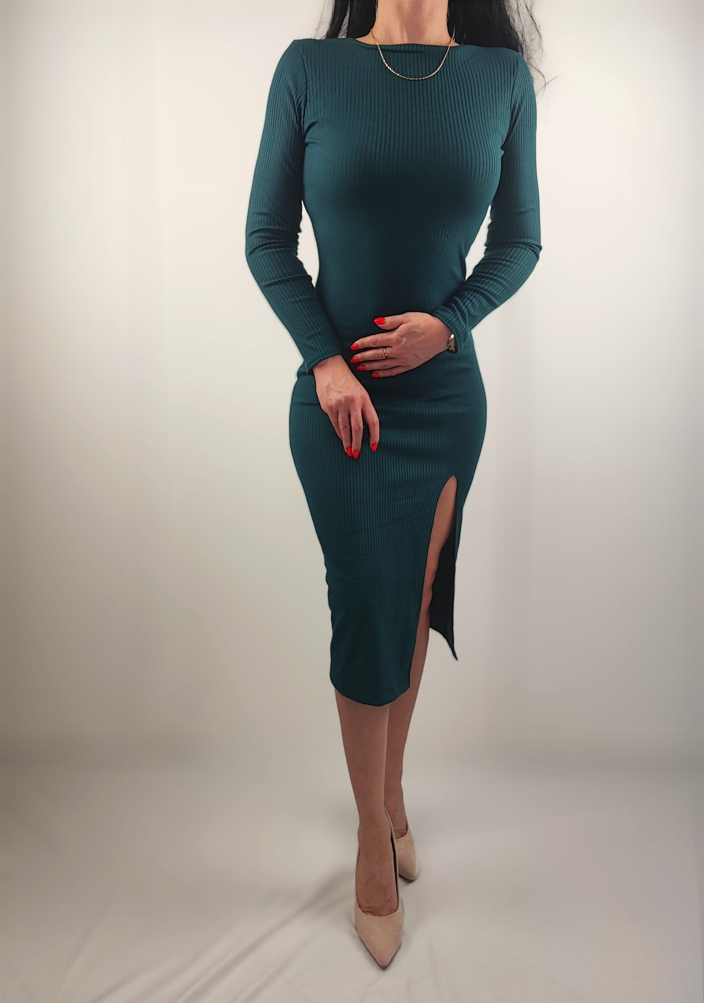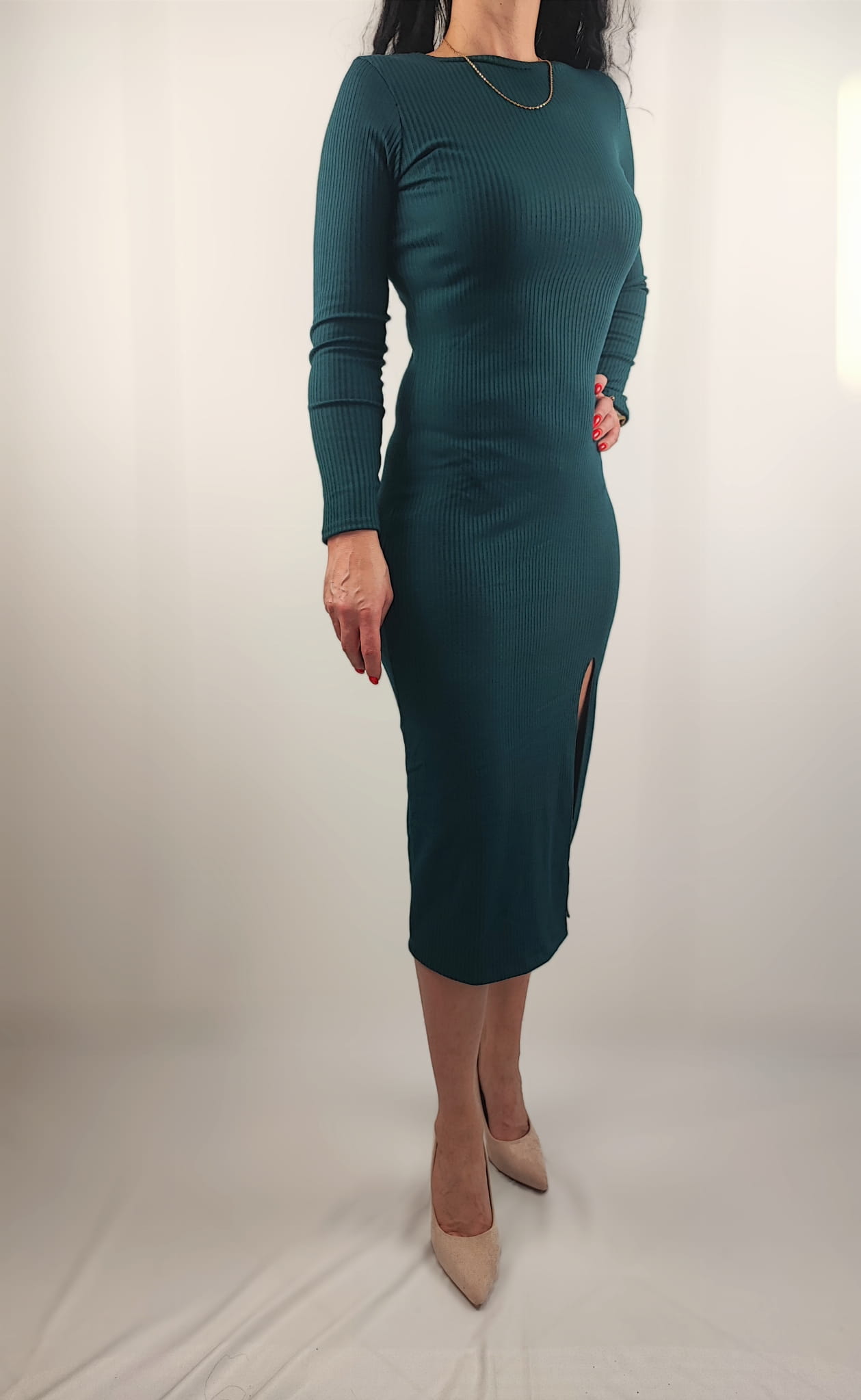 Dopasowana sukienka podkreśla atuty każdej sylwetki. Sukienka w całości z materiału prążkowanego, nie prześwituje. Długi rękaw