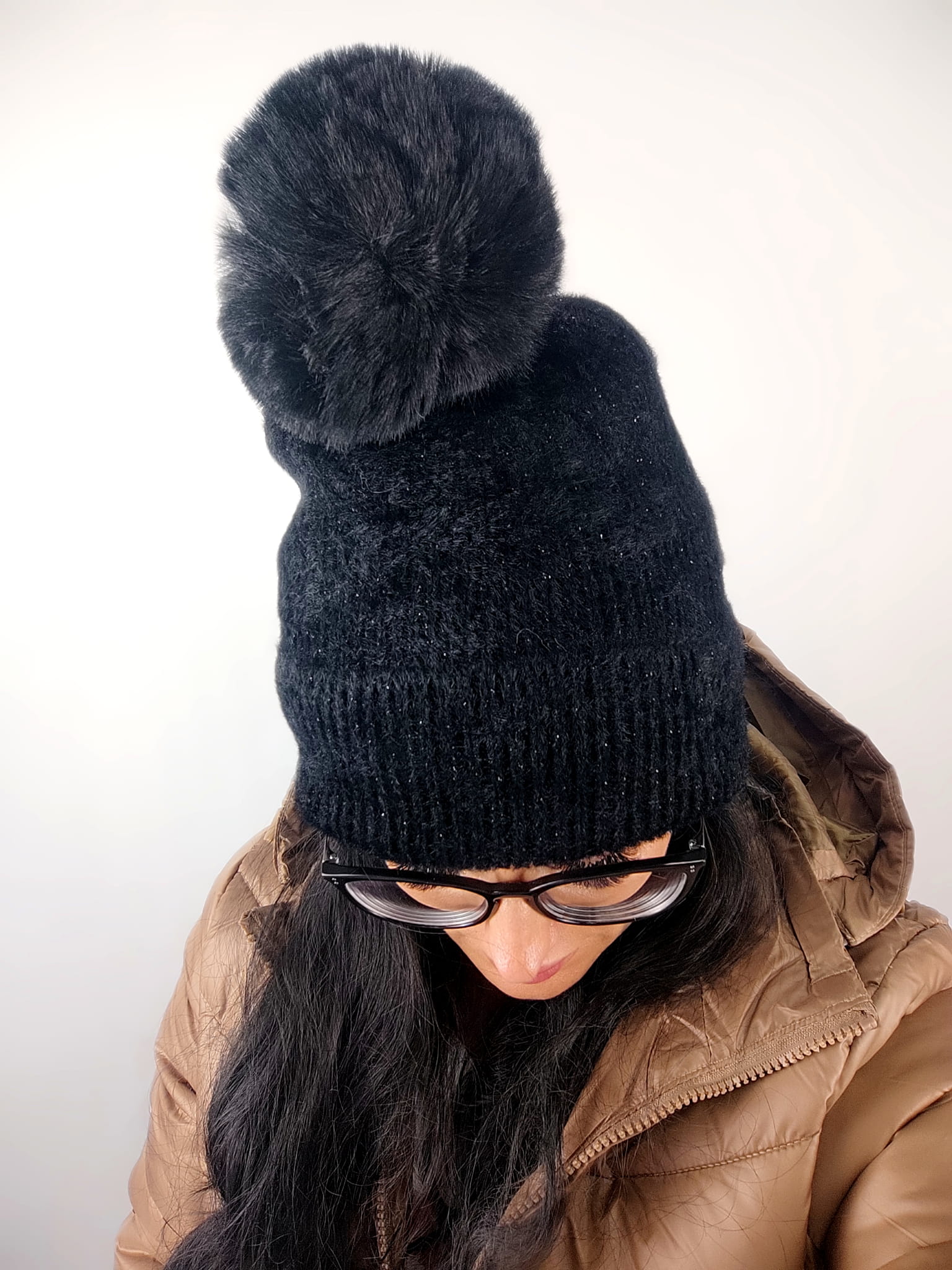 Czapka z pomponem z dodatkiem srebrnej delikatnej nitki. Wykonana jest z ciepłego i przyjemnego w dotyku materiału tzw. ALPAKA touch, wywijana na zewnątrz co umożliwia regulacje jej długości . Od środka ocieplana miłym i ciepłym polarem. Bardzo wygodna i ciepła . Dodatek w postaci błyszczącej nitki jest bardzo delikatny, jest mało widoczny, sprawia , że tylko delikatnie się mieni. Występuje w różnych kolorach