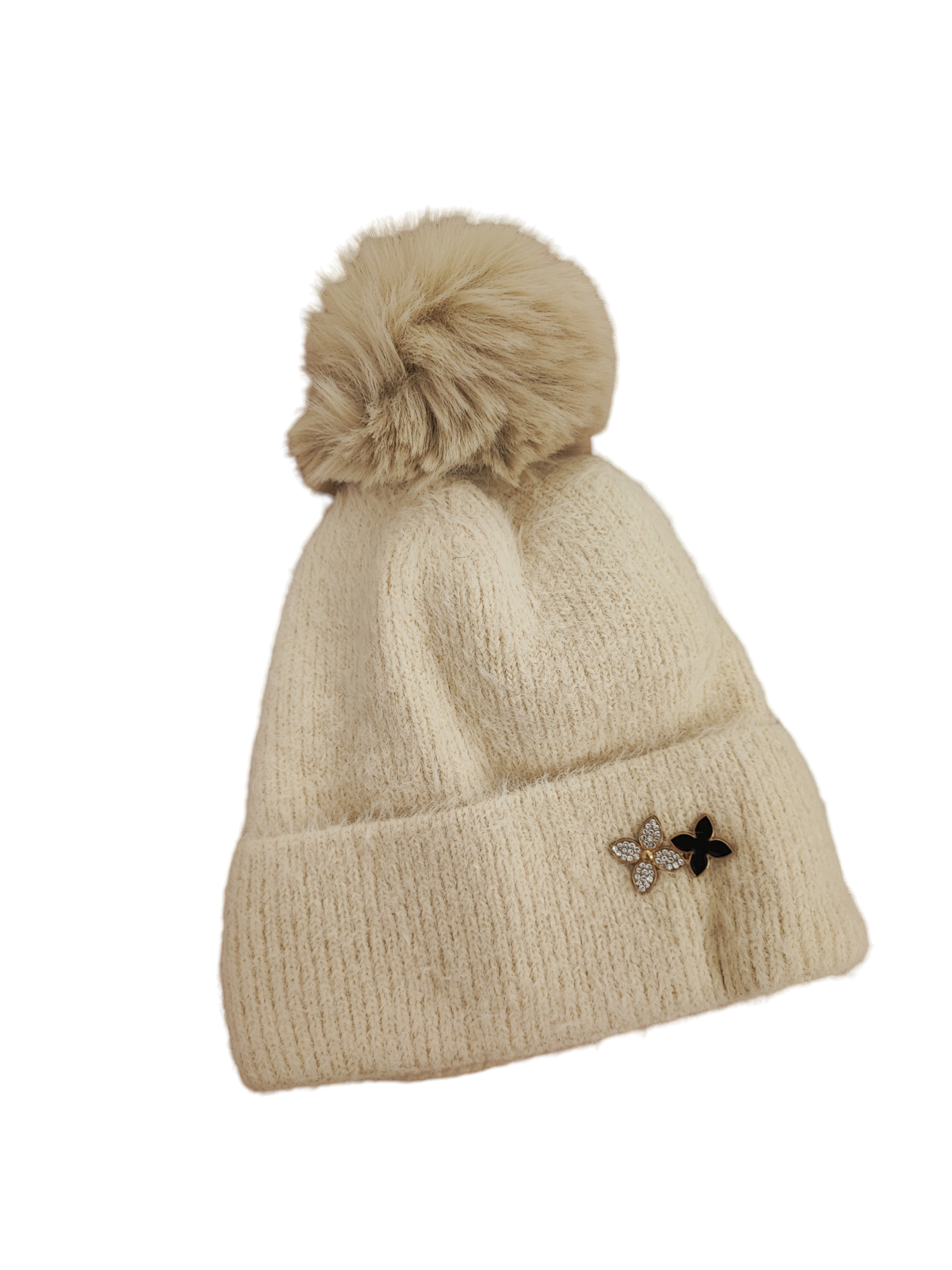 Czapka z pomponem na polarze z piękną ozdobną broszką w komplecie (broszka odpinana)